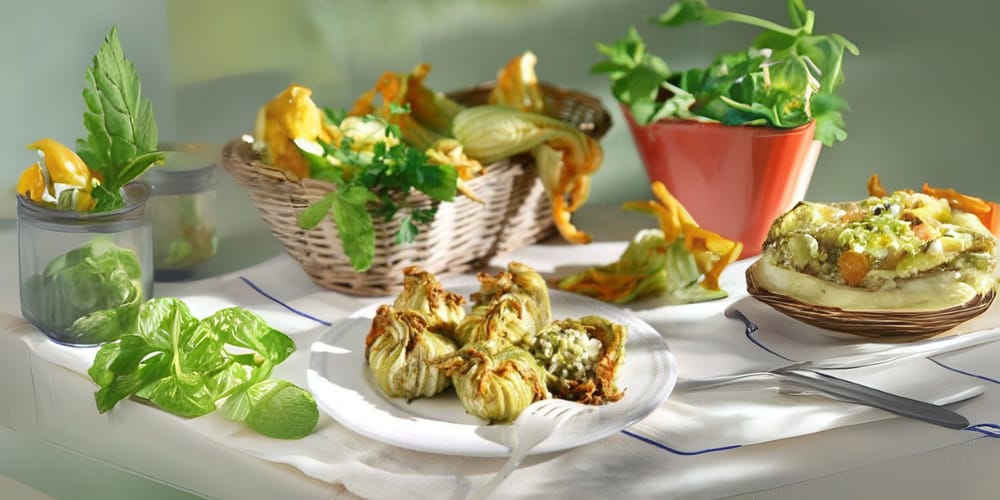 Zucchini flowers are harvested at dawn — within a few hours, they wilt and lose their delicate shape. They are stuffed with soft cheese (anthotyros, mizithra), fresh herbs, or rice with mint, then gently fried or baked. A disappearing dish — found only in spring, in traditional village tavernas.