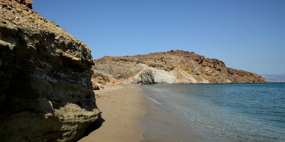 Next to the long beach of Molos, there is a small beach of Kalogeros. The cliffs make the landscape unique. Its characteristic is the special color of the sand, due to the clay rocks of the area. Many visitors smear themselves with clay, go sunbathing, and then wash it off in the sea. The beach is not organized, so make sure you bring everything you need.