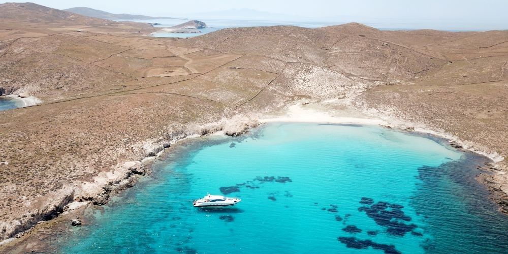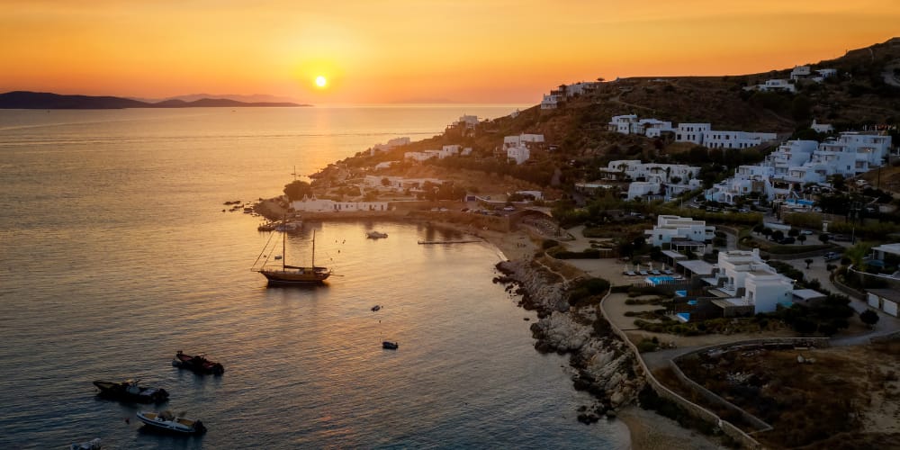 The main feature of this village is the small, sheltered harbor where fishing boats and luxury yachts dock. In Ornos you can rent a skippered yacht as well as a small motorboat and sail around the island on your own.