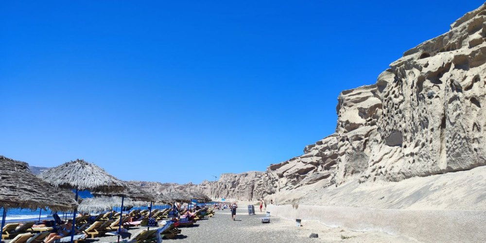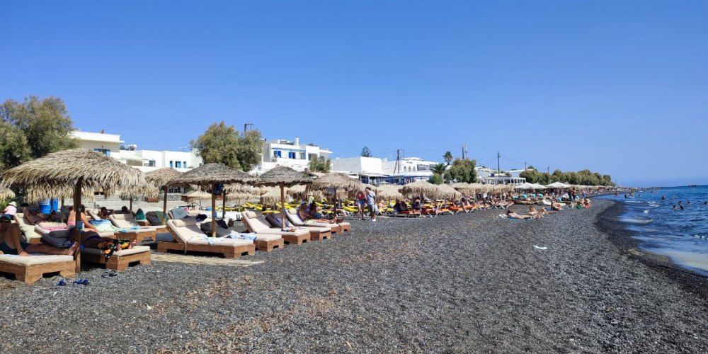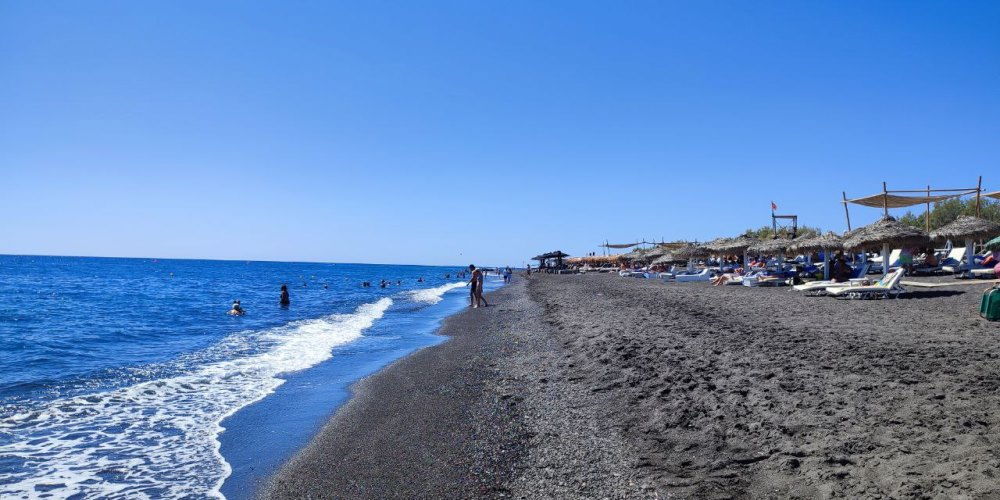 Perivolos is a popular beach resort located on the southern coast of Santorini, serving as an extension of Perissa Beach. This beach, with its soft black volcanic sand and crystal-clear waters, stretches for 2 km and is known for its relaxed atmosphere. Perivolos attracts both those who enjoy peaceful relaxation and those looking for active seaside entertainment. The beach offers excellent amenities: stylish beach clubs, cafes, and restaurants provide a variety of dishes, cocktails, and comfortable lounge areas.