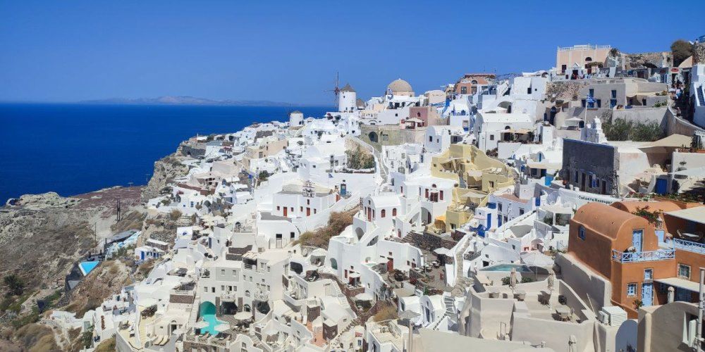 Oia is the most picturesque village in Santorini with a unique atmosphere. Located in the northwestern part of the island, it rises 200 meters above sea level. Here you will find white-washed houses and churches with blue roofs, winding marble streets, and windmills. Walking through its streets, you get the impression that you are in a fairy tale movie.