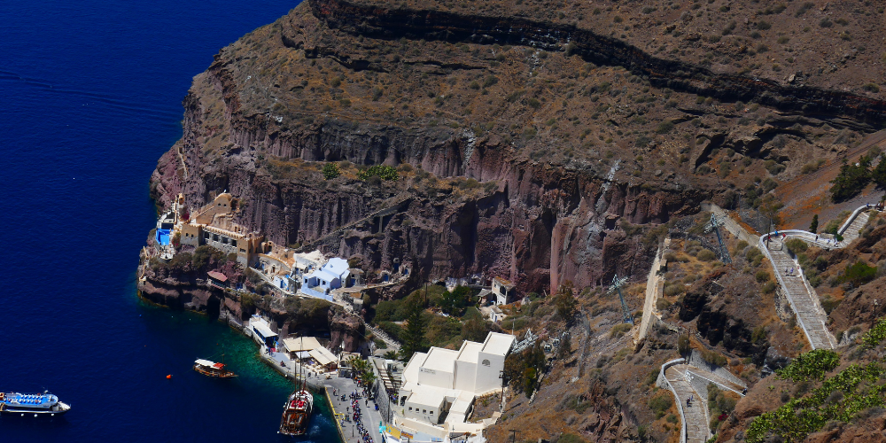 Also from this port, boats depart for the neighboring islets of Palea Kameni (hot springs), Nea Kameni (volcano), and the island of Thirassia. This cruise option is less expensive than the one departing from the port of Athinios, as it excludes the hotel-to-port transfers from the total price.