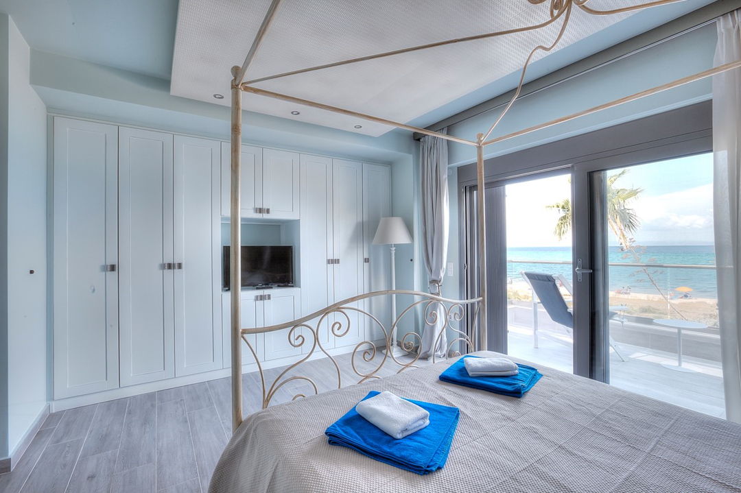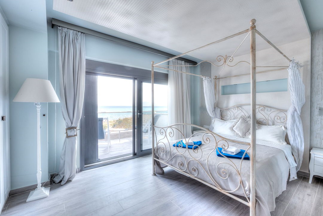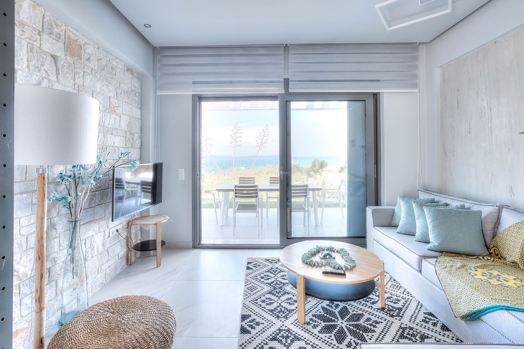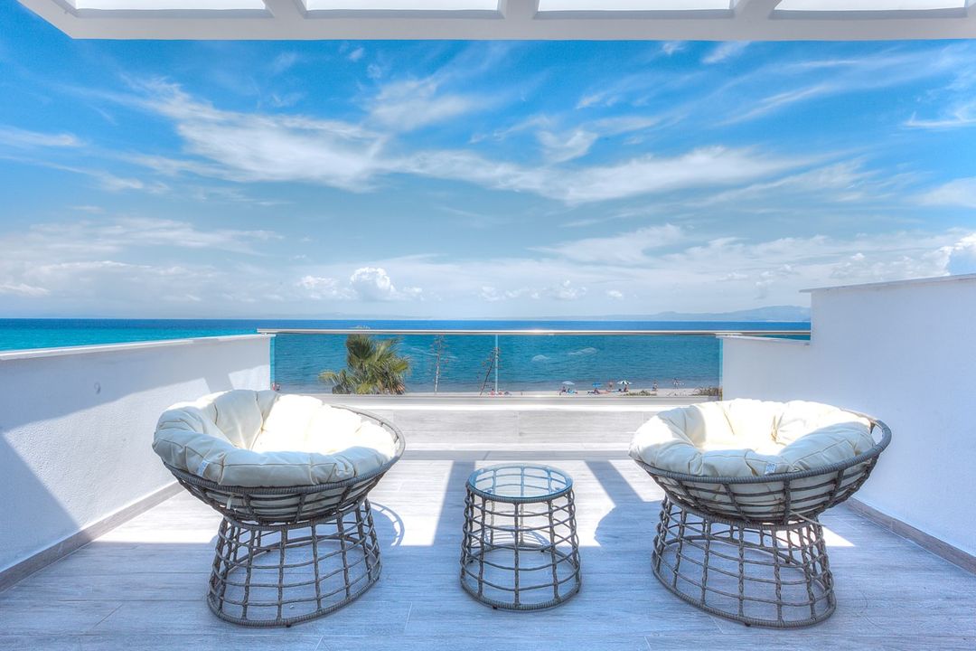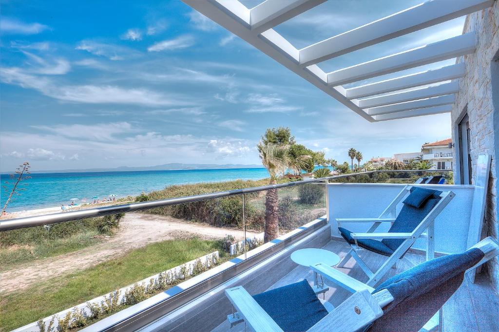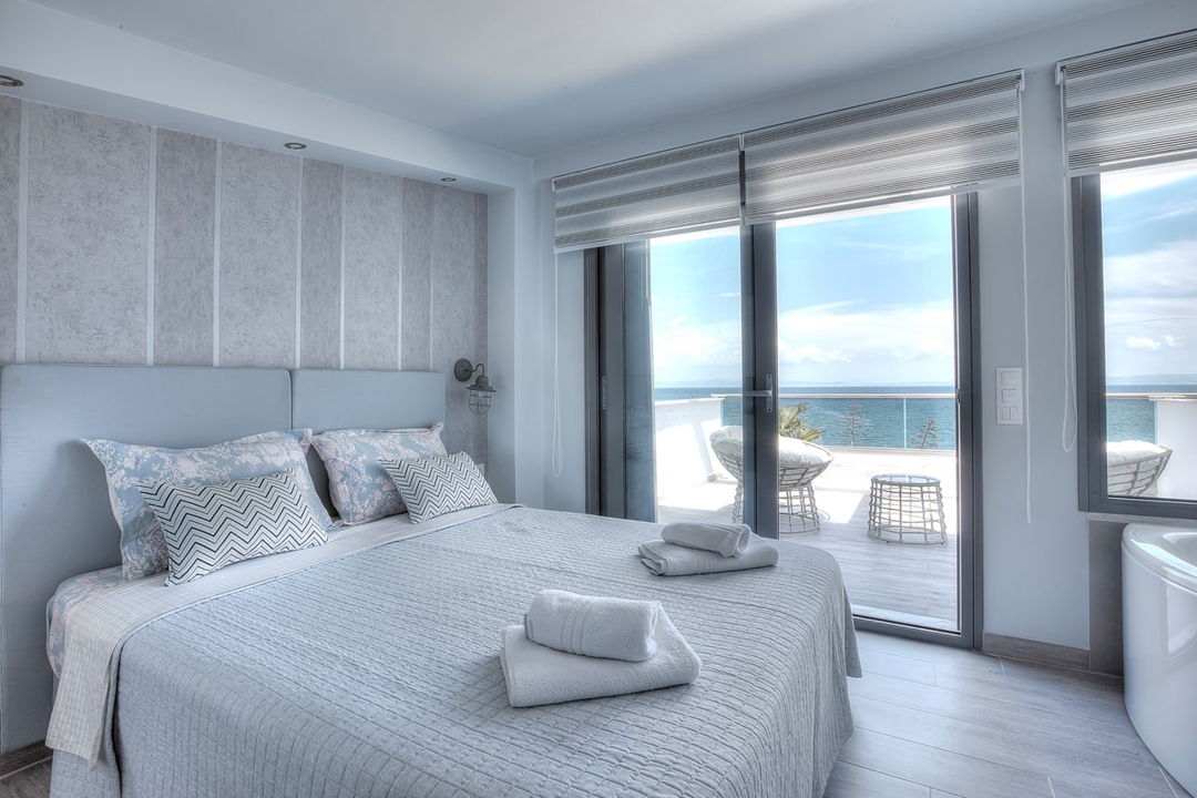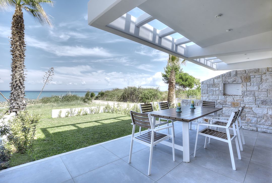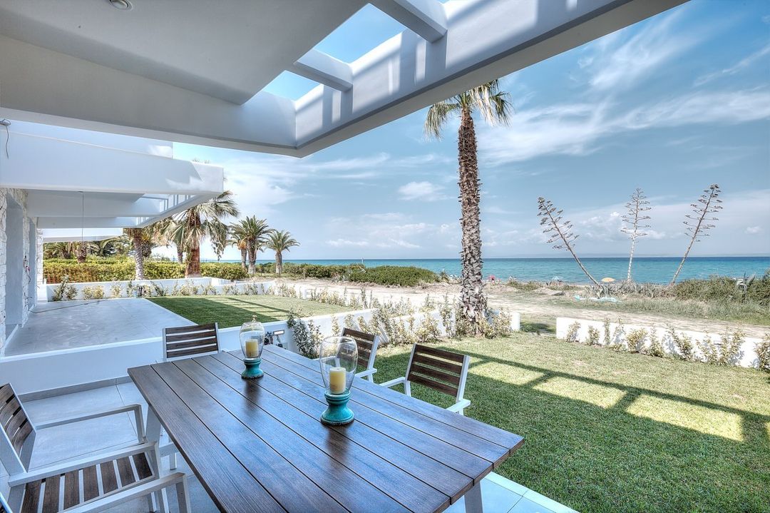For rent, a chic beachfront stone villa Aeras with 3 bedrooms and a panoramic sea view near Hanioti village, on the Kassandra peninsula, Halkidiki.