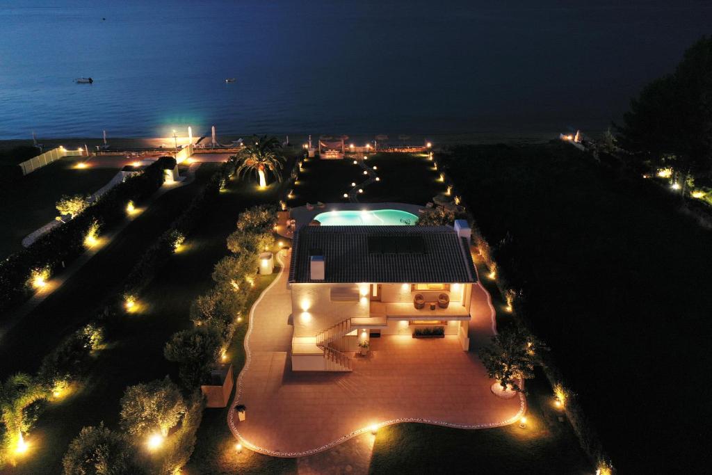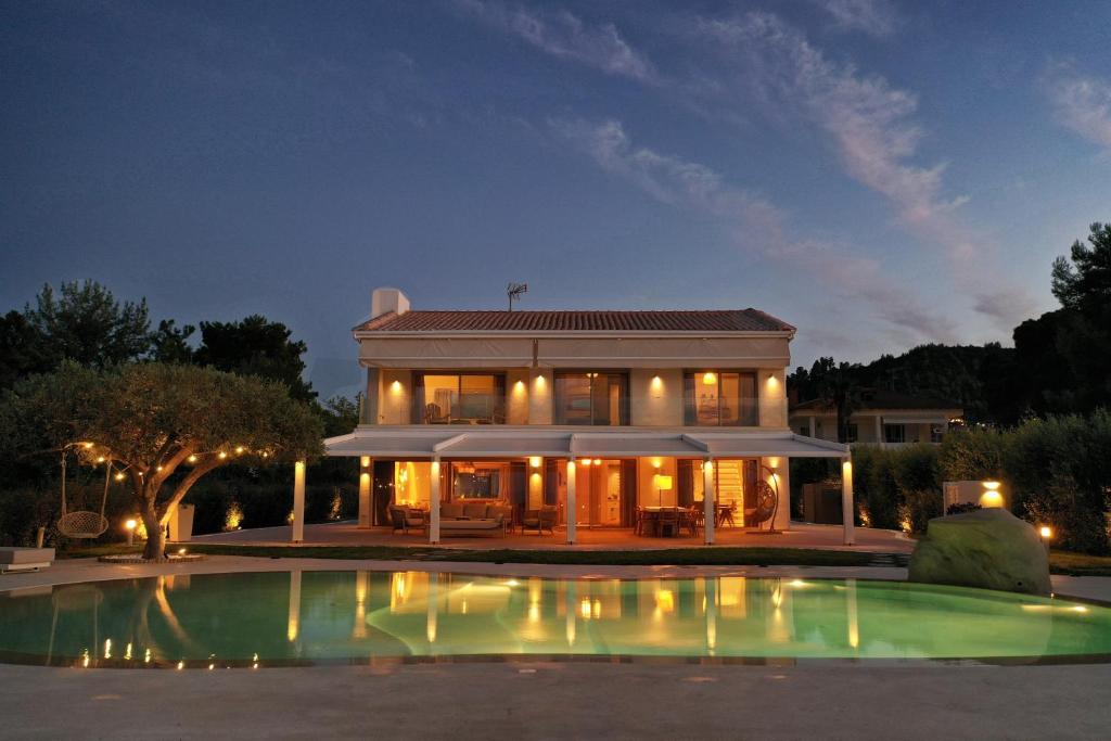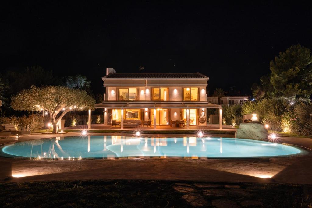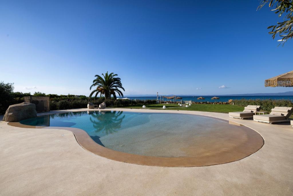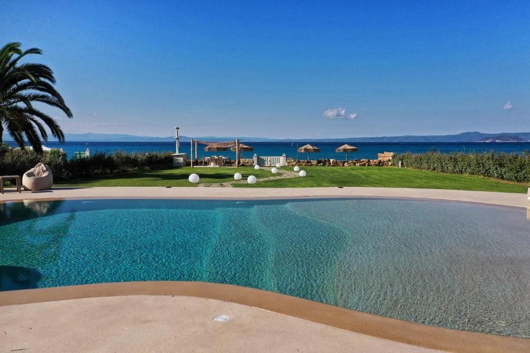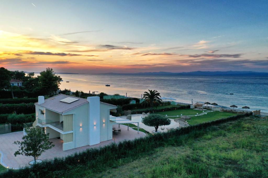 Luxury unique villa Aetos, with 4 bedrooms and a private pool, located right on the seafront, in the Pefkohori area, on the Kassandra peninsula, Halkidiki, for rent.