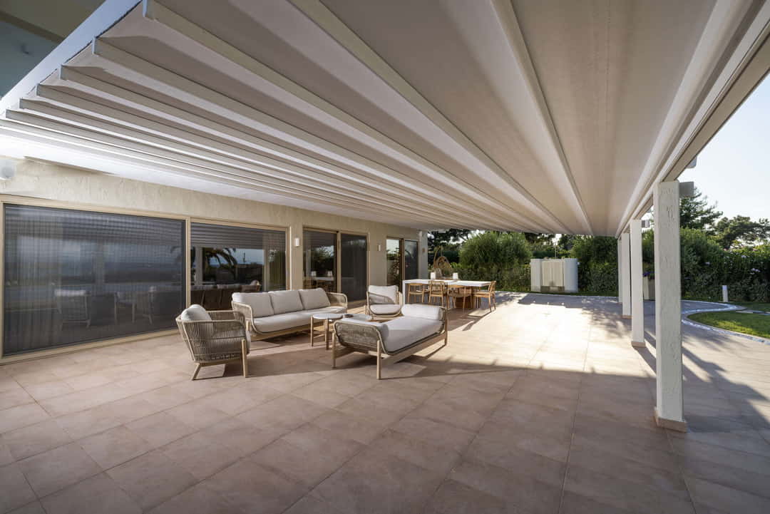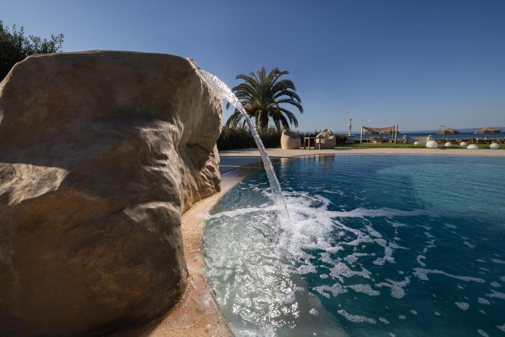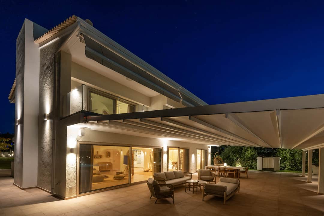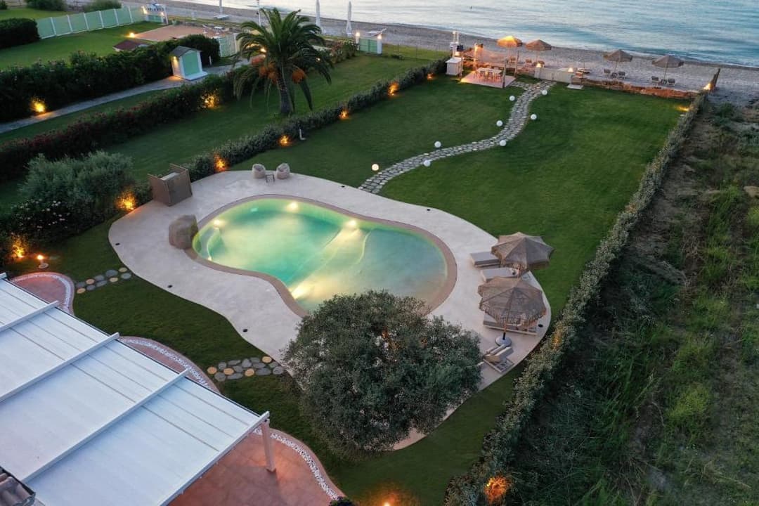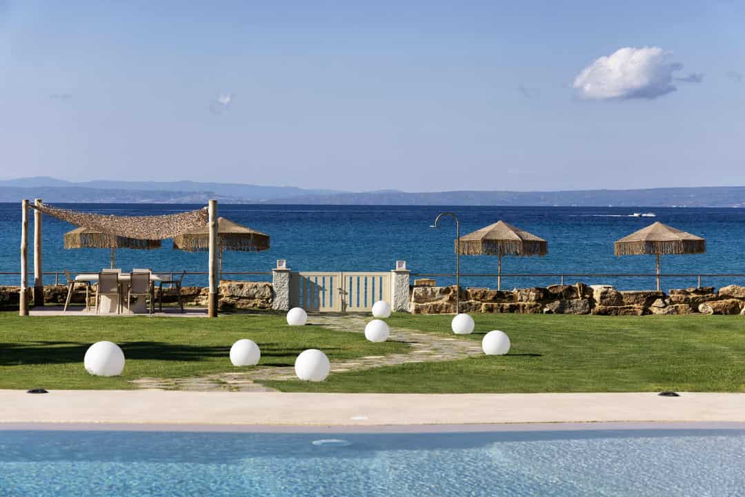 Luxury unique villa Aetos, with 4 bedrooms and a private pool, located right on the seafront, in the Pefkohori area, on the Kassandra peninsula, Halkidiki, for rent.