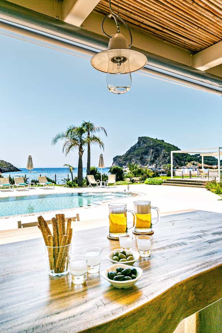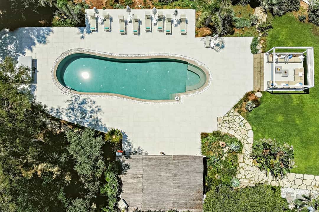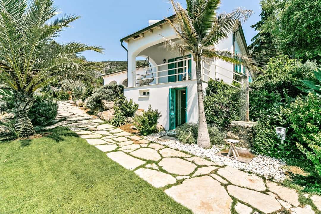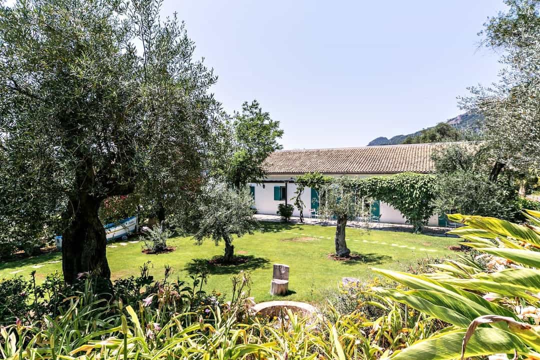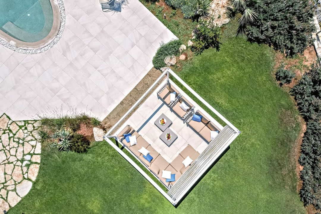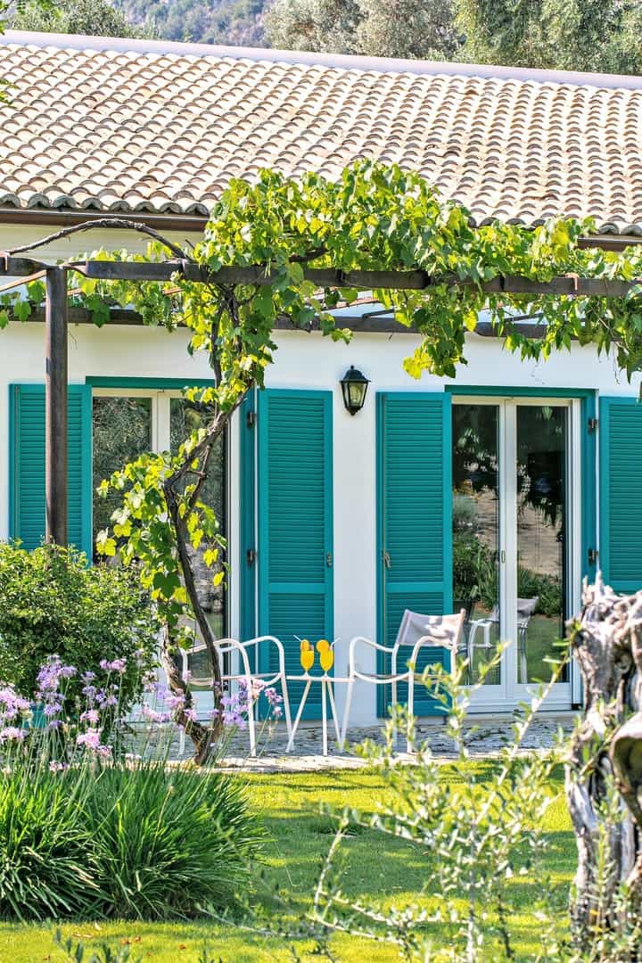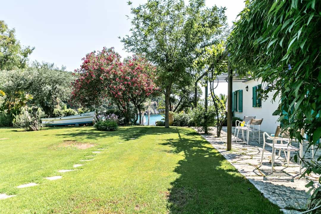 The property is wrapped in lush gardens and shaded pergolas, creating a serene atmosphere around the private pool — a perfect place to unwind and enjoy the sunset over the Ionian Sea.