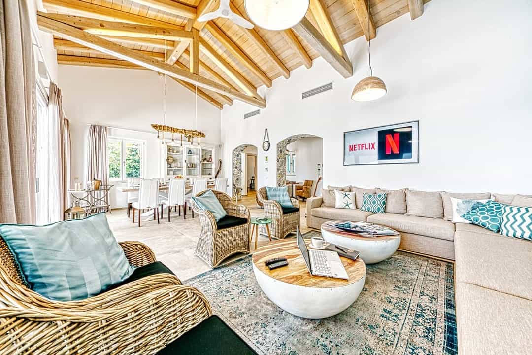 Inspired by the elegance of a Spanish hacienda, this seafront villa stands just above Agia Triada Bay, offering sweeping views and a refined blend of contemporary design, advanced smart-home features, and Mediterranean character. With space for up to 12 guests, it is an ideal choice for families and groups looking for comfort, privacy, and truly memorable surroundings.