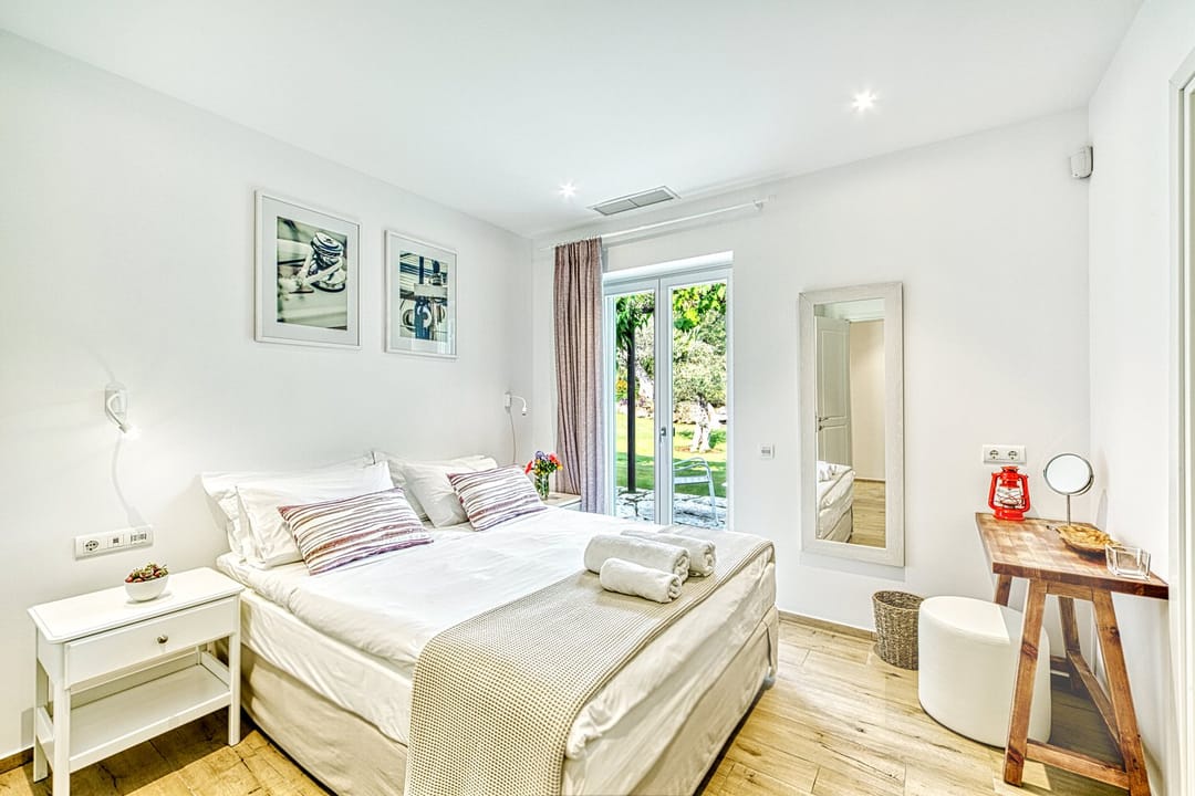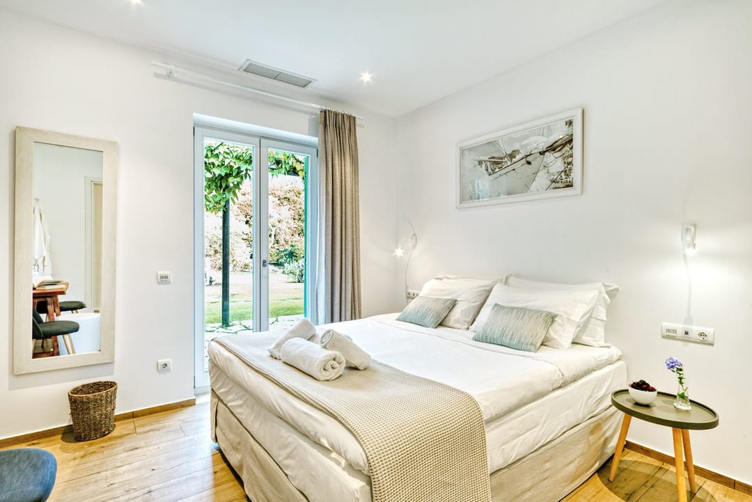 - 1st bedroom with double bed, en-suite bathroom, and separate terrace with access to the pool and garden
