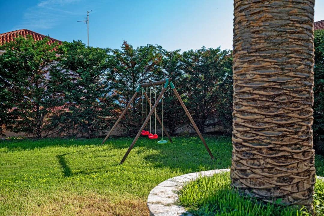 - Green fenced garden with children’s swings