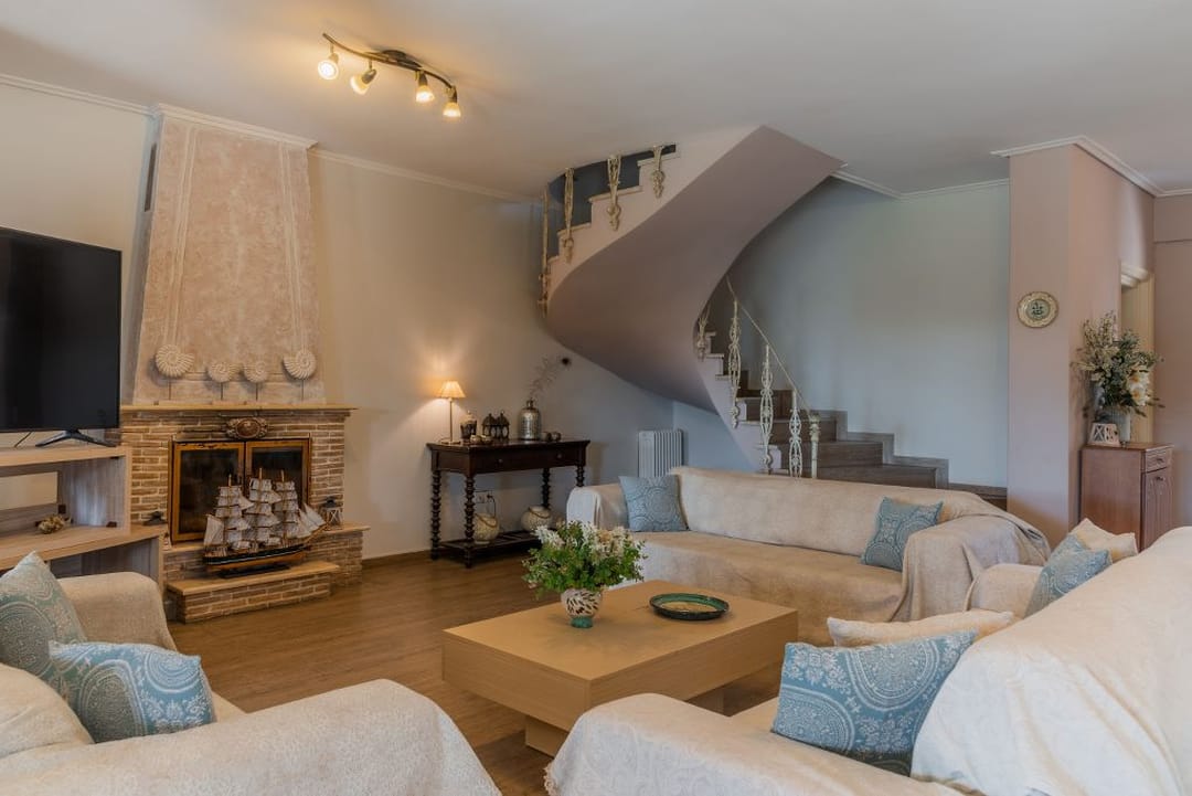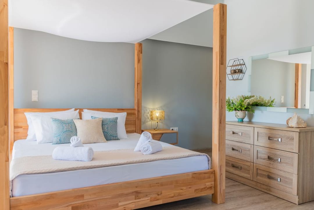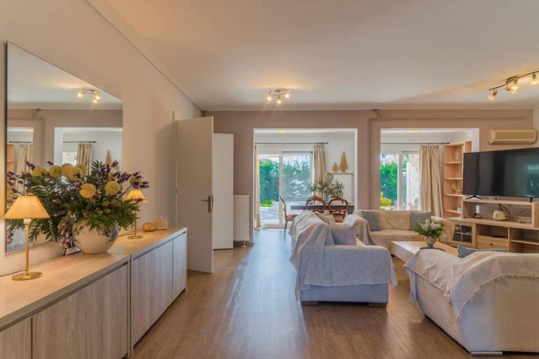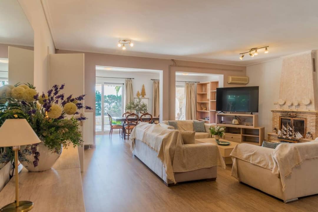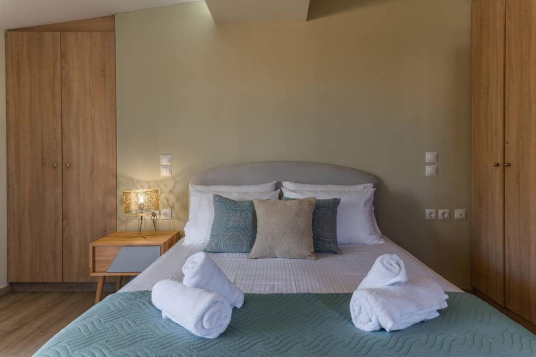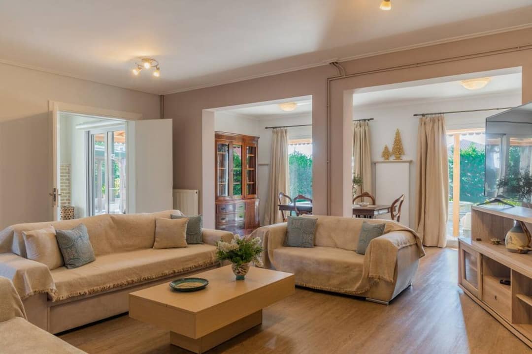 Located in Agios Sostis, a charming seaside resort on the southern coast of Zakynthos between Laganas and Keri, the villa enjoys an exceptional setting. The area is known for its golden sandy beach, shallow crystal-clear waters, and relaxed, family-friendly atmosphere. The property offers complete privacy and serenity, yet it’s just a short stroll from local shops, taverns, and cafés. A wooden footbridge nearby connects the shore to the tiny Cameo Island — one of the most photographed spots on Zakynthos.