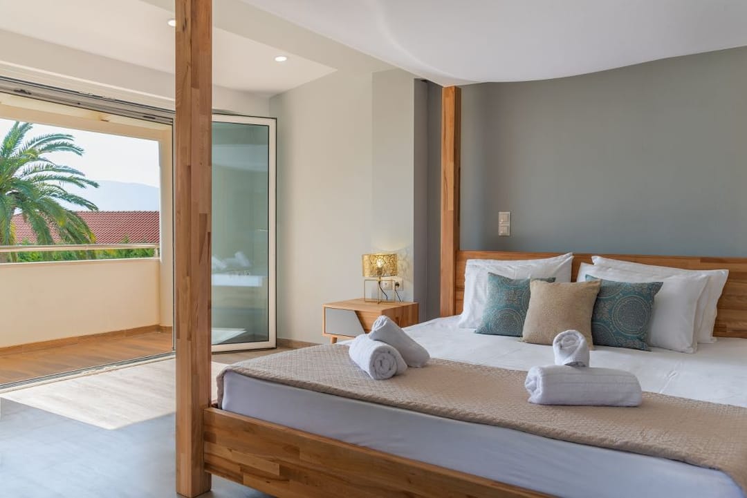 - 2nd bedroom with canopy double bed, and balcony with pool view