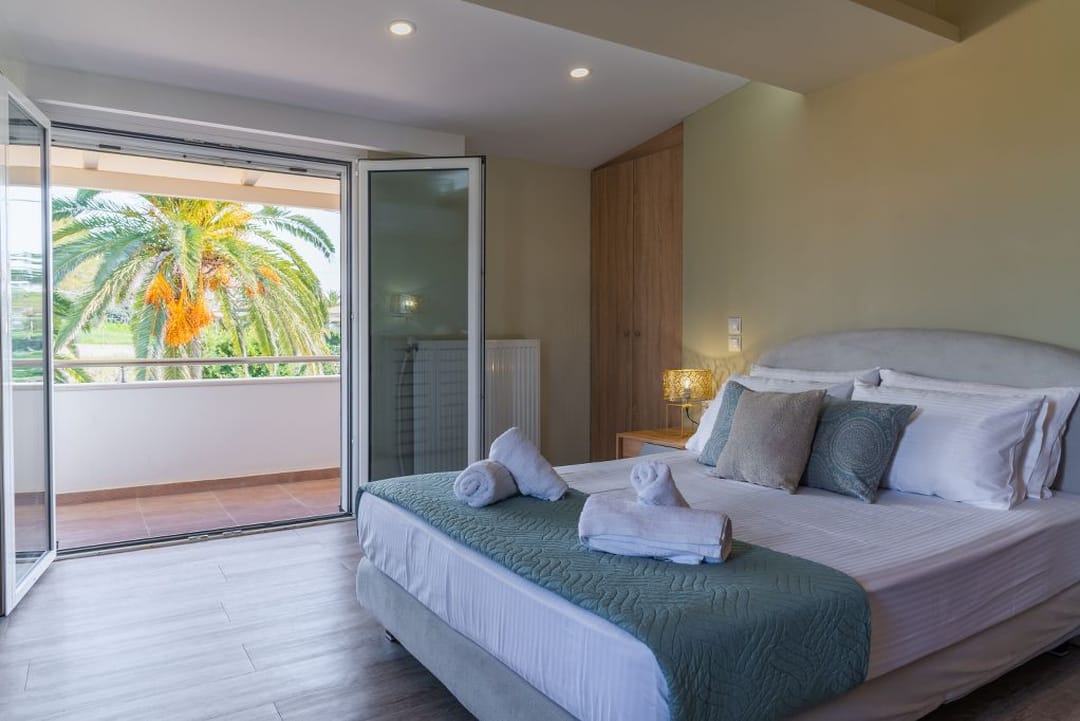 - 1st bedroom with double bed, en-suite bathroom, and balcony overlooking the pool