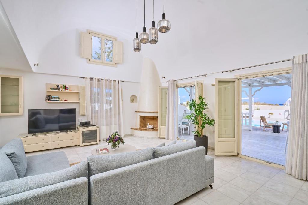 Luxurious, spacious Villa Amelia with 4 bedrooms, and a private pool, just a few steps from Monolithos Beach, in Agia Paraskevi village, Santorini Island, for rent.