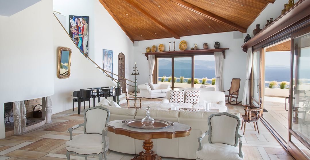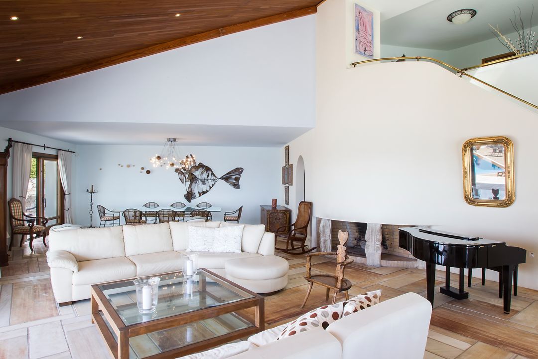 - Spacious living room with stunning Dionysian marble floor, a mini-grand piano, the paintings of Greek, sofa, LCD Satellite TV, DVD player