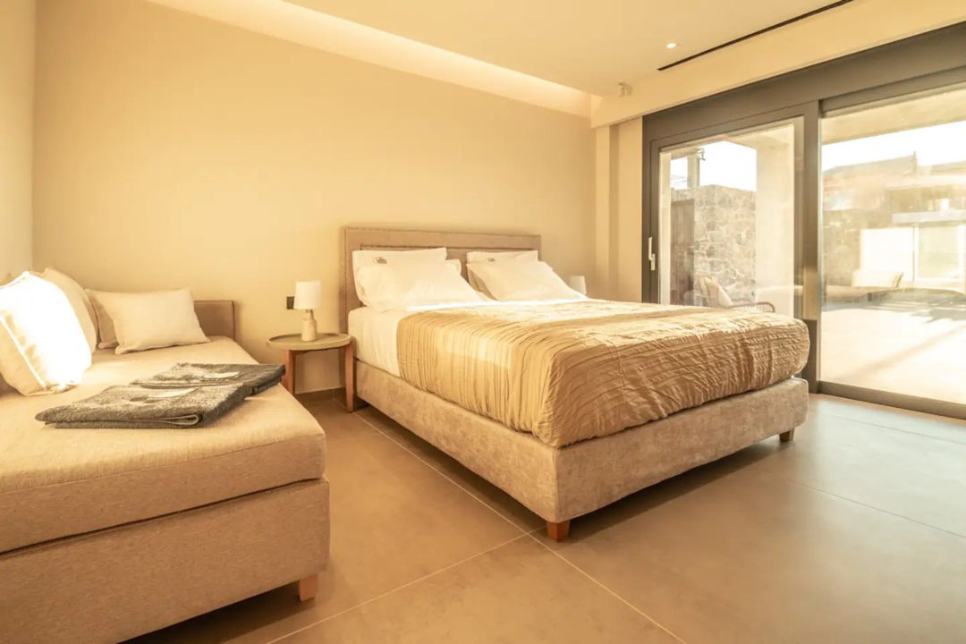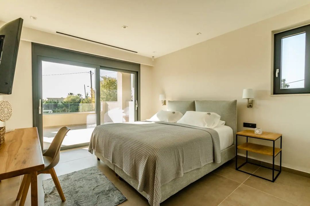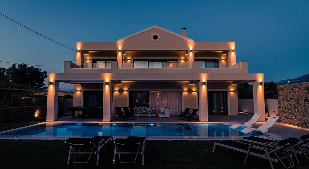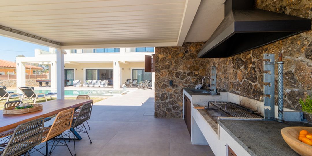 Luxury new Armonia Villa with 5 bedrooms, swimming pool, and jacuzzi, 200 meters from the beach, in the Acharavi area, Corfu Island, for rent.