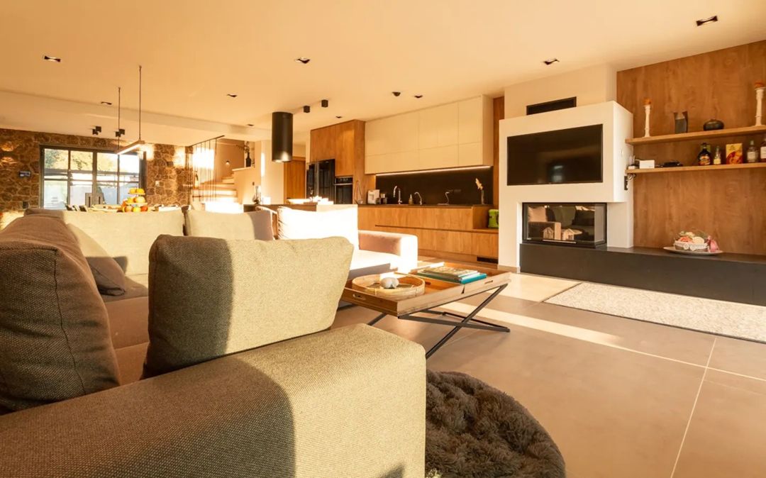 - Spacious open-plan living room with fireplace, smart TV, and straight access to the veranda and garden