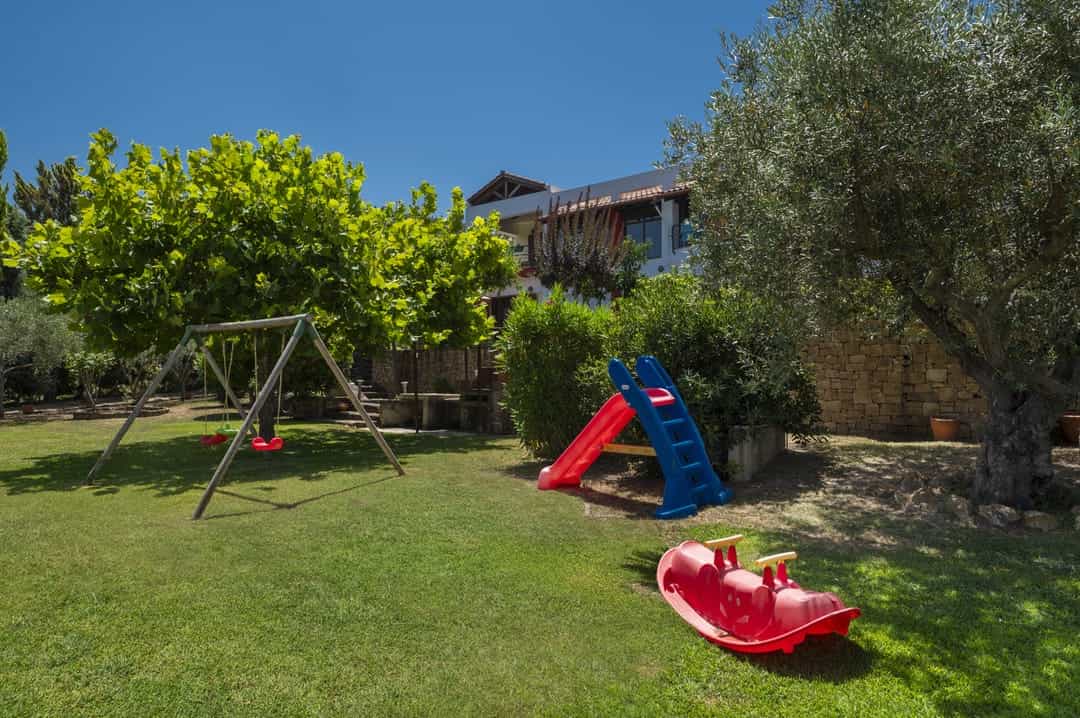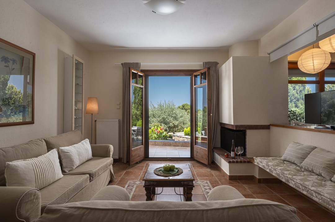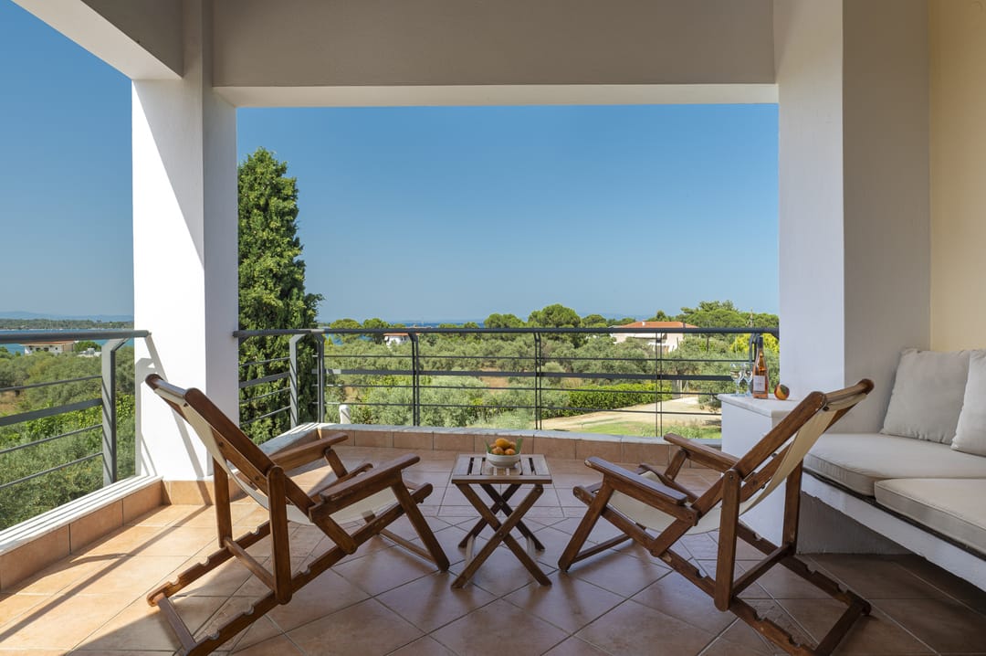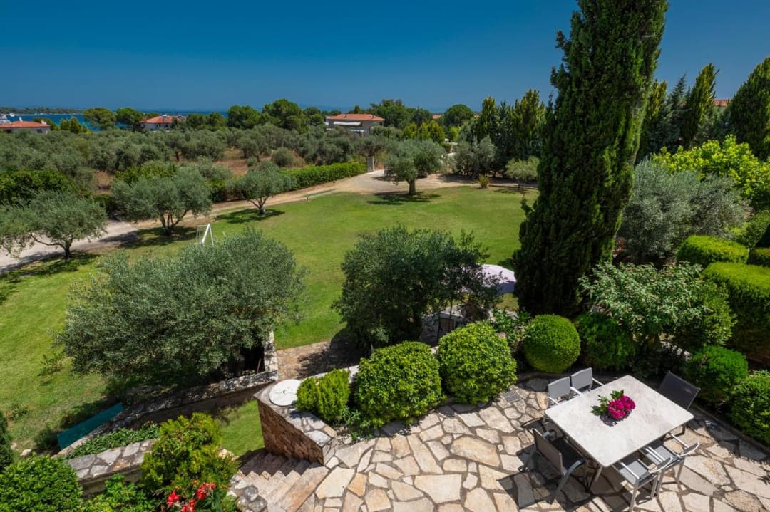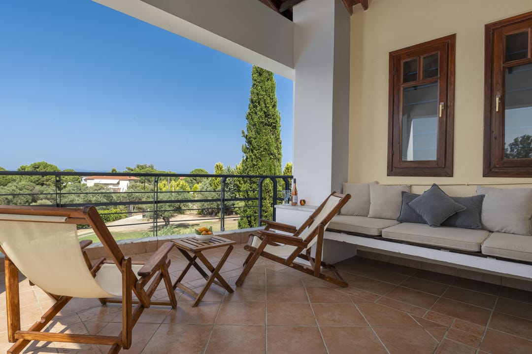 The villa is part of a complex and has its own large plot with a green garden full of olive and fruit trees — a perfect place for relaxation. Thanks to its corner location, the villa offers more privacy and seclusion. Guests can enjoy garden furniture, a basketball and football court, children’s swings, and a ping-pong table. The villa offers a picturesque view of the sea and forest. The house is just 150 meters from a sandy beach with crystal-clear waters, which is one of the trademarks of the Sithonia Peninsula.
