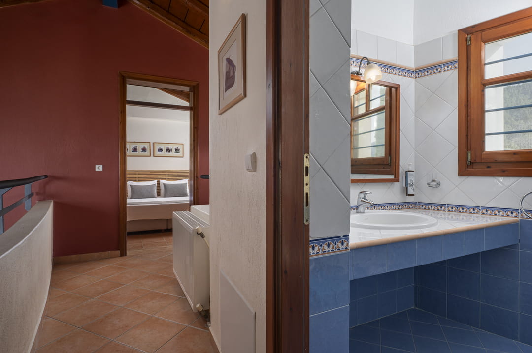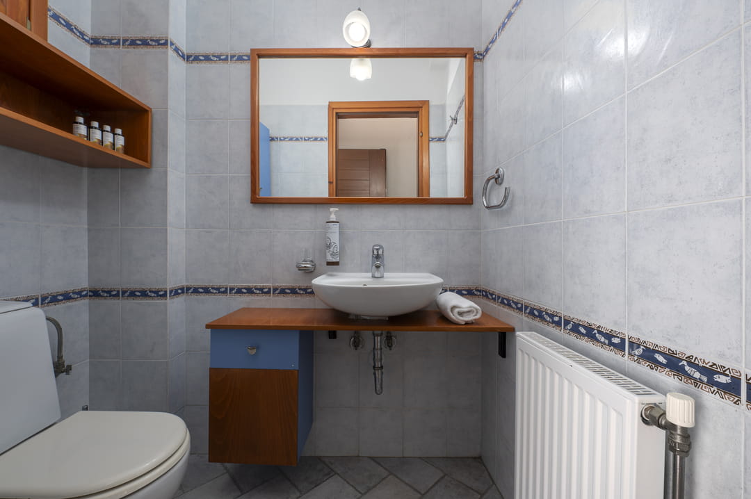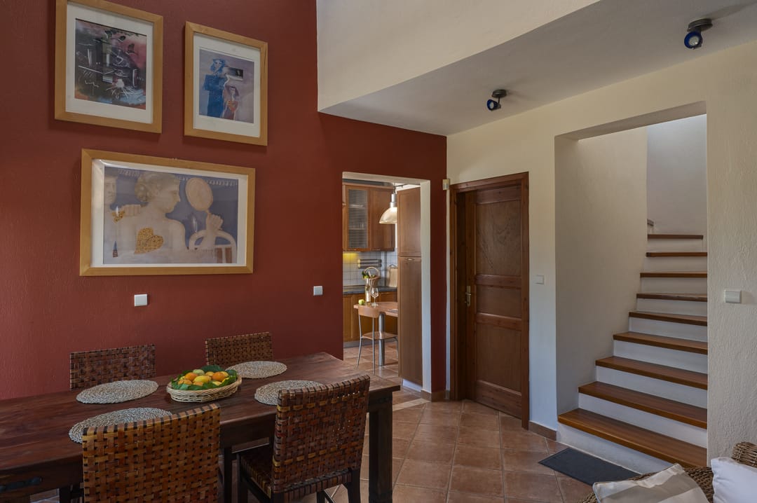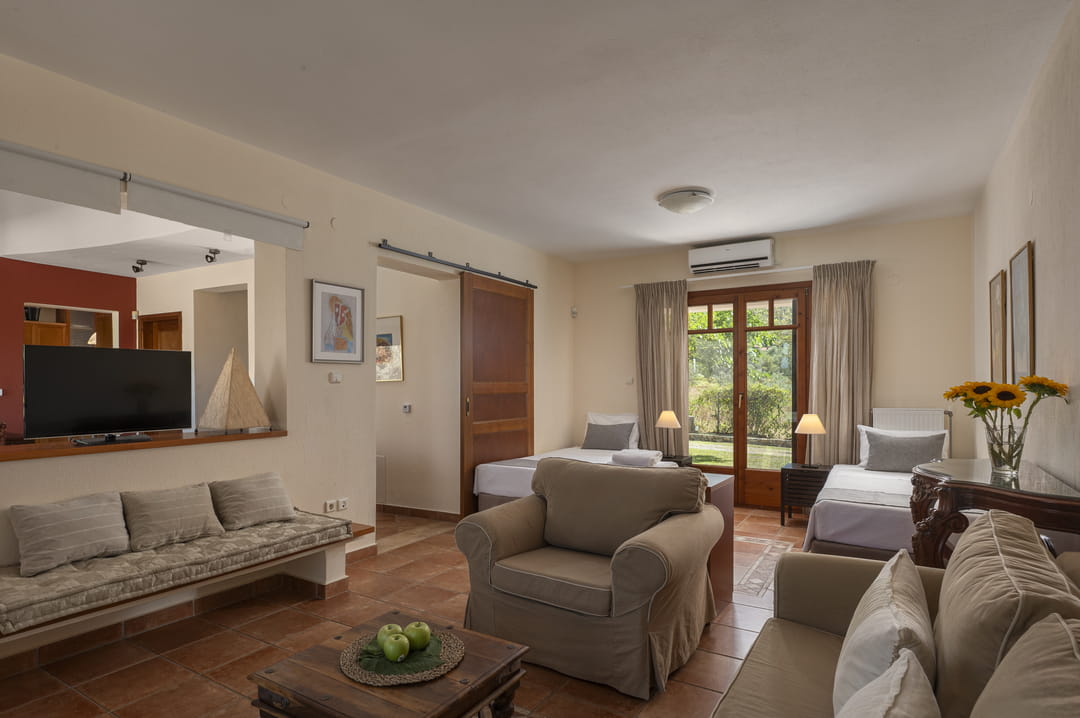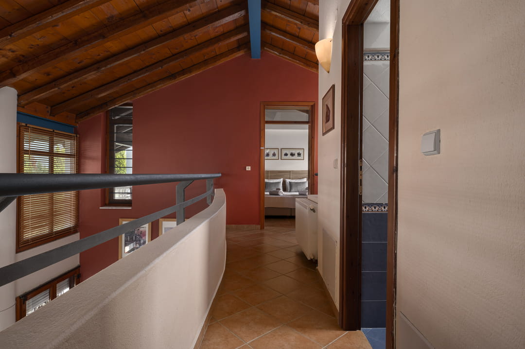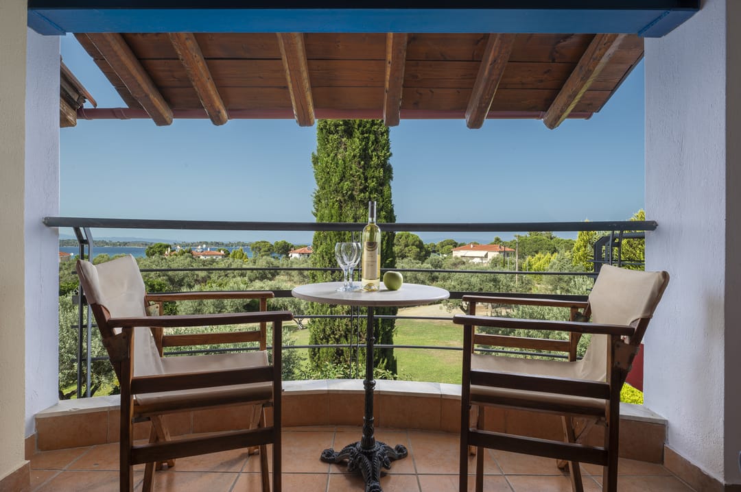 The villa is part of a complex and has its own large plot with a green garden full of olive and fruit trees — a perfect place for relaxation. Thanks to its corner location, the villa offers more privacy and seclusion. Guests can enjoy garden furniture, a basketball and football court, children’s swings, and a ping-pong table. The villa offers a picturesque view of the sea and forest. The house is just 150 meters from a sandy beach with crystal-clear waters, which is one of the trademarks of the Sithonia Peninsula.