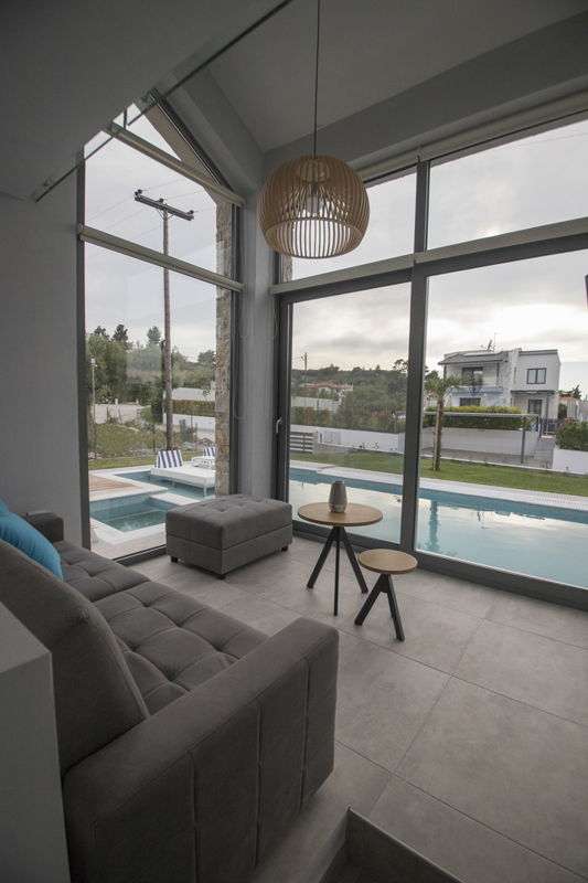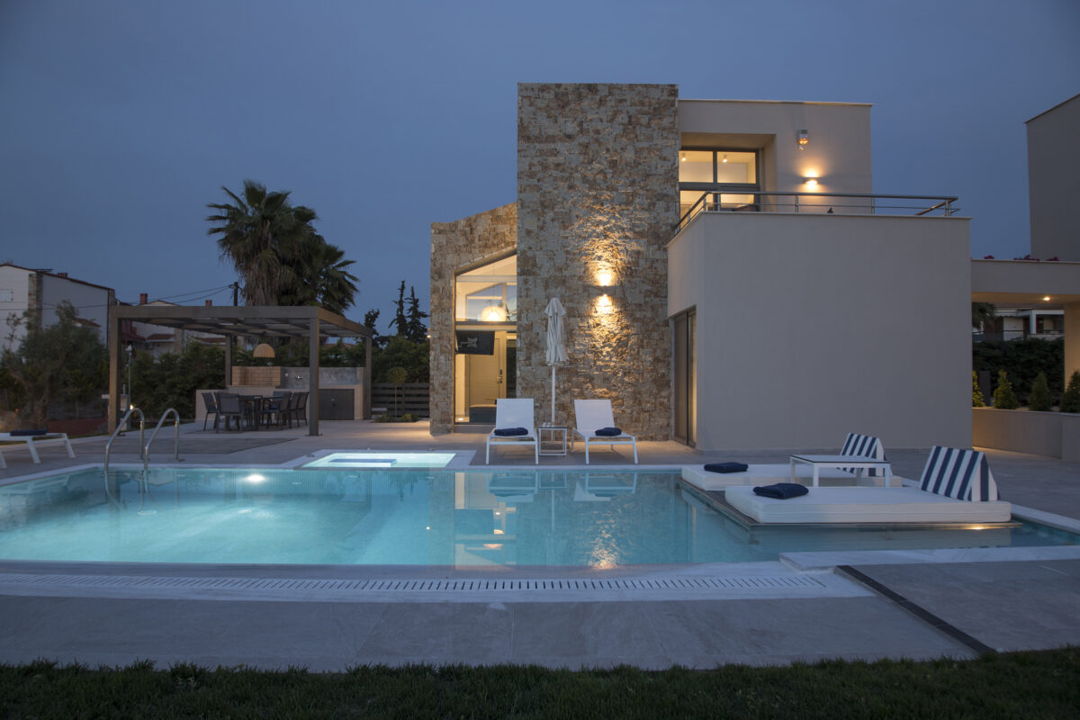 Modern high-standard villa Atlanta with 4 bedrooms, private pool, and jacuzzi, just 200 meters from the sandy beach in Pefkohori village, Kassandra, Halkidiki for rent.
