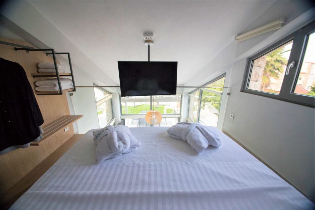 What makes the interior design of this villa truly unique is the cozy yet elegant loft on the second floor, featuring a king-size double bed and a SMART 4K TV. The villa’s balcony offers breathtaking views of the sea, creating the perfect setting for relaxation.