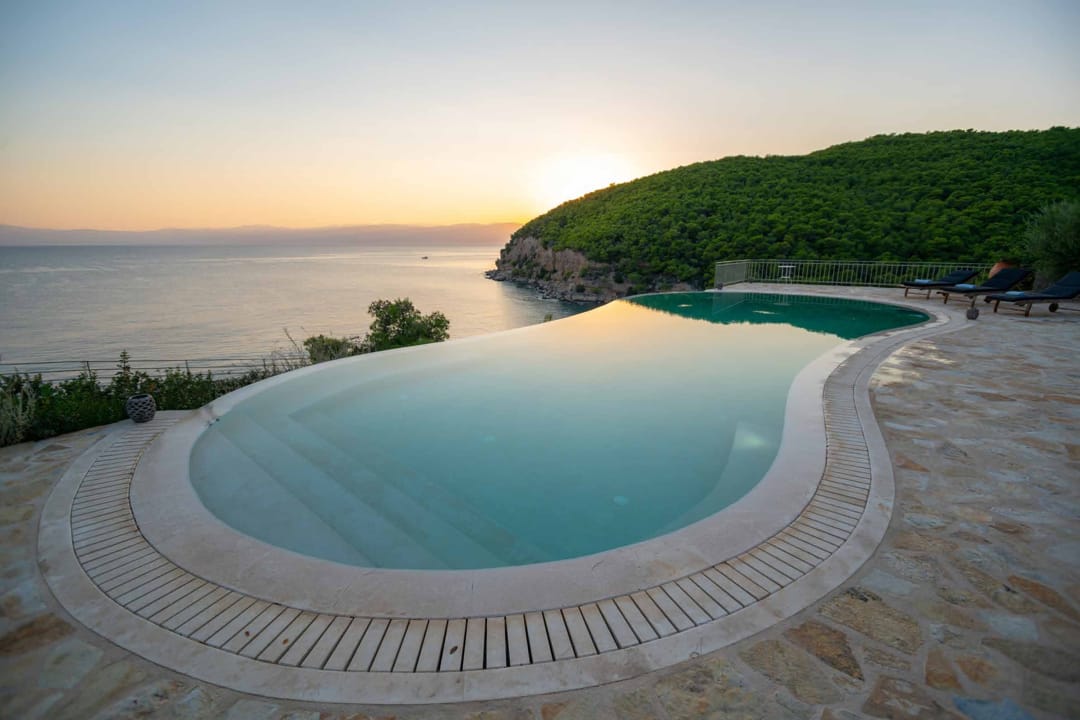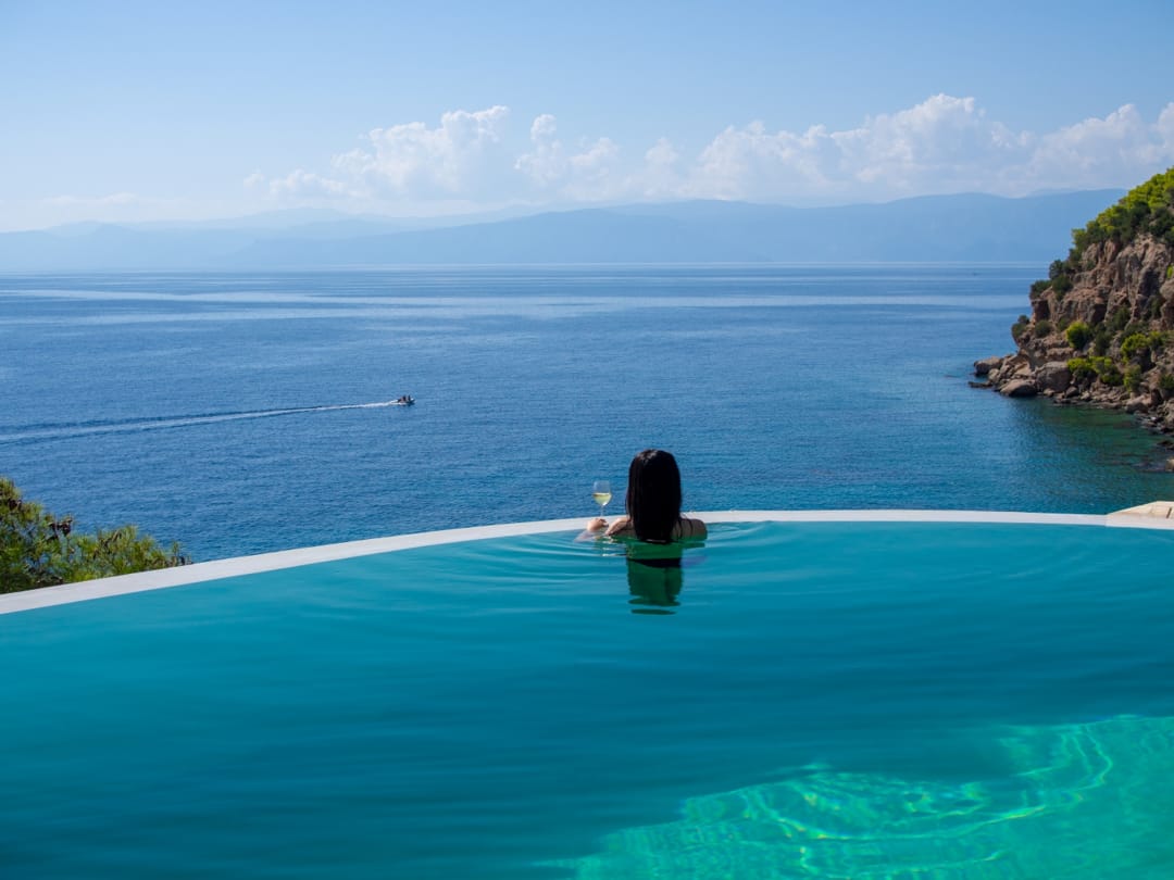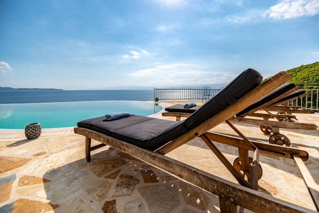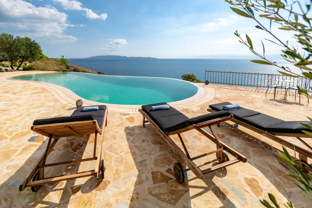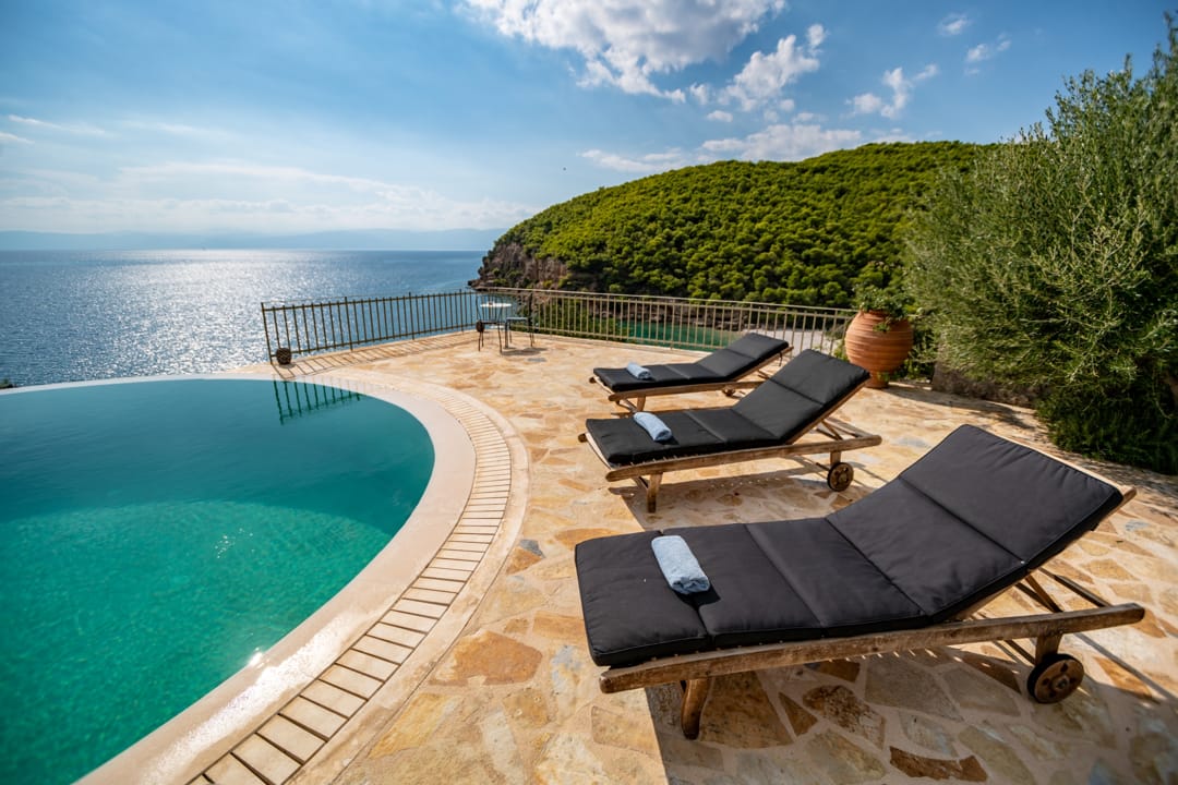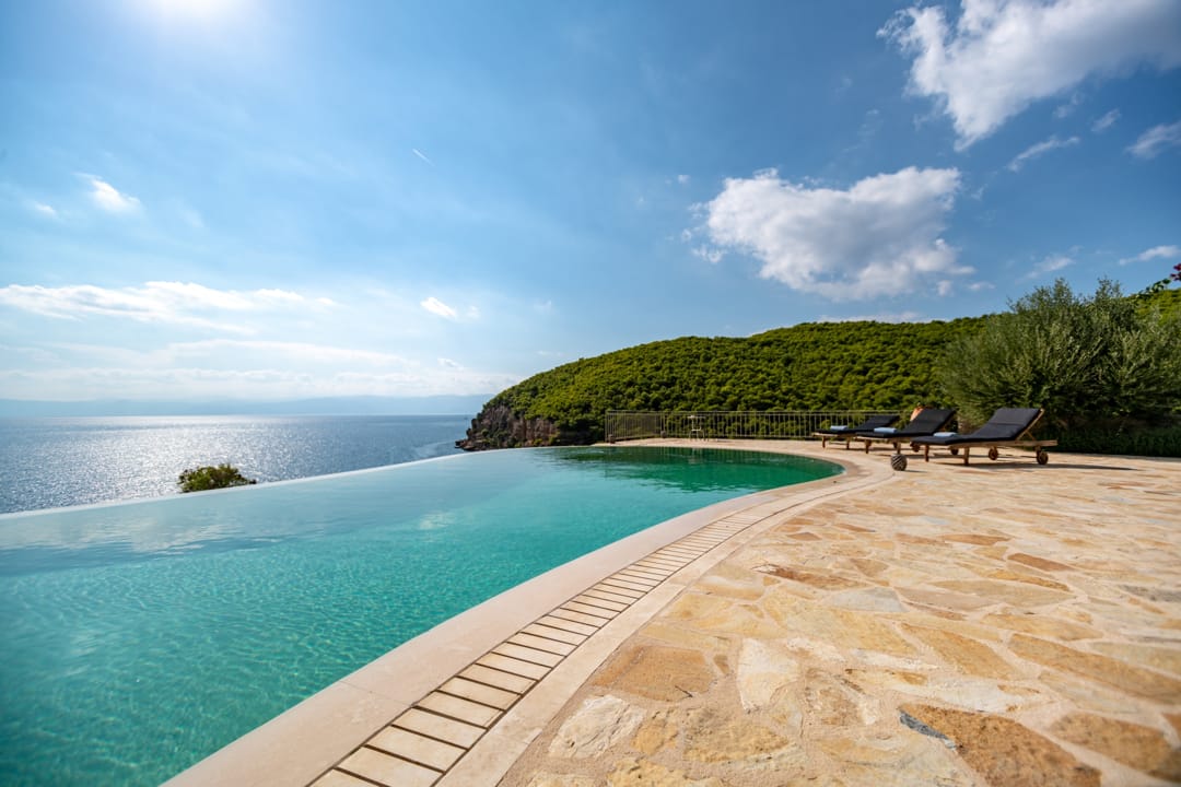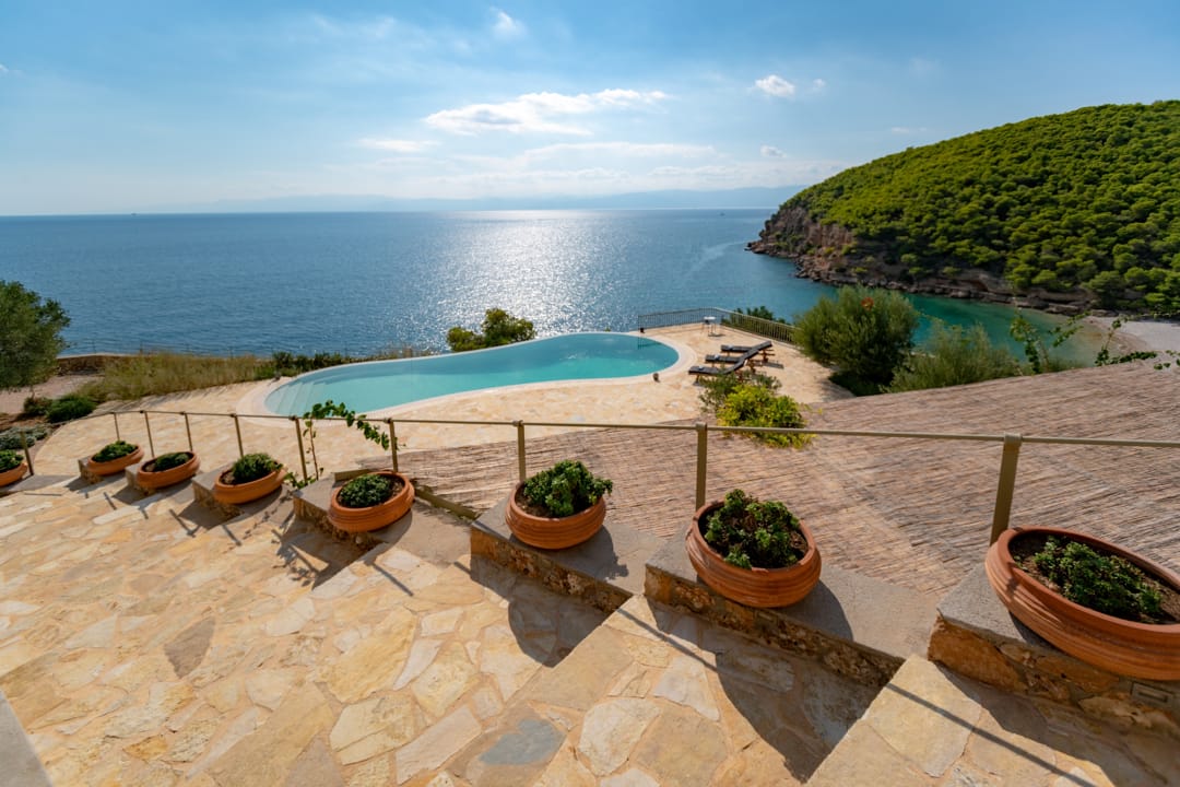 Majestic villa Aurora with 6 bedrooms, an infinity swimming pool overlooking the azure crystal-clear waters, just a few steps from the beautiful bay, in the prestigious region of Porto Heli, Peloponnese, for rent.