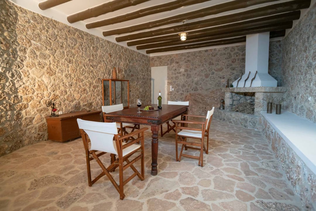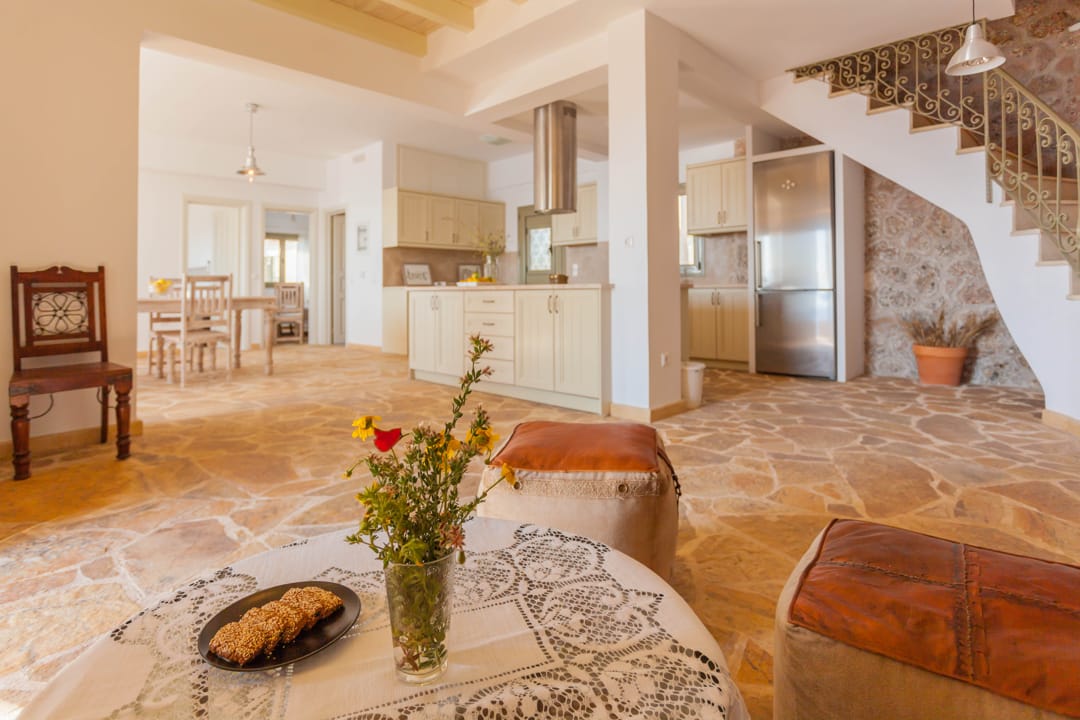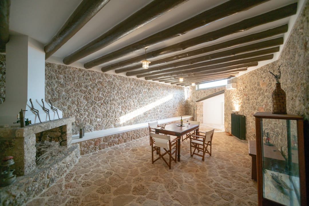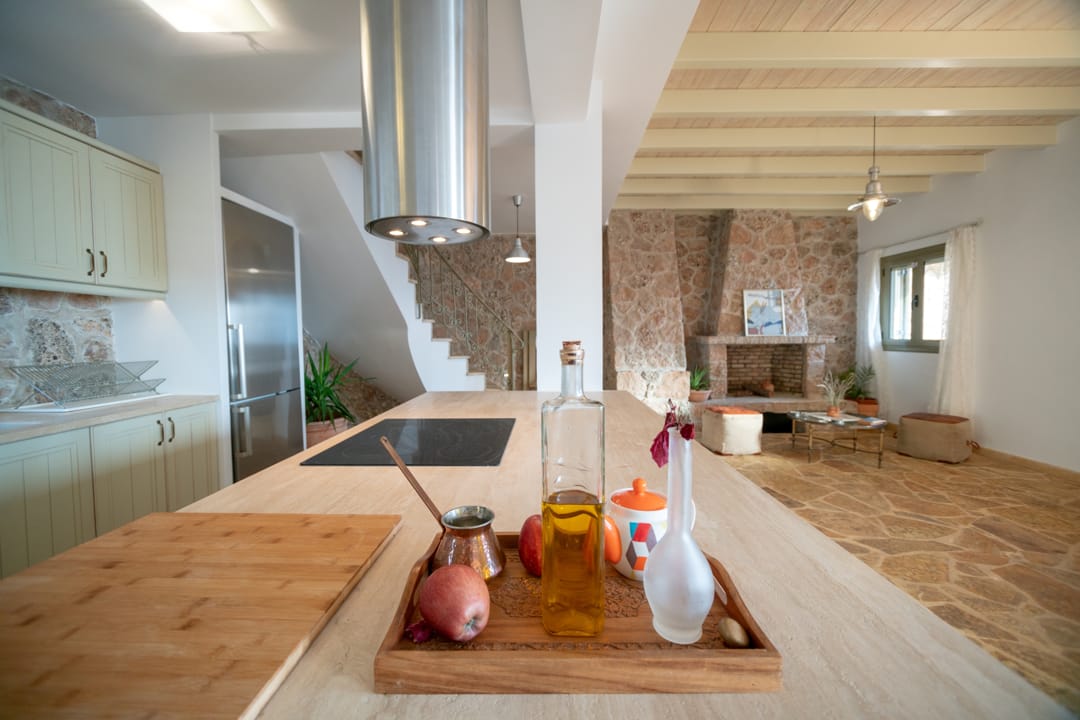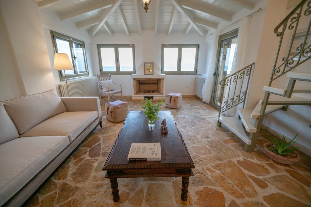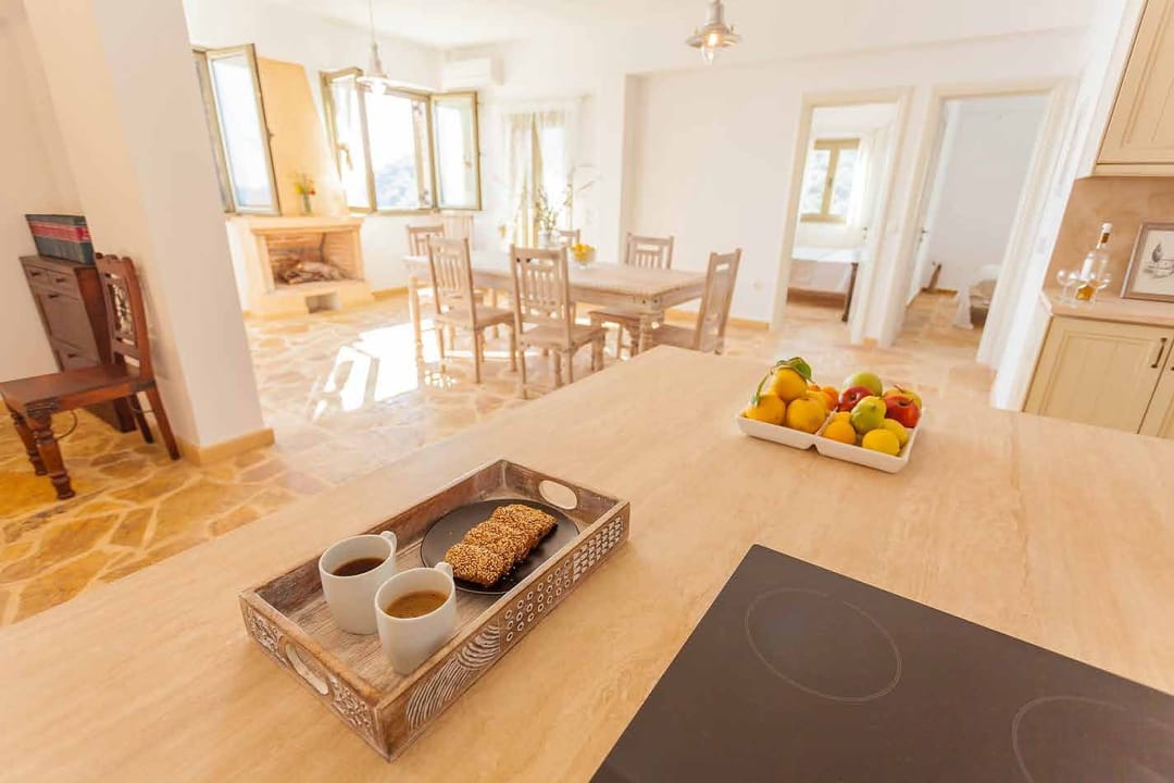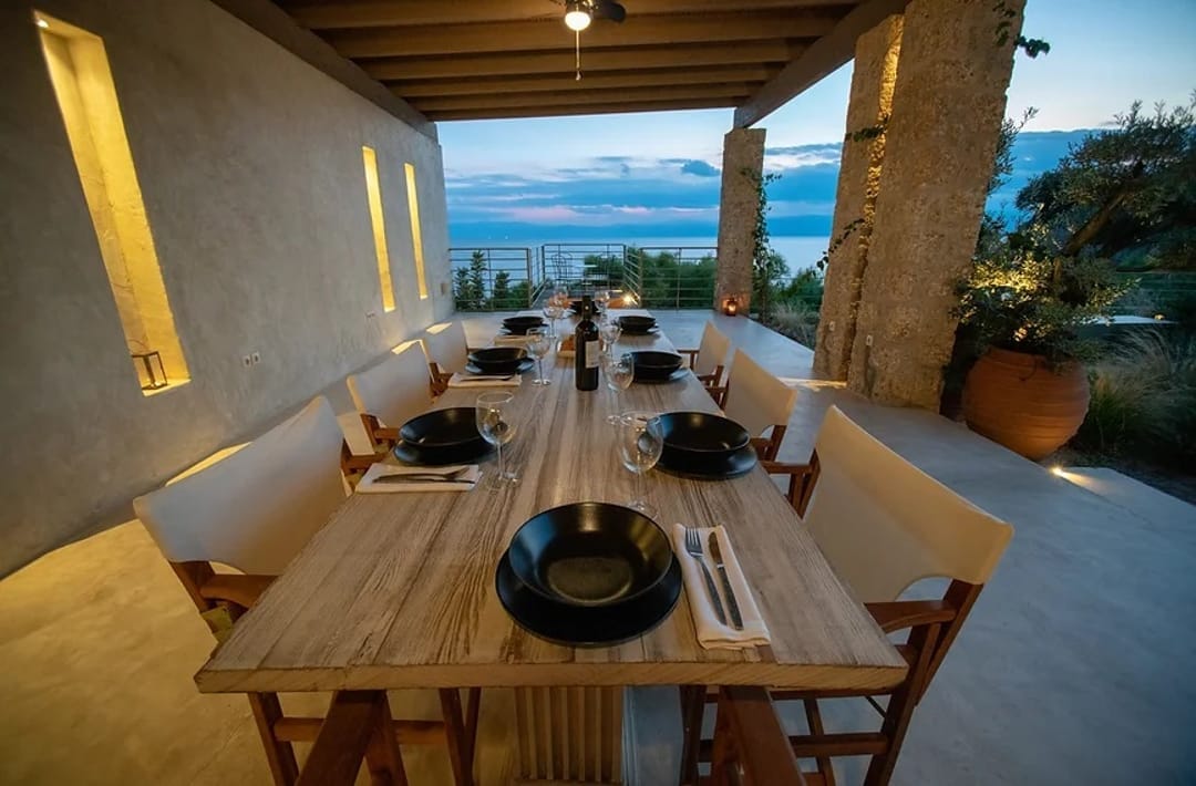 The architecture of the villas is based on the traditional style of the area, using materials that blend beautifully with the surroundings. The interiors are furnished with handcrafted traditional pieces. The minimalist approach allows guests to relax and enjoy the unique views of the Aegean Sea, nearby islands, and the adjacent forest. Ample and spacious living areas with large dining areas and comfortable leather sofas create an ideal environment for feasting and enjoying quiet moments.