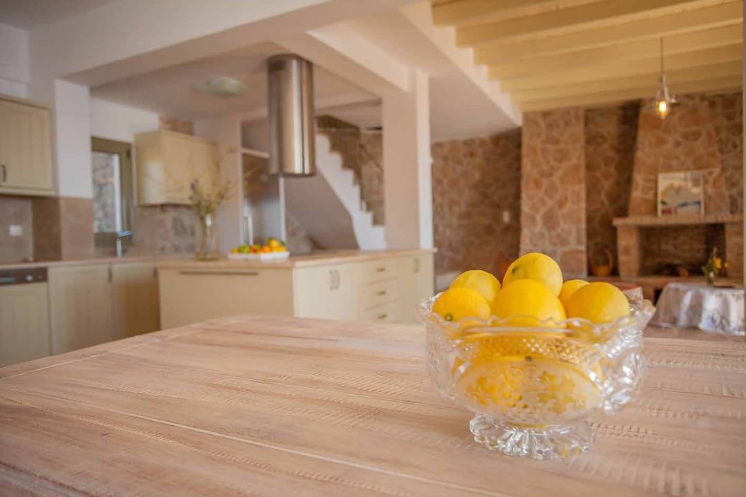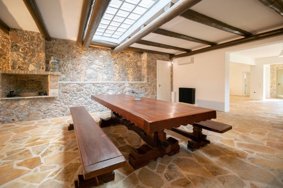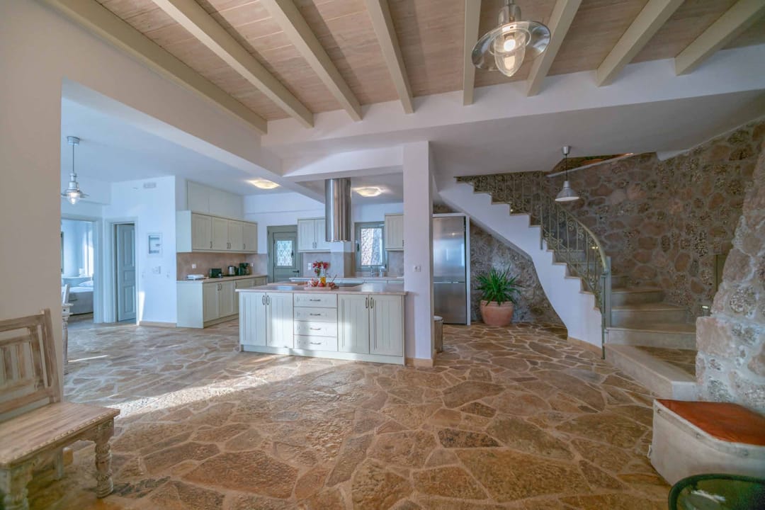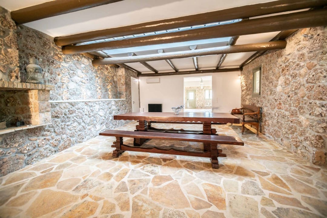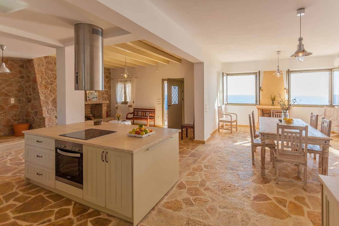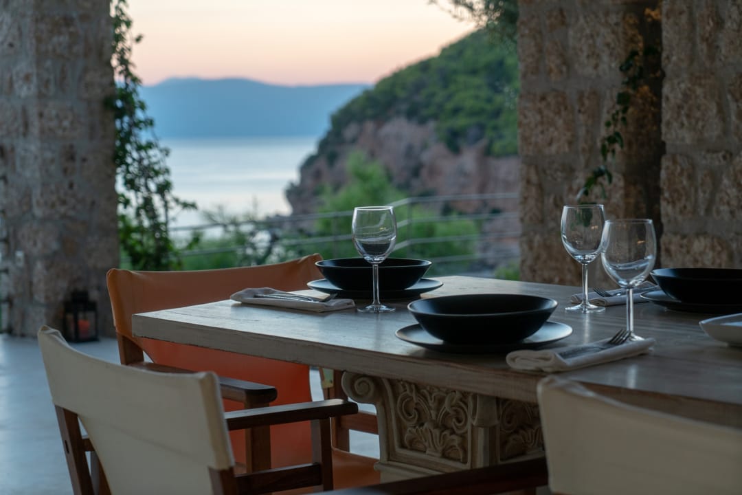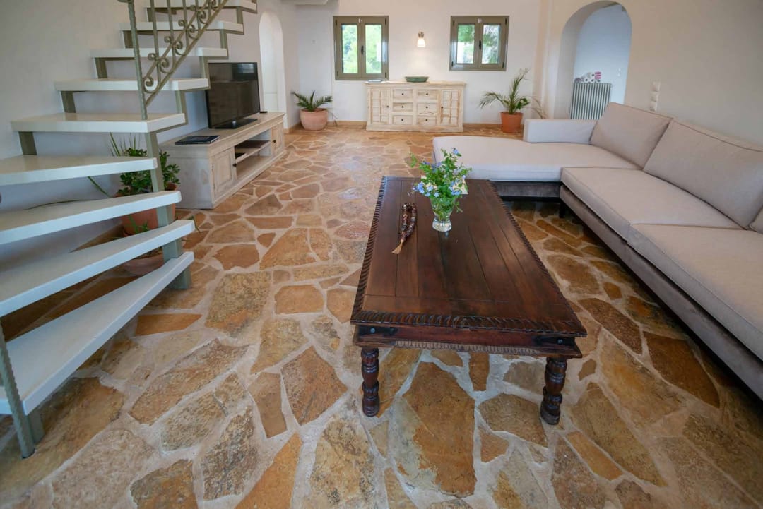 The architecture of the villas is based on the traditional style of the area, using materials that blend beautifully with the surroundings. The interiors are furnished with handcrafted traditional pieces. The minimalist approach allows guests to relax and enjoy the unique views of the Aegean Sea, nearby islands, and the adjacent forest. Ample and spacious living areas with large dining areas and comfortable leather sofas create an ideal environment for feasting and enjoying quiet moments.