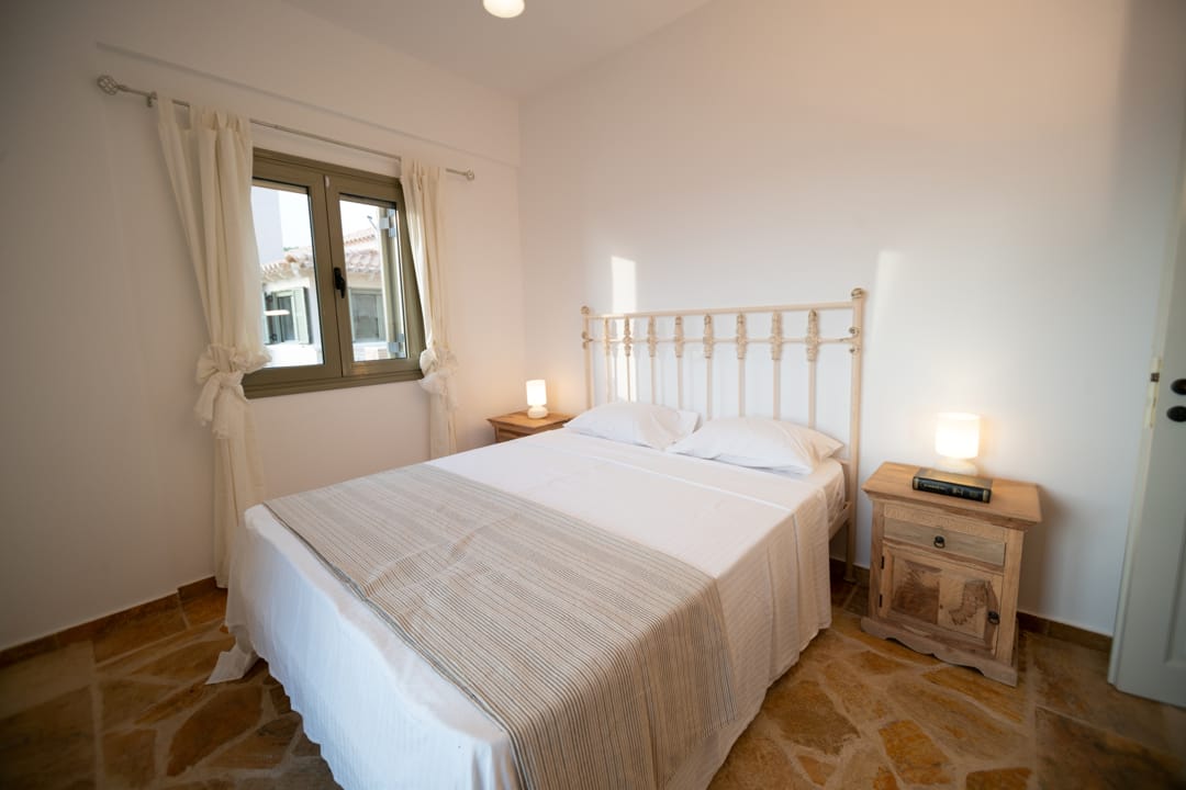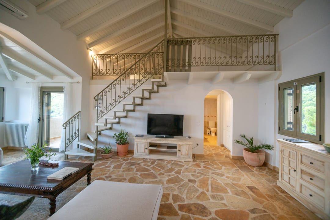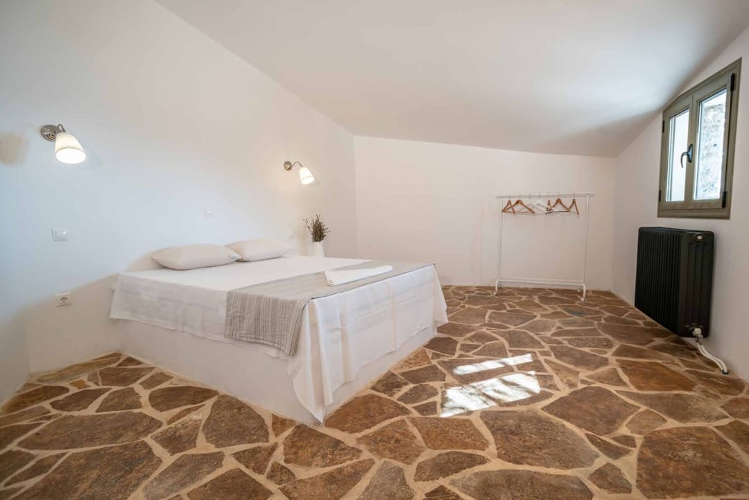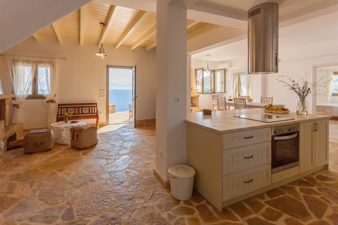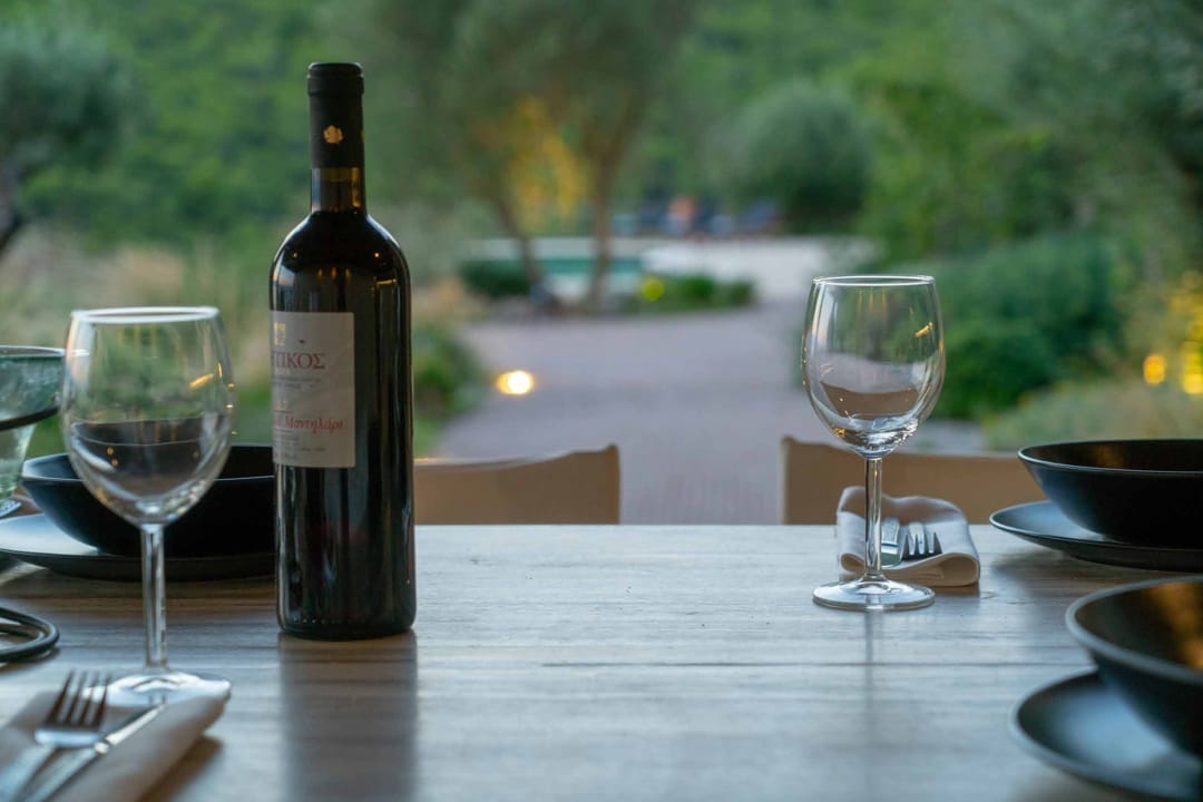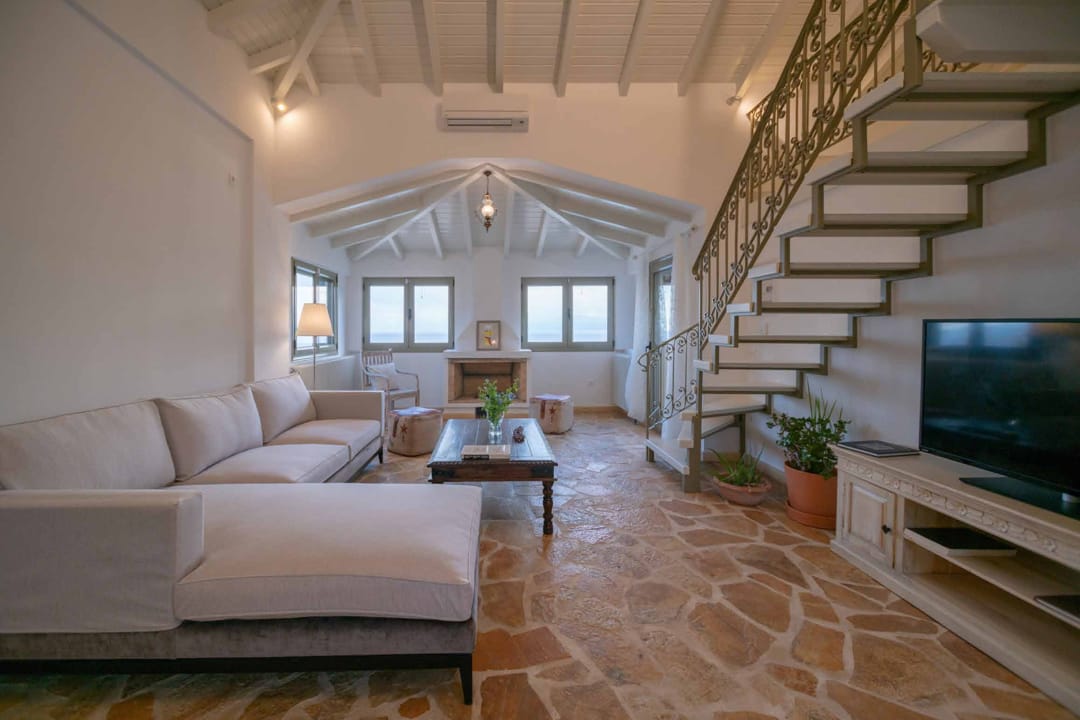 The architecture of the villas is based on the traditional style of the area, using materials that blend beautifully with the surroundings. The interiors are furnished with handcrafted traditional pieces. The minimalist approach allows guests to relax and enjoy the unique views of the Aegean Sea, nearby islands, and the adjacent forest. Ample and spacious living areas with large dining areas and comfortable leather sofas create an ideal environment for feasting and enjoying quiet moments.