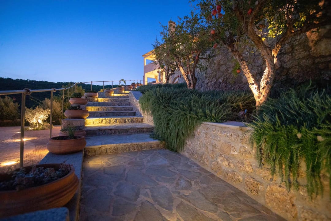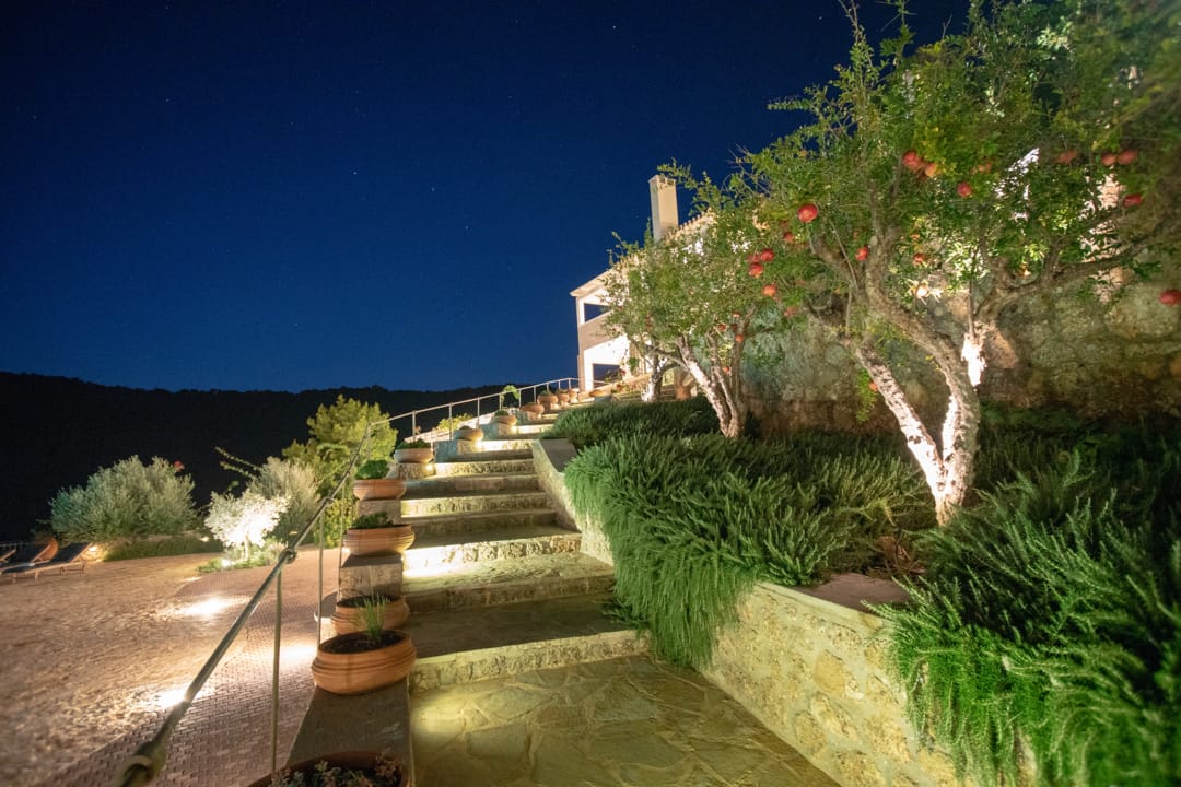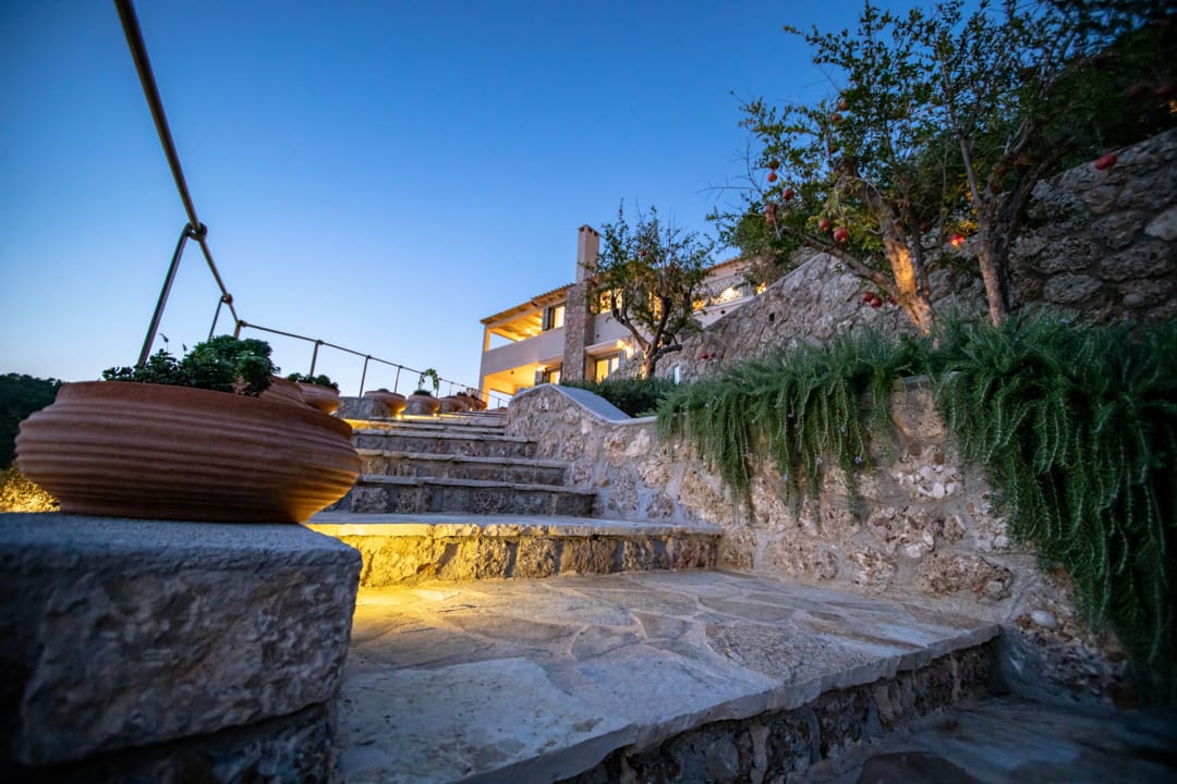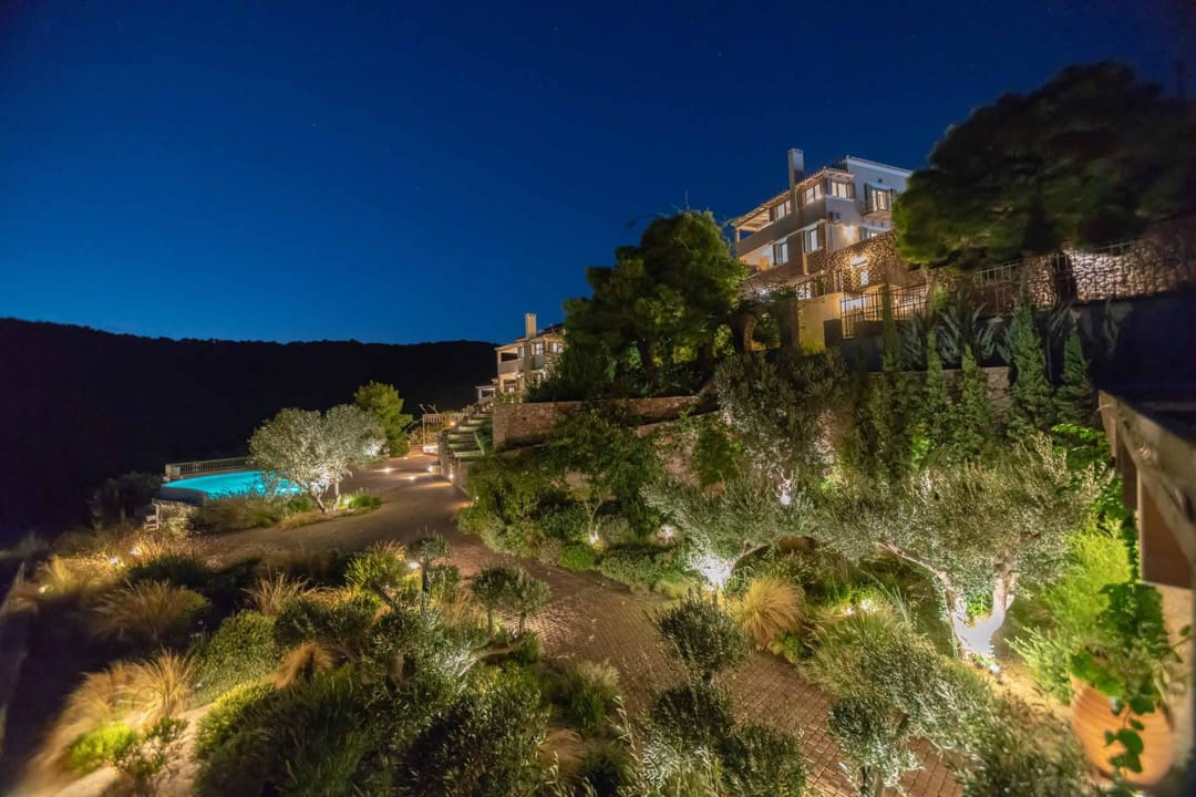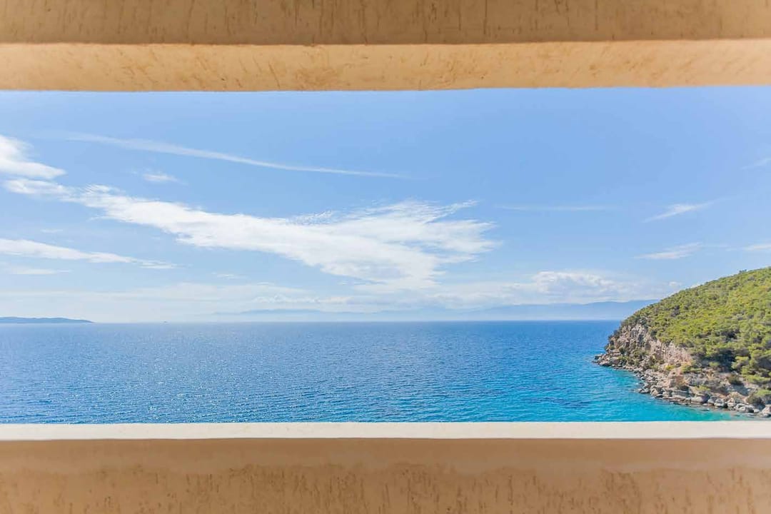 The villa is located in a complex of three luxurious villas, each with its separate entrance, driveway, private grounds, and gardens. The feature of these amazing villas is their unique location, just above a natural secluded cove, surrounded by lush green forest, with incredible views of the Aegean Sea and pine forest.