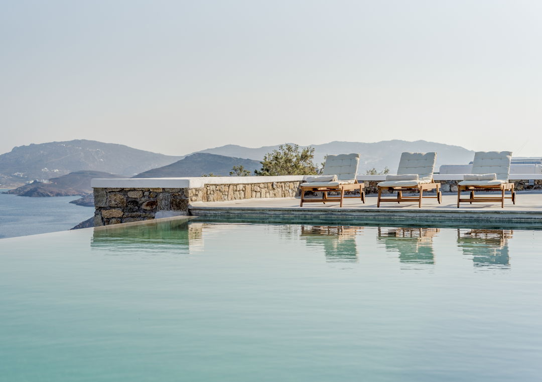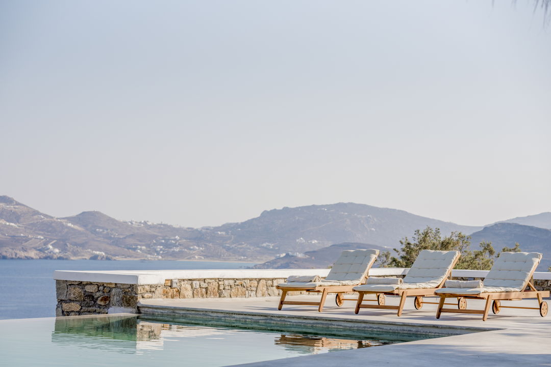 Luxury spacious Boho villa with 7 bedrooms, infinity swimming pool and panoramic sea view, located above Agios Sostis Beach, in Mykonos Island for rent.