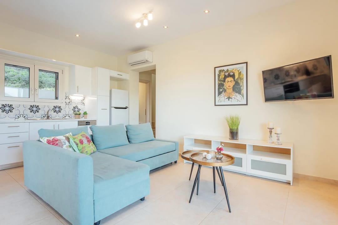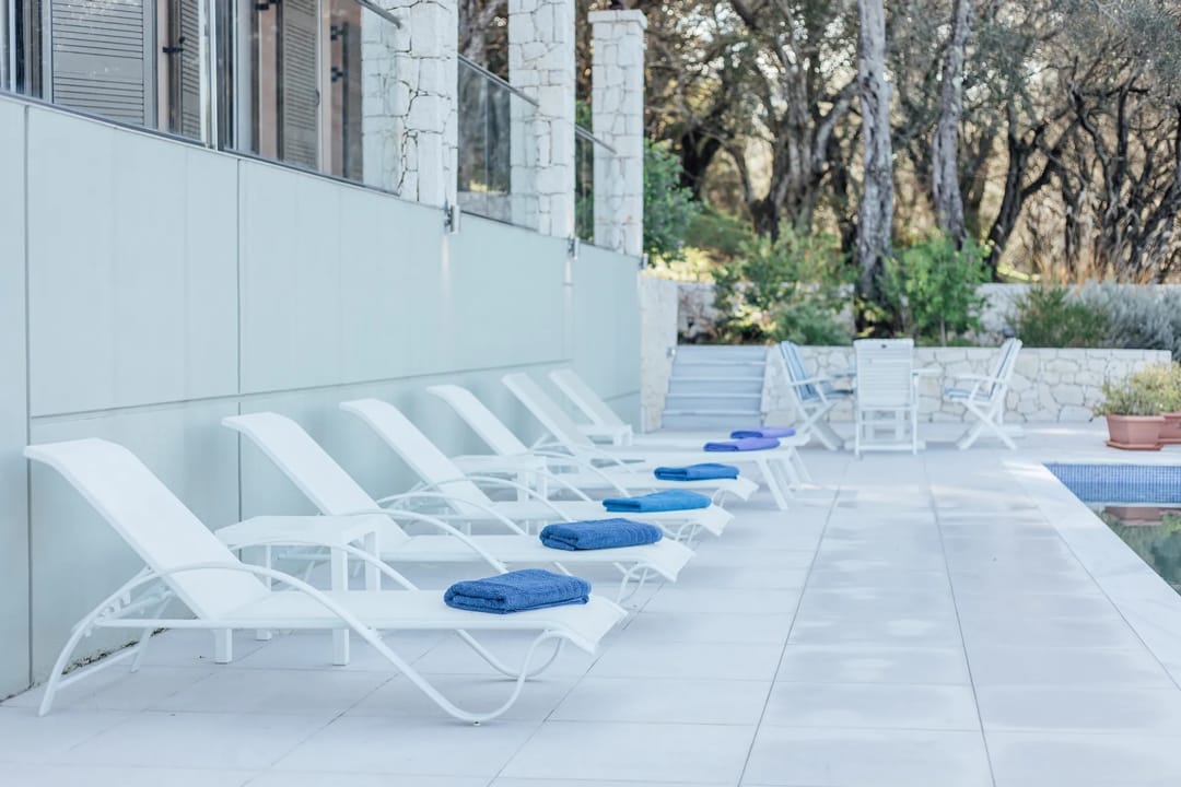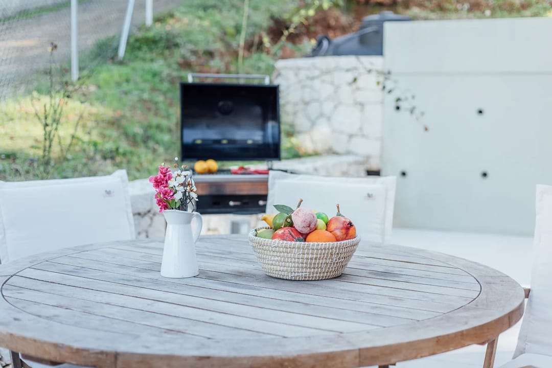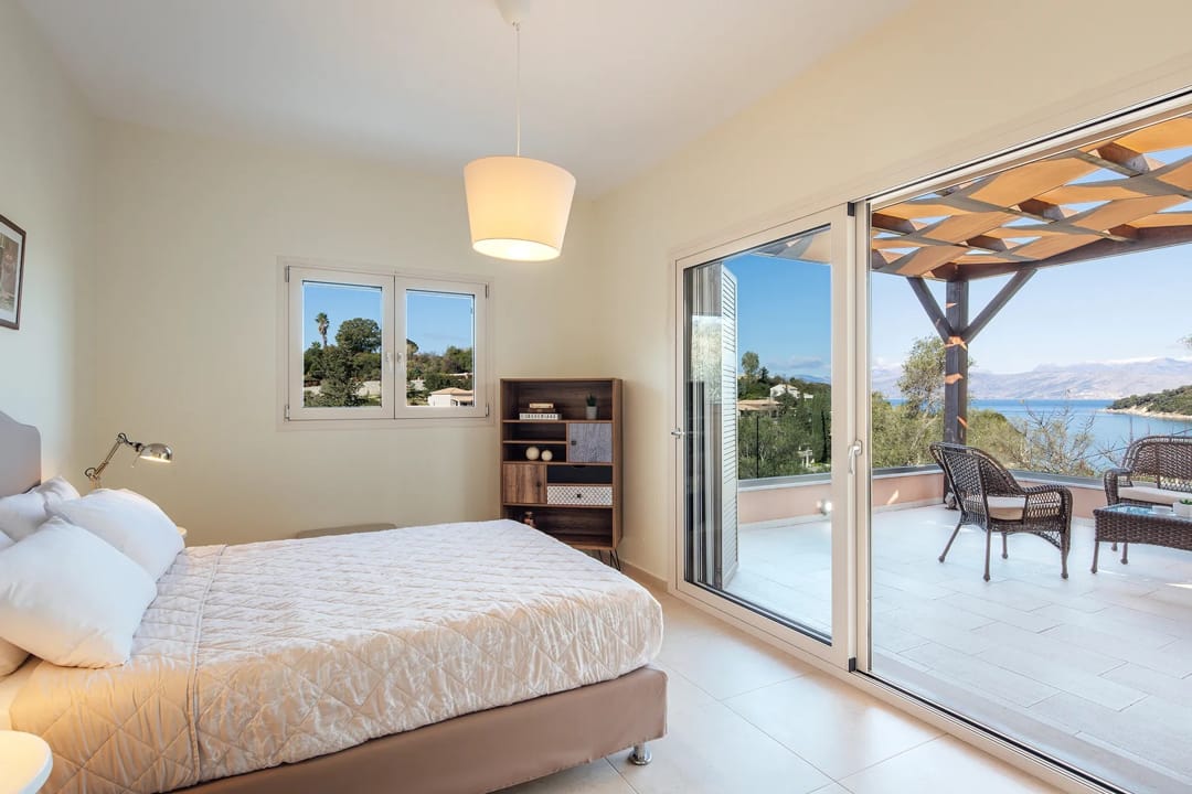 The villa features a private outdoor pool, a cozy furnished veranda, a barbecue area, stylish decor, and a balcony offering stunning views of the Ionian Sea. For larger groups of up to 12 people, it is possible to rent this villa together with a nearby villa, which also offers 3 bedrooms and a private pool.