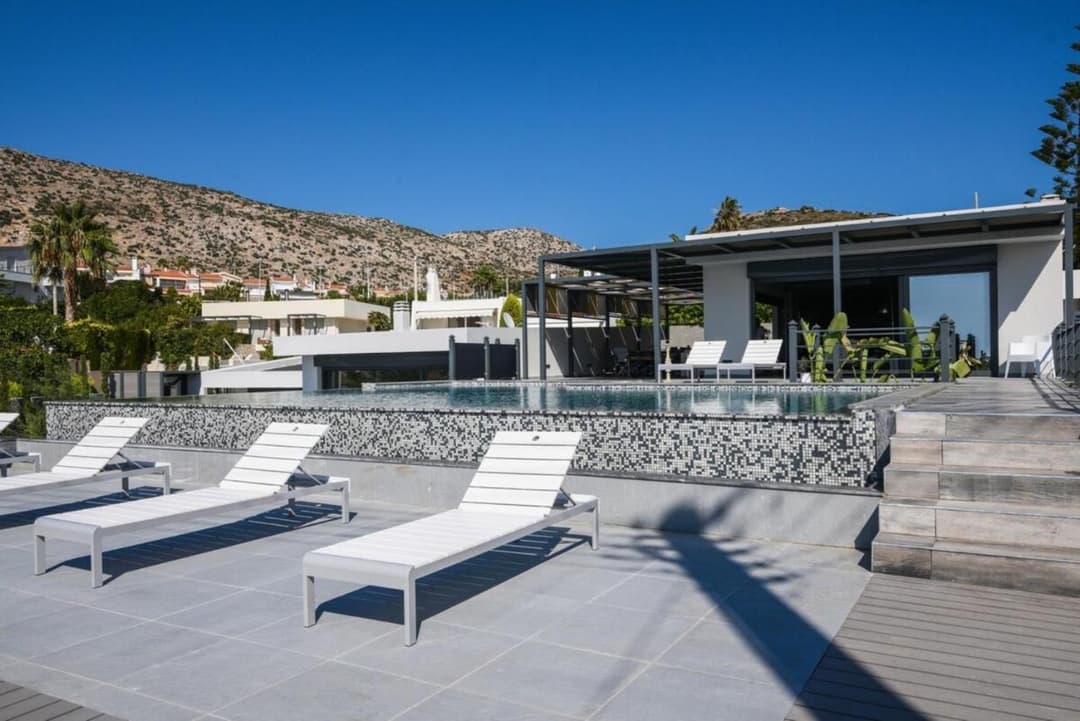Luxury spacious seafront villa Celin with 7 bedrooms, 2 private pools, and panoramic sea views, located in the beautiful coastline of Athens Riviera for rent.