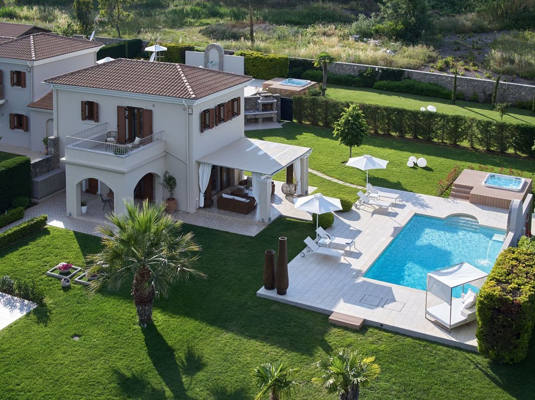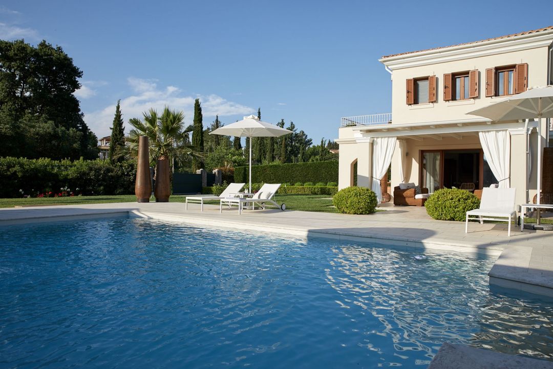 The villa is located in the complex of private villas and is ideal for a comfortable stay close to the beach and for relaxing holidays in Dassia village, one of the best locations in Corfu. A magnificent terrace offers access to the spacious garden with a gazebo, private swimming pool, and outdoor jacuzzi.