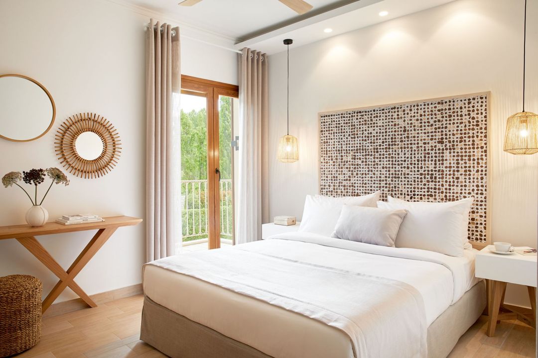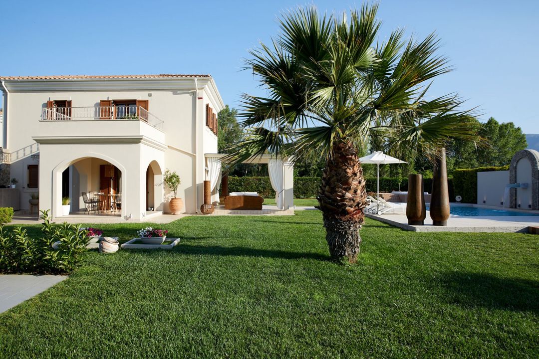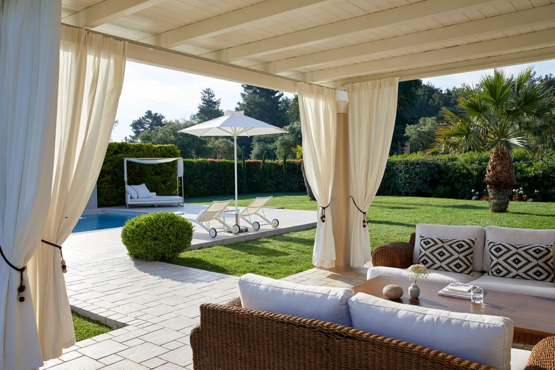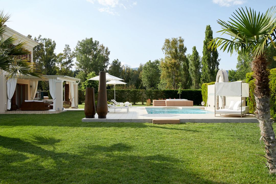 Modern luxury 2-bedroom villa Danai with private pool and jacuzzi surrounded by private gardens, in an amazing location, only 120 m from the beach, on the island of Corfu for rent.