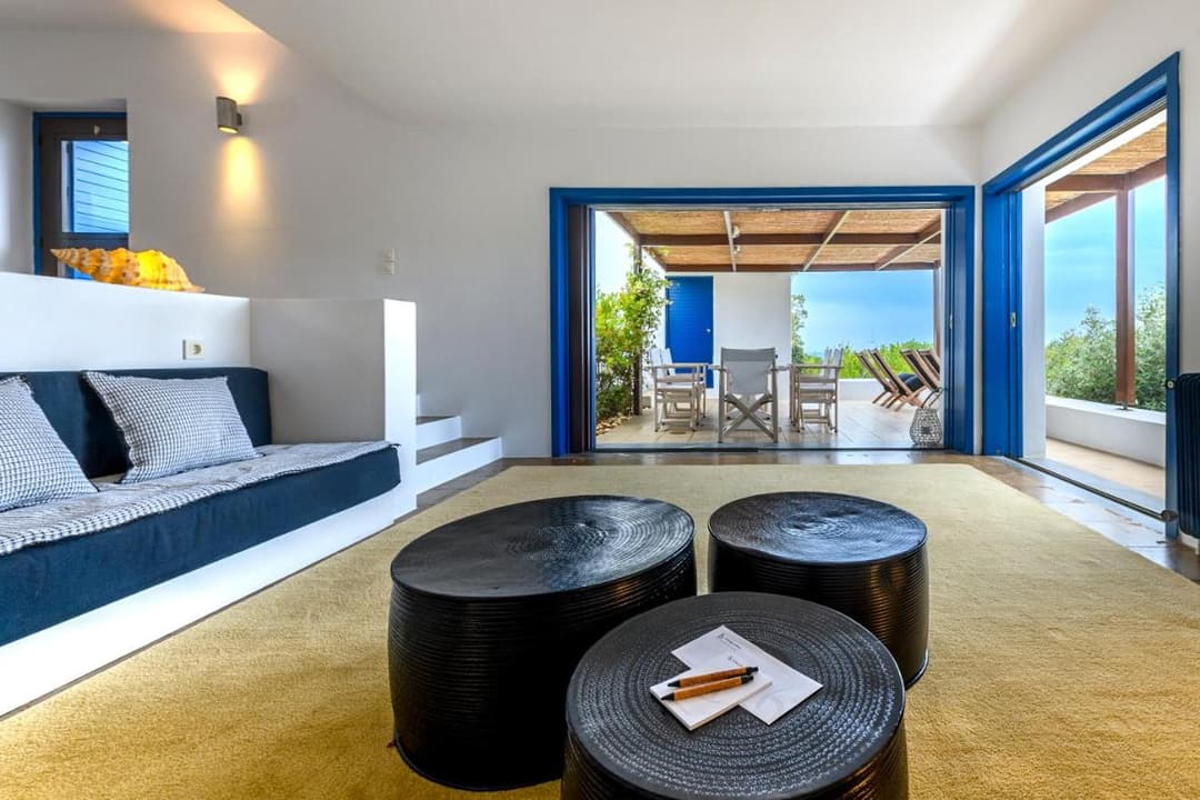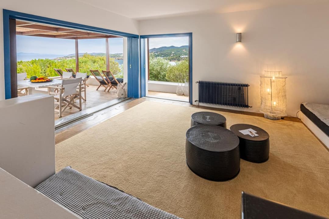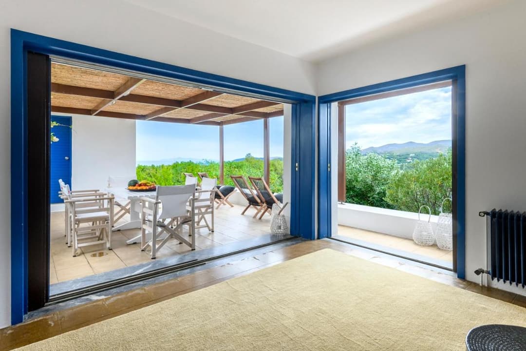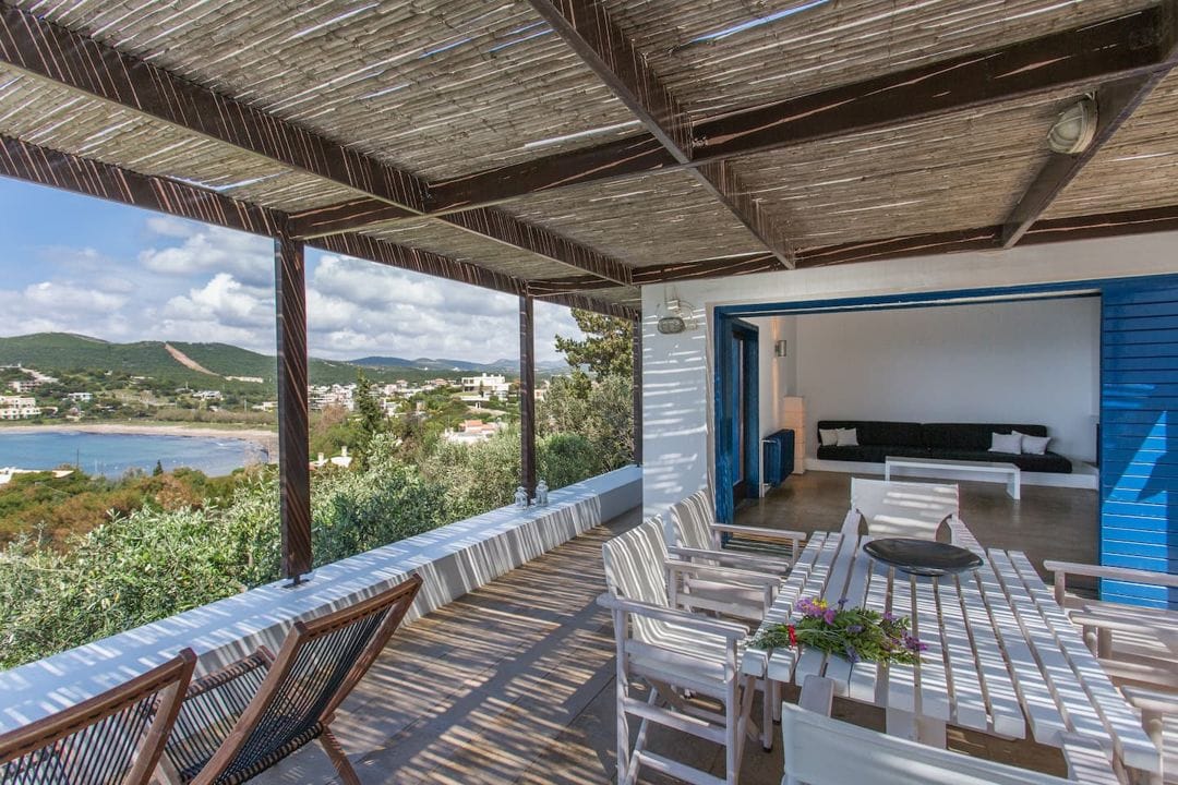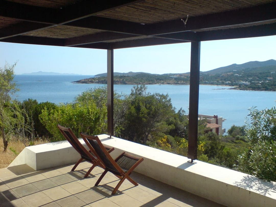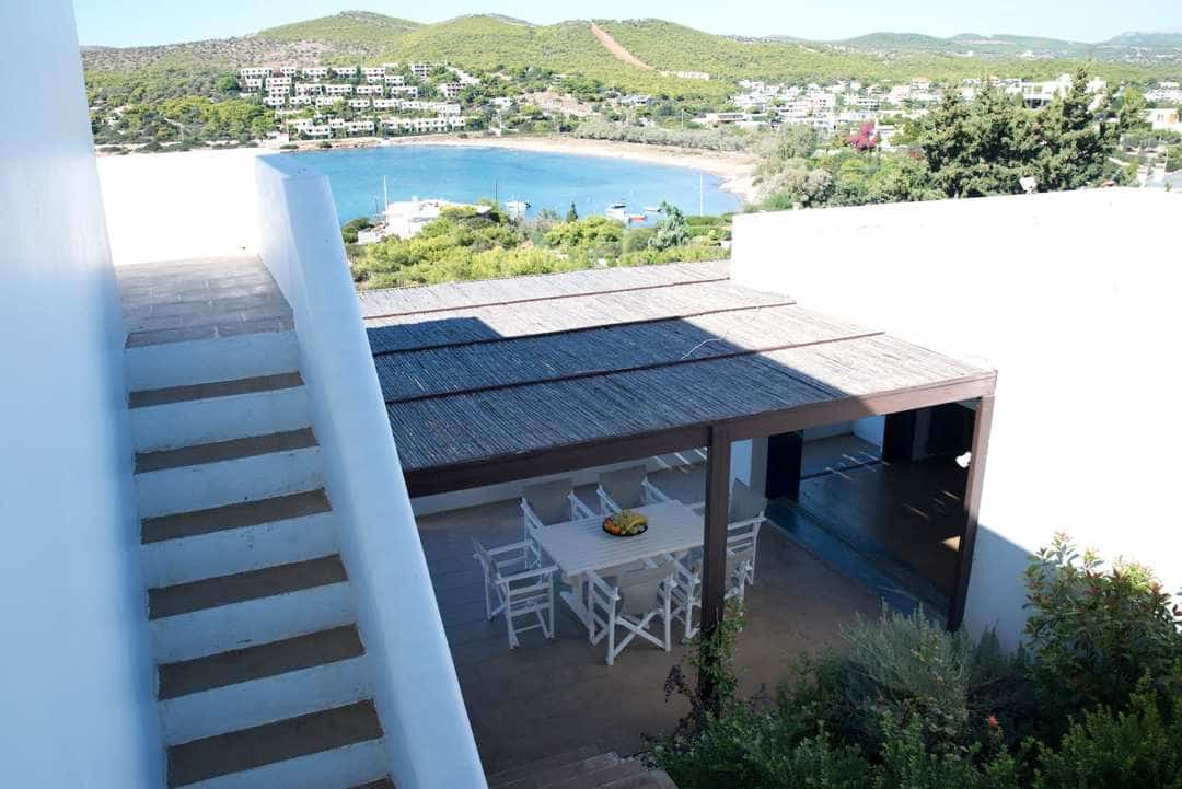 Spacious villa Deni with 6 bedrooms, located on a hill and providing a breathtaking view to the Aegean sea, only 60 meters from the beach, next to the Cape Sounion, on the East Coast of Attica for rent.
