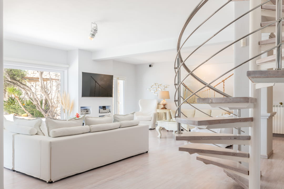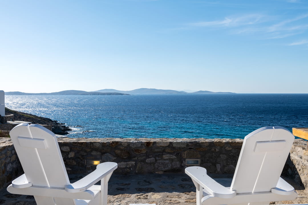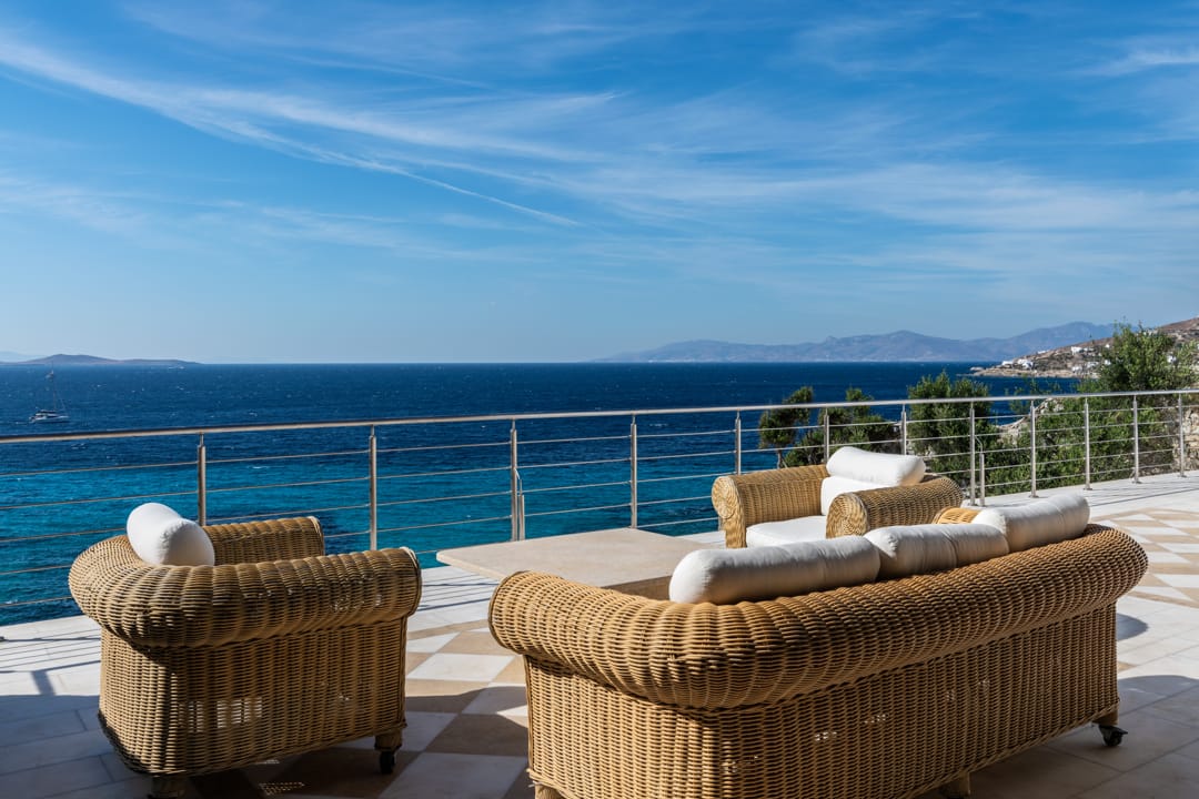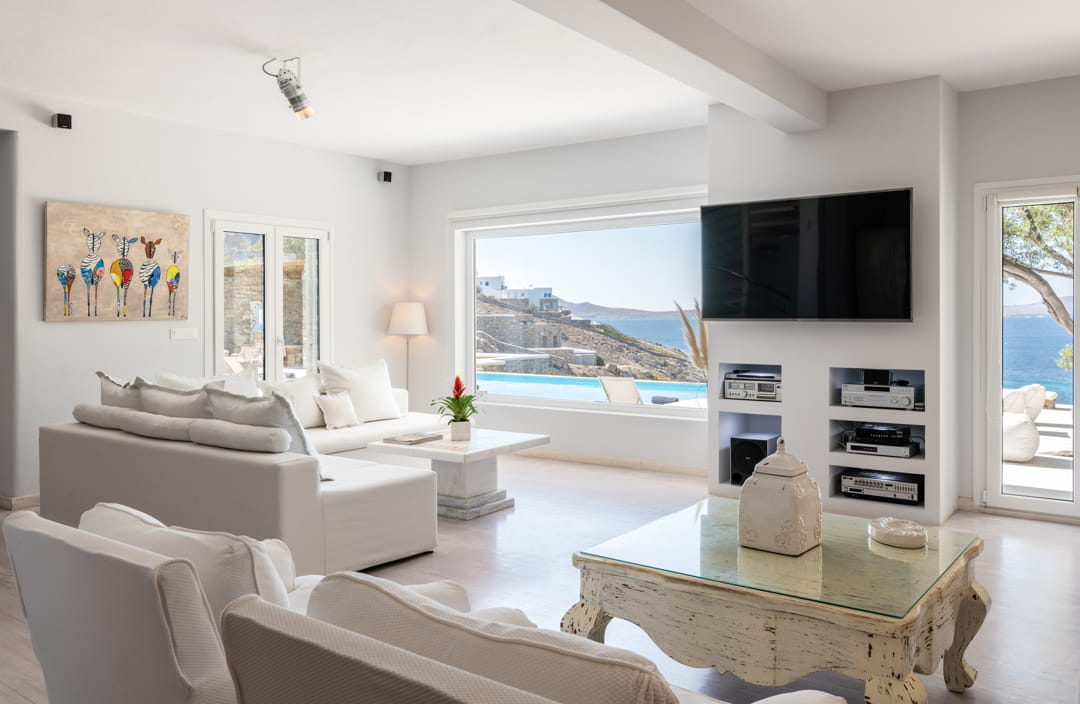- A vast living room (93 sq m), with two seating areas that can easily host up to 15 people. The living room has direct access to the pool area and a unique view of the Aegean Sea and Delos Island, while there is a unique sunset view as well. It is equipped with a 60’ Smart TV and sound system.
