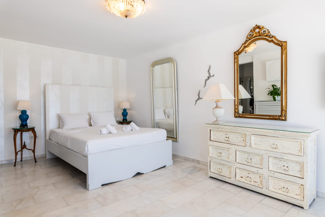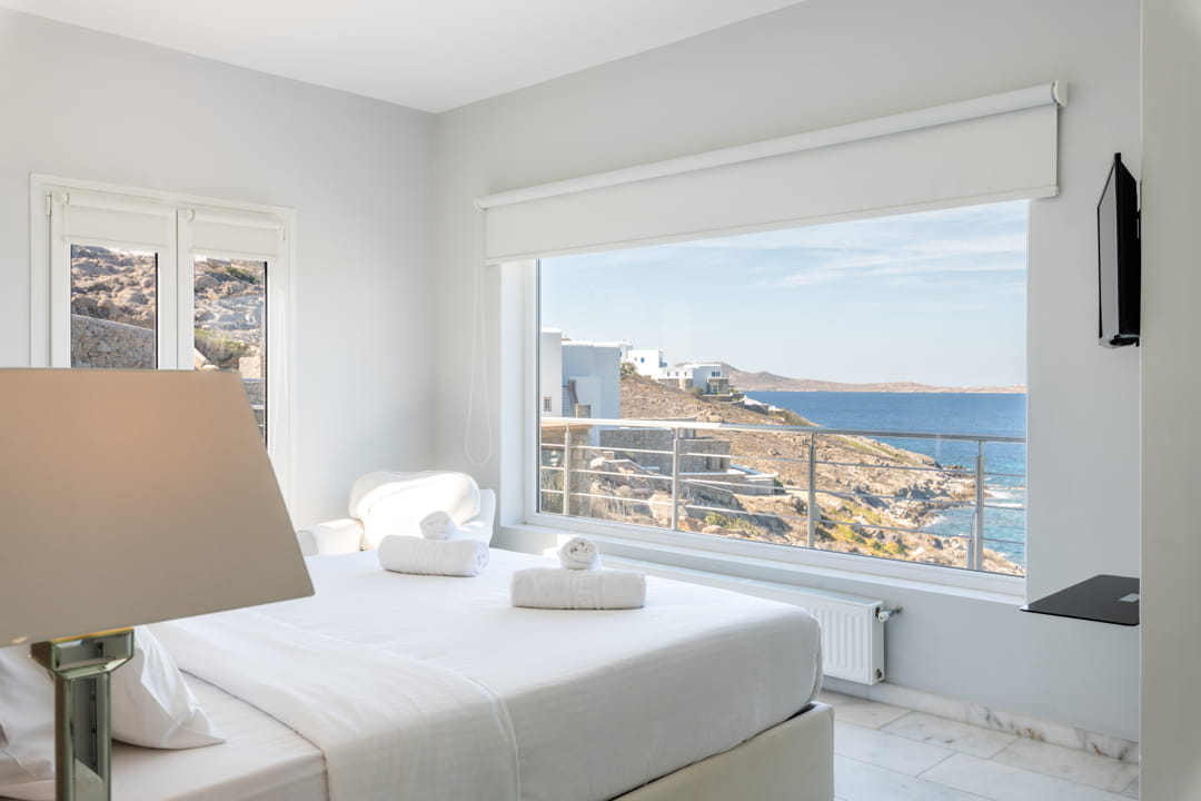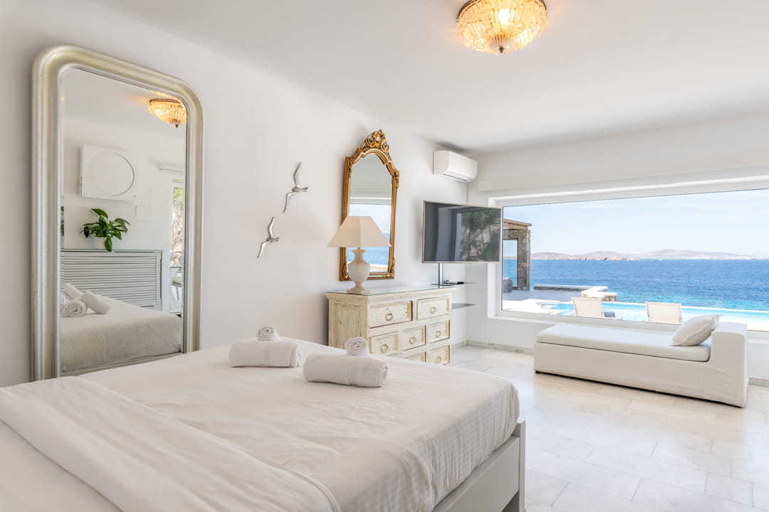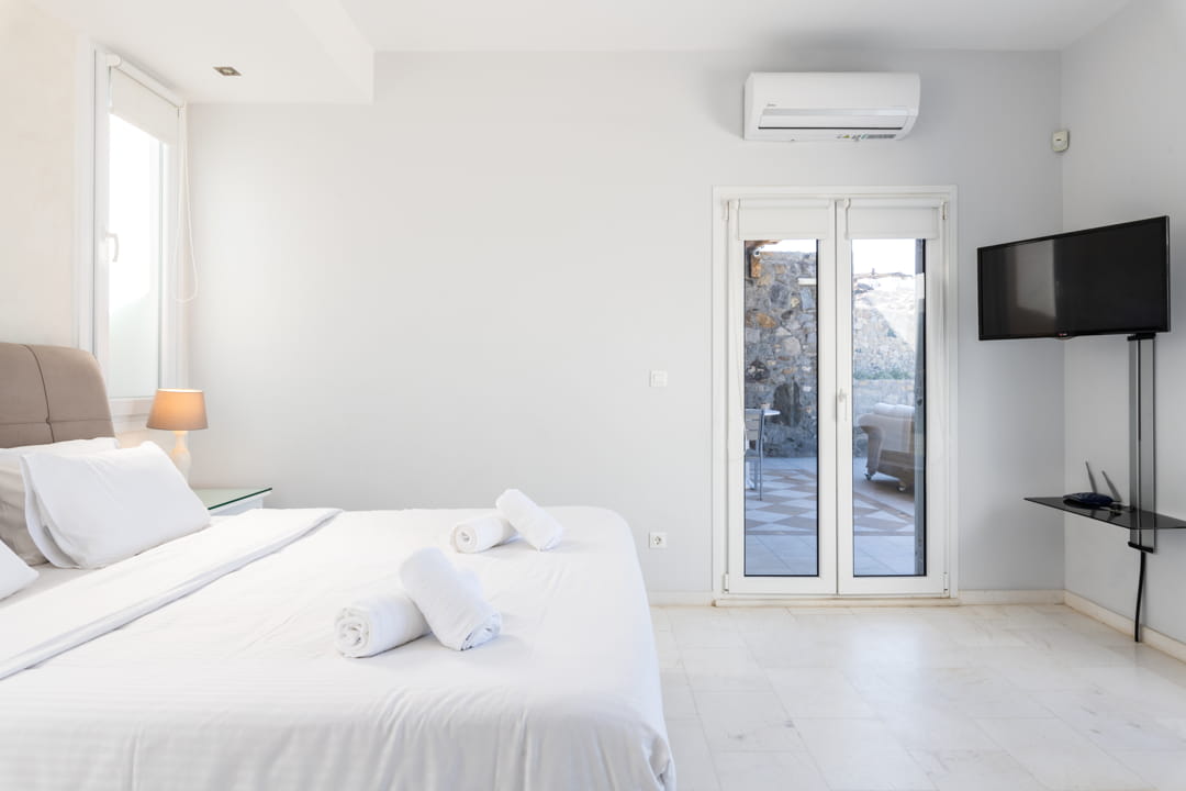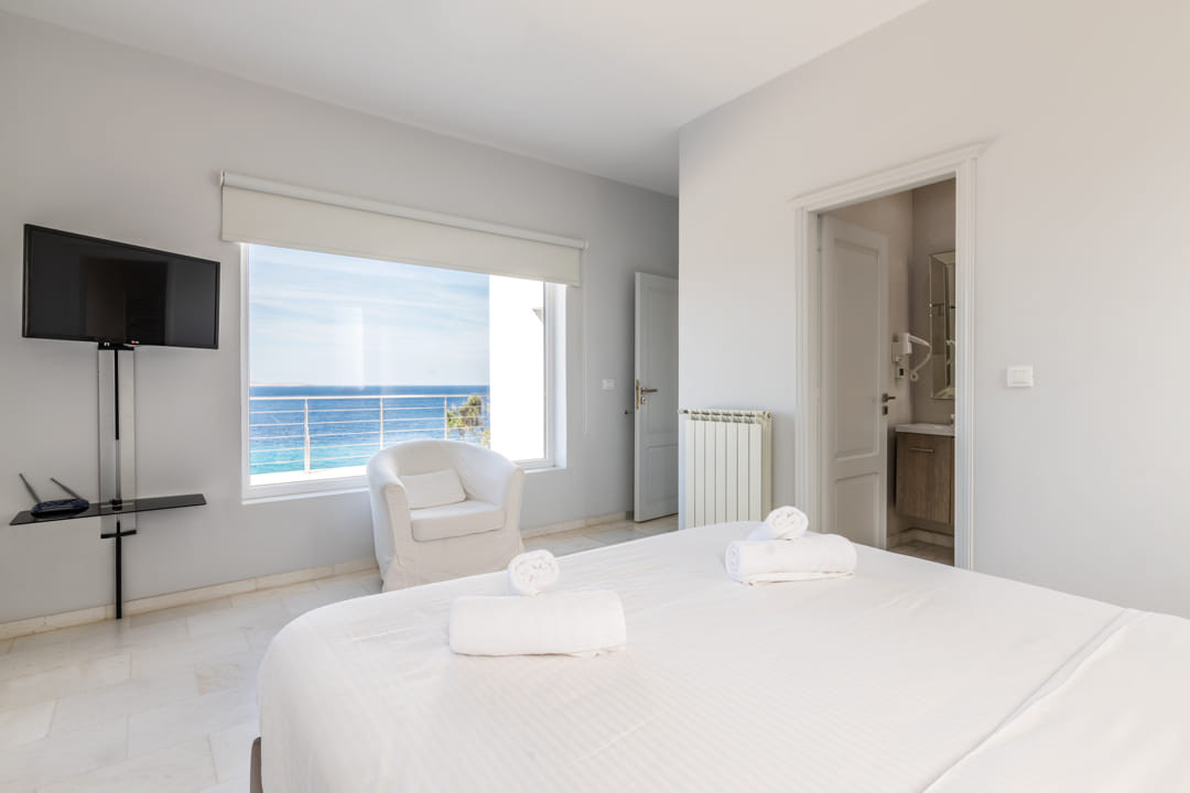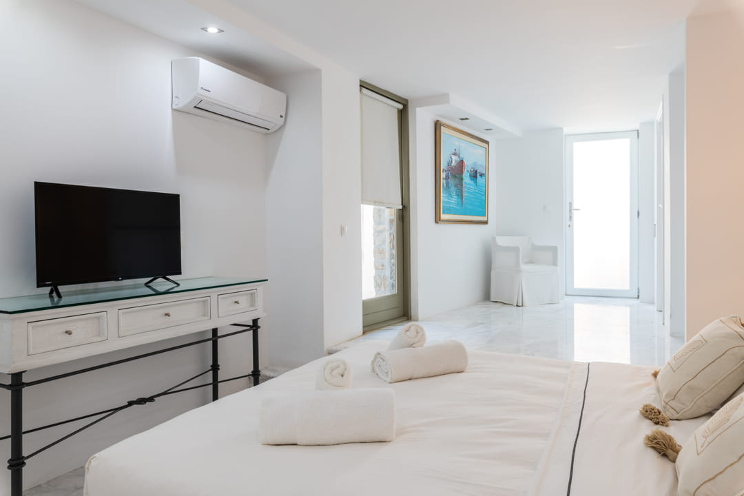 - 1st master bedroom (31,6 sq m) with Queen Size bed and ensuite bathroom. Access to the pool area. View to the sea, Delos Island, and sunset. The room is equipped with a TV 55’, a hairdryer, air conditioning, a safe box, and toiletries.