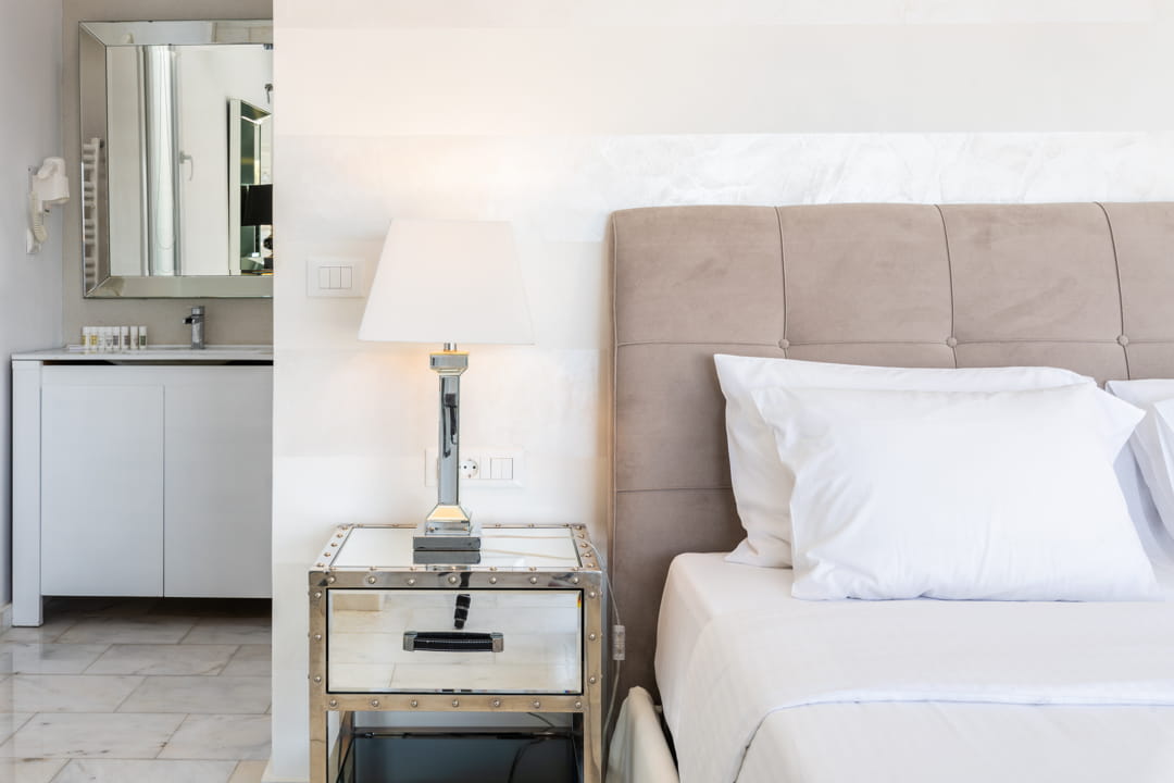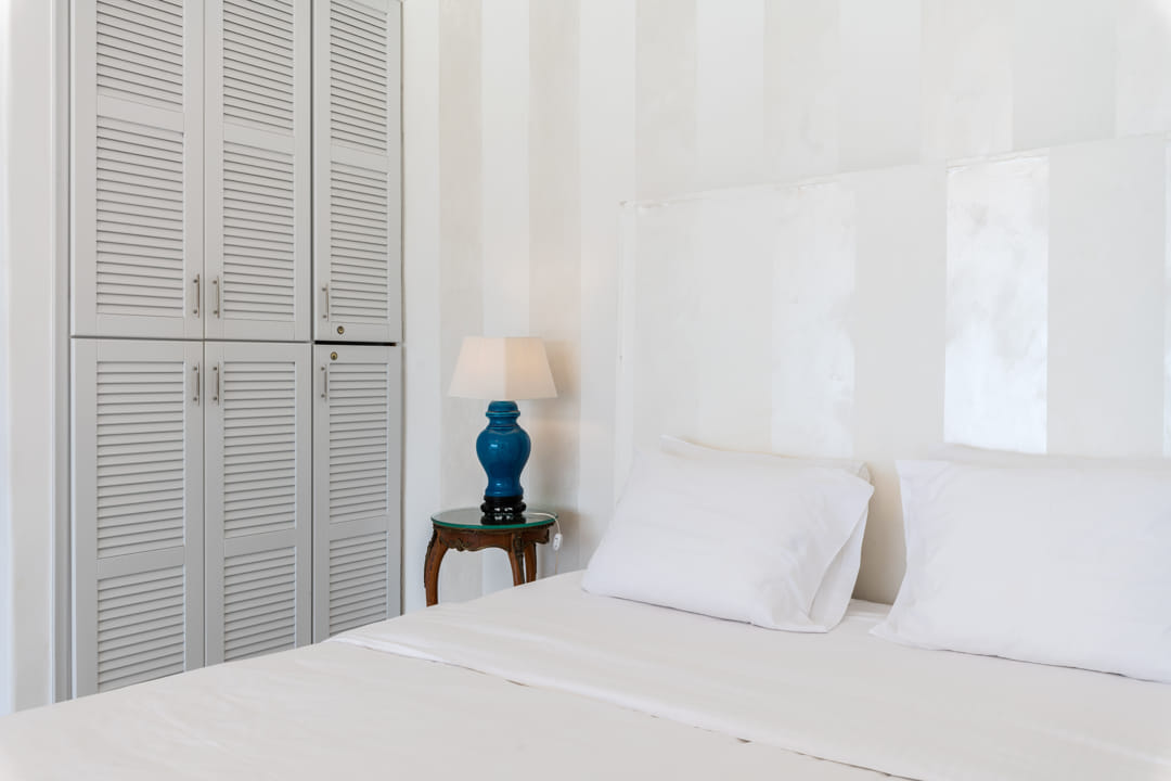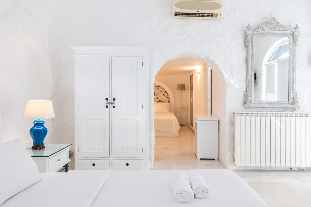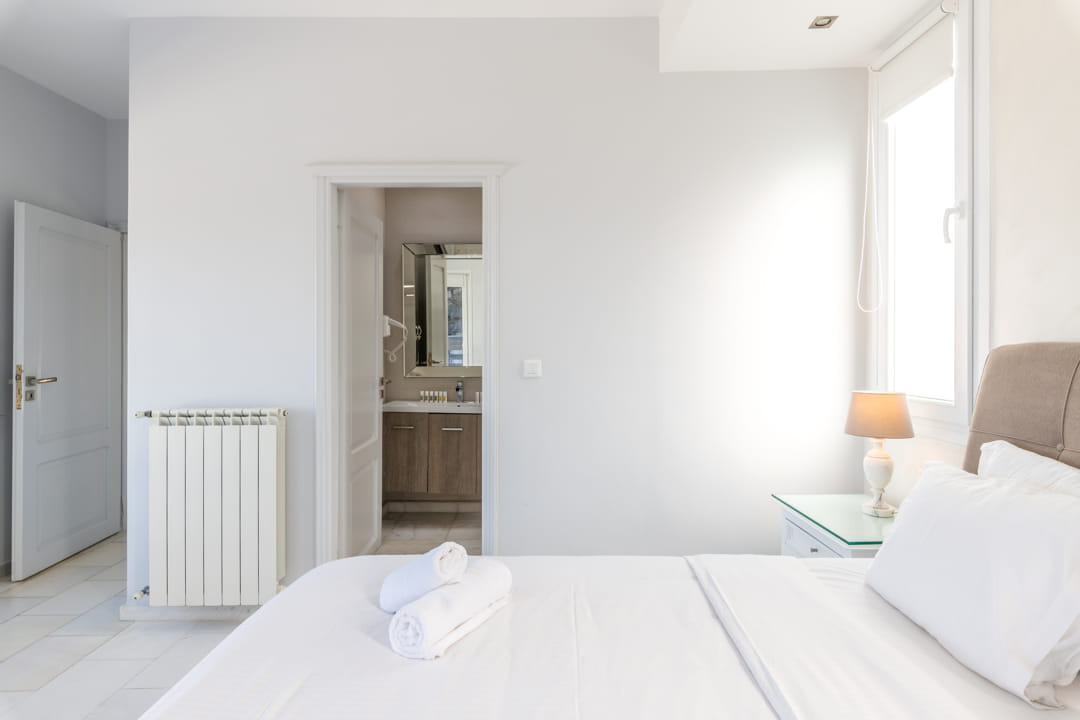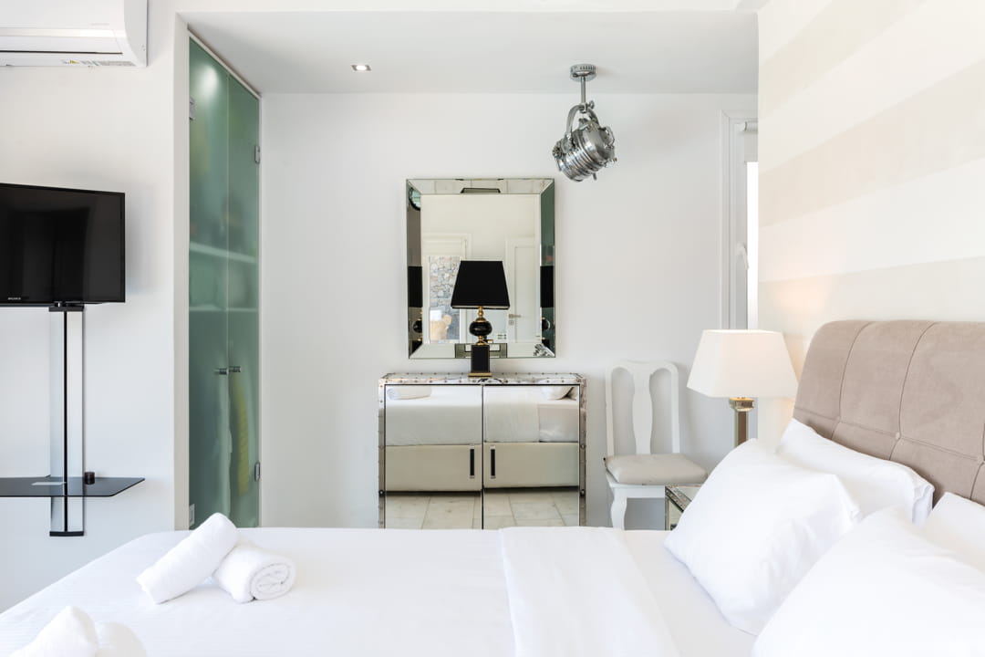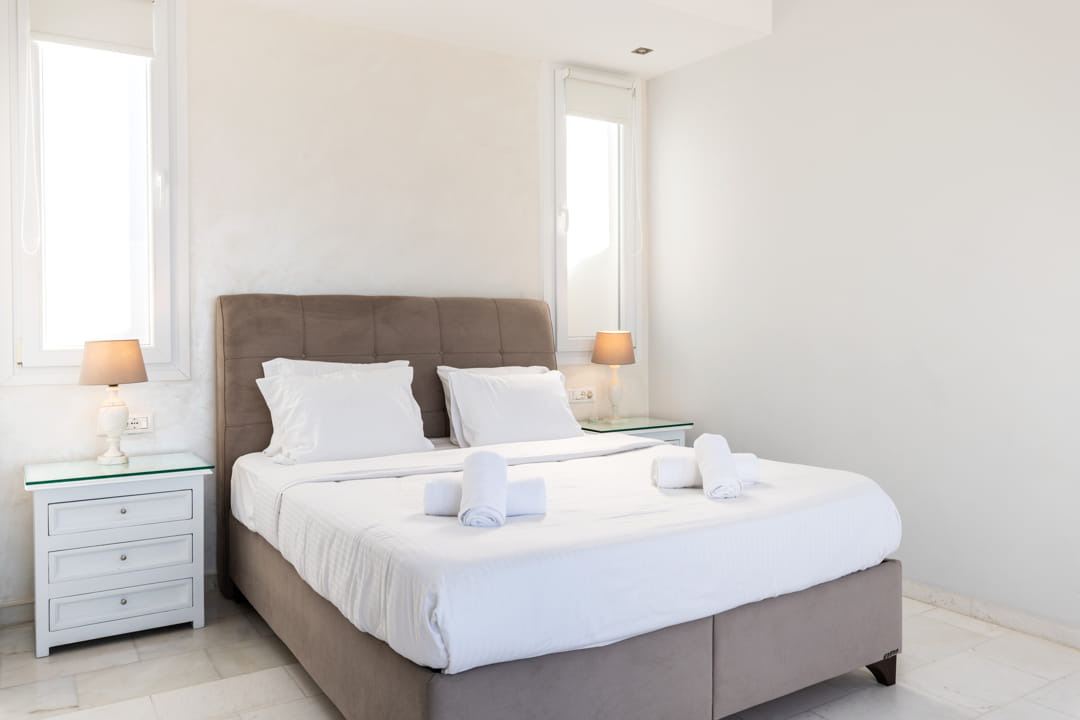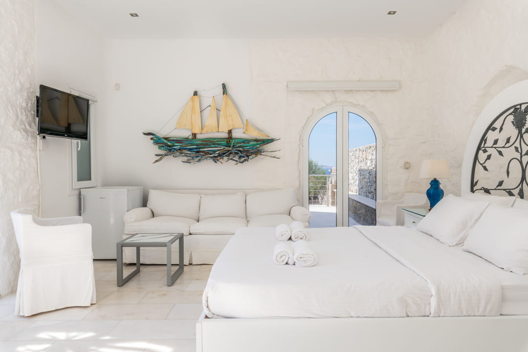 - 1st master bedroom (31,6 sq m) with Queen Size bed and ensuite bathroom. Access to the pool area. View to the sea, Delos Island, and sunset. The room is equipped with a TV 55’, a hairdryer, air conditioning, a safe box, and toiletries.