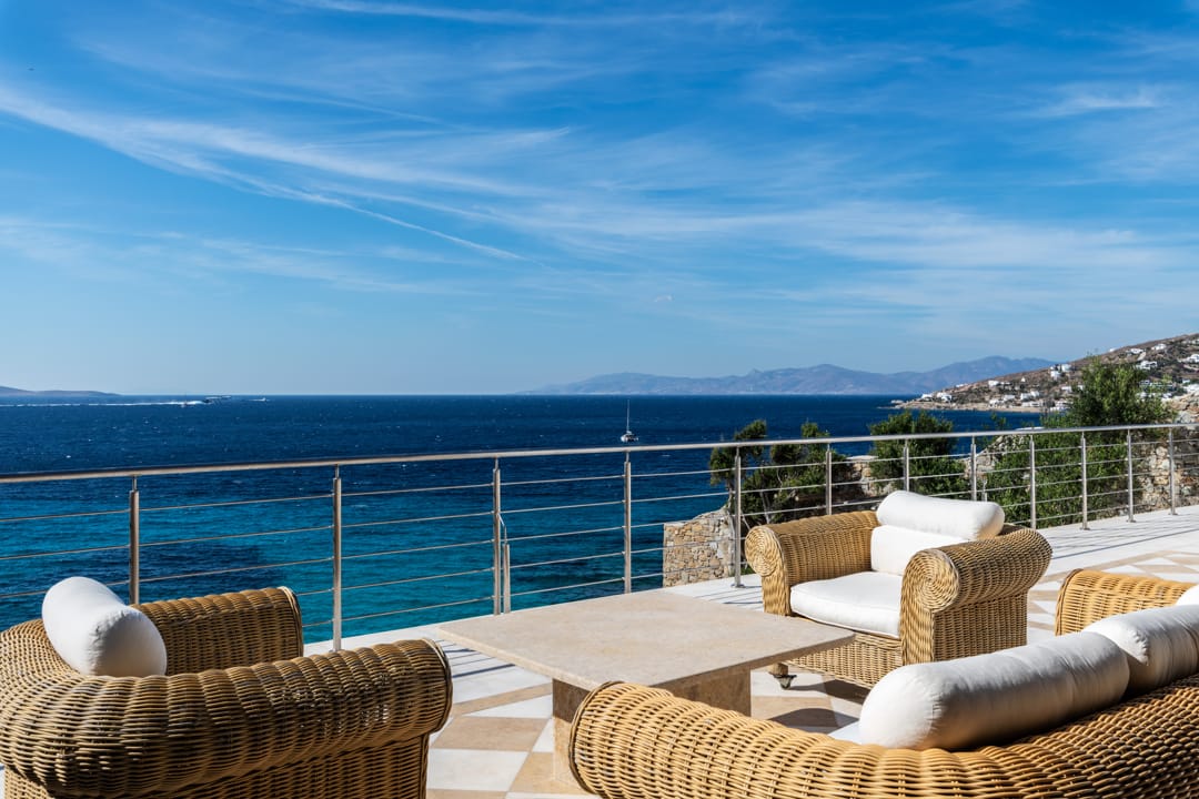 This modern luxurious seafront residence with some vintage elements that makes it unique is located in the Aleomandra area, between Ornos beach and Agios Ioannis Beach.