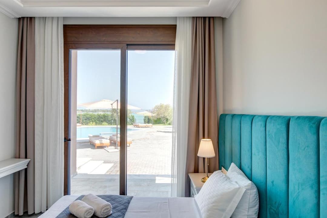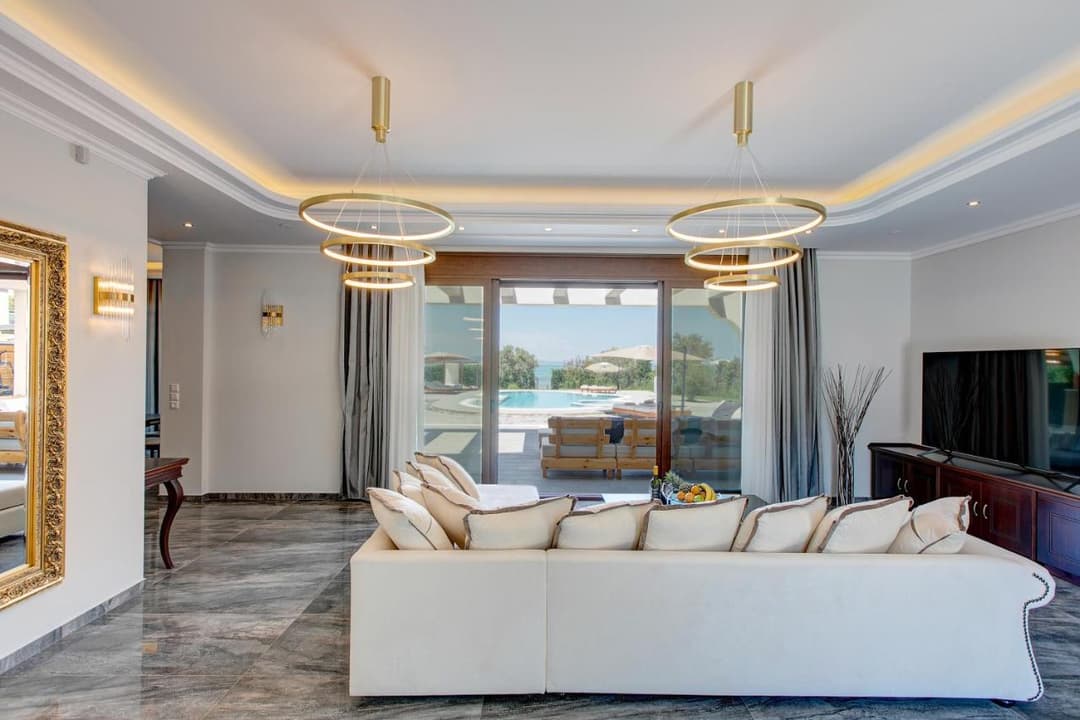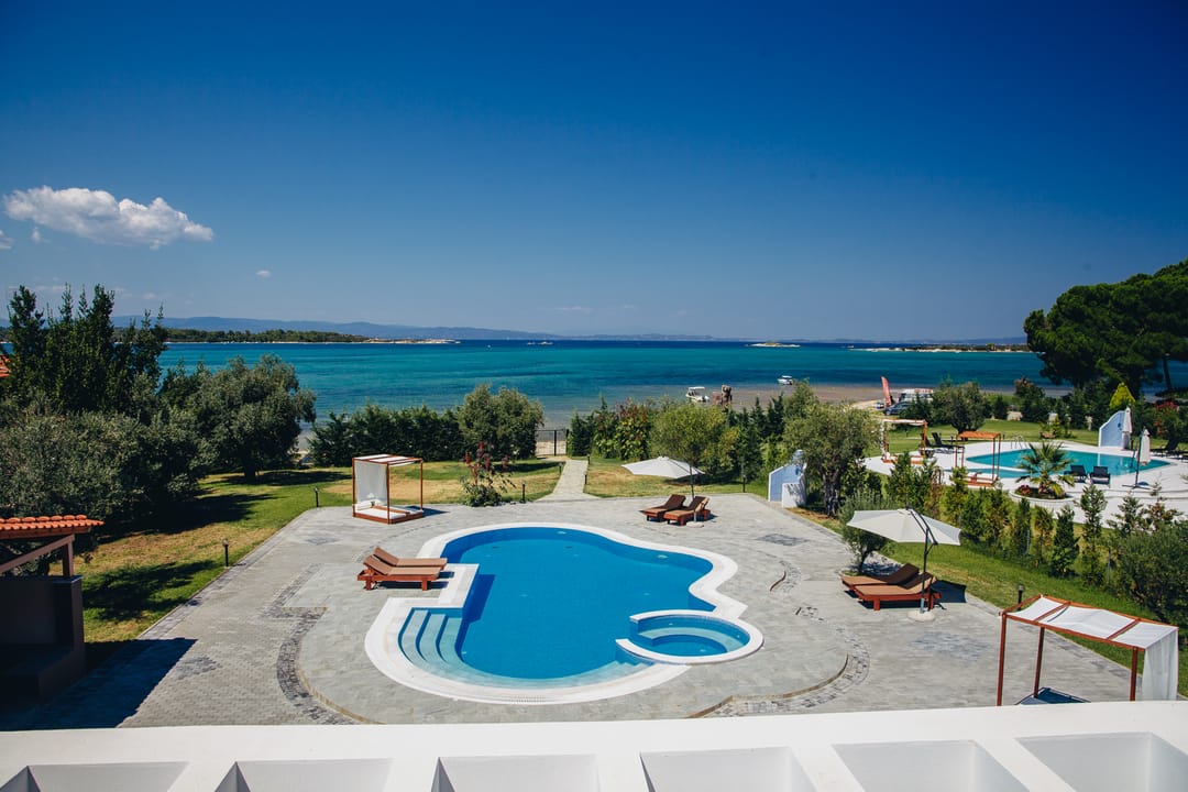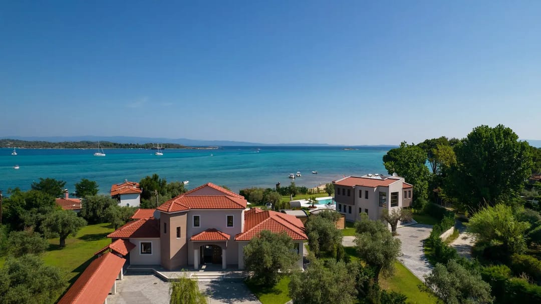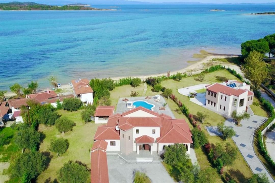 Luxury Villa Electra with 3 bedrooms and a private pool and garden, located right on the beach, in Vourvourou village, Halkidiki for rent.