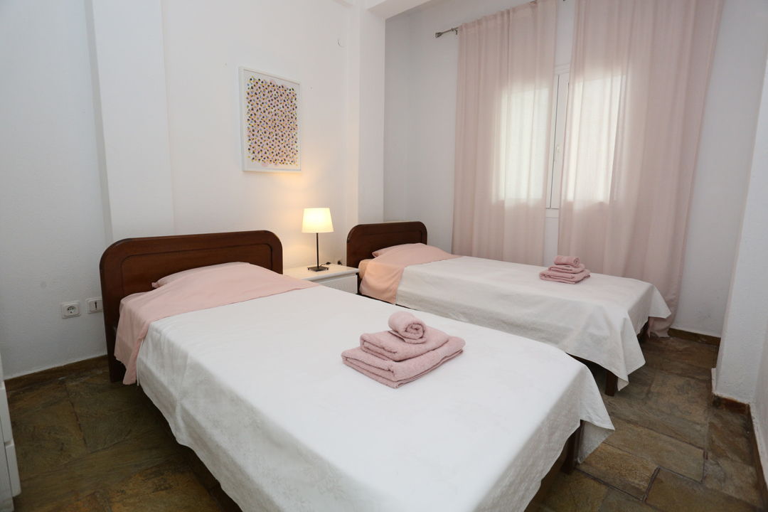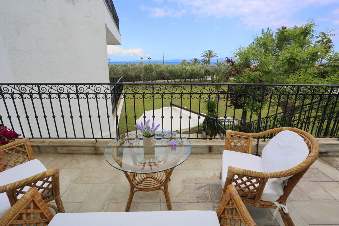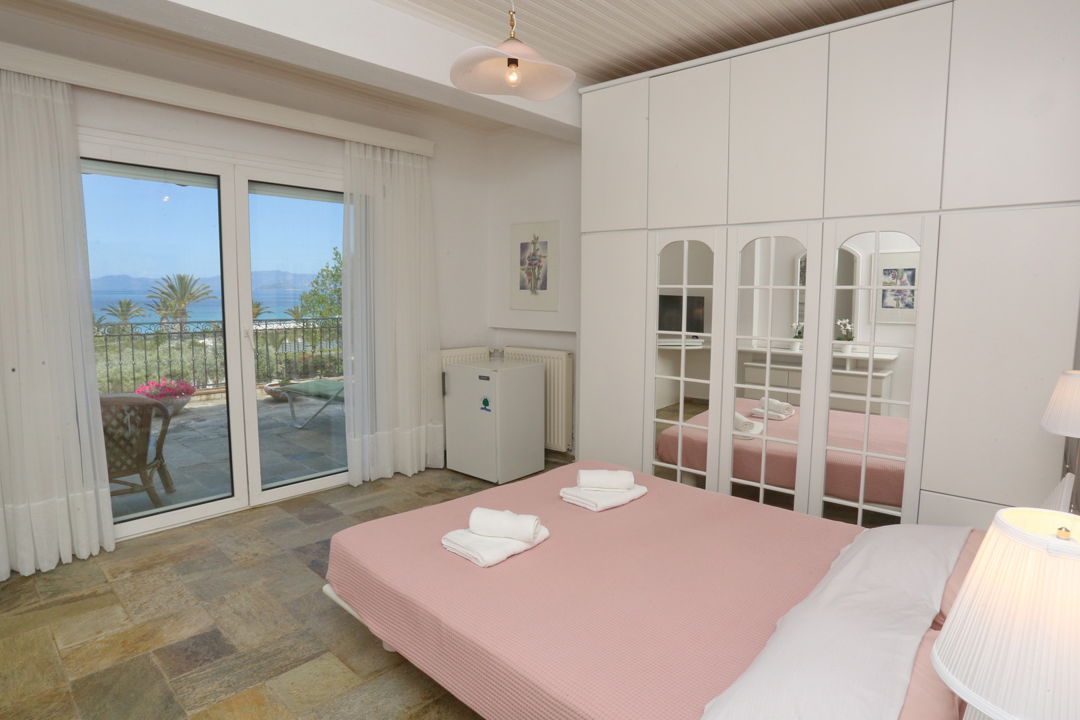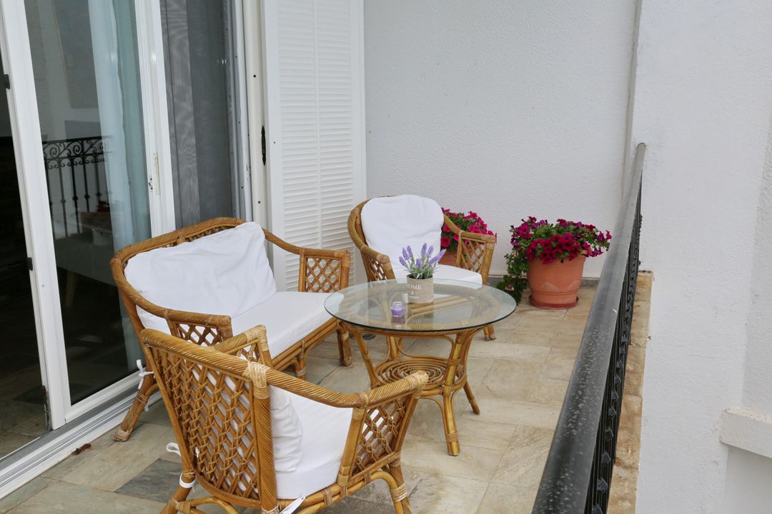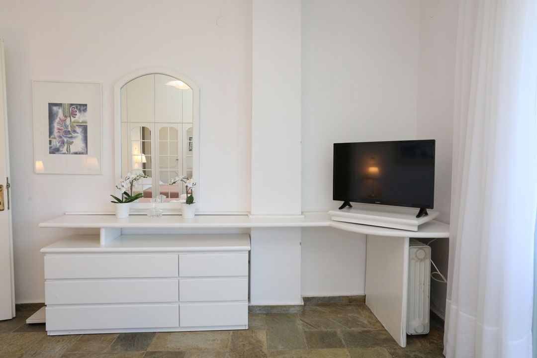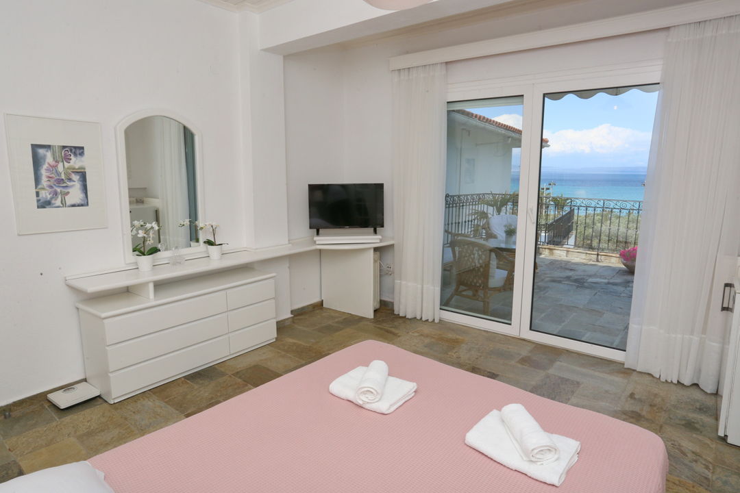 - 2nd bedroom with a double bed, wardrobe, mini-fridge, TV, and a balcony with table and chairs overlooking the sea