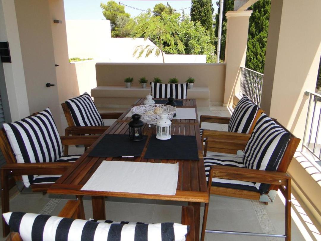- Spacious terrace with dining table overlooking the village of Agios Emilianos and the island of Spetses