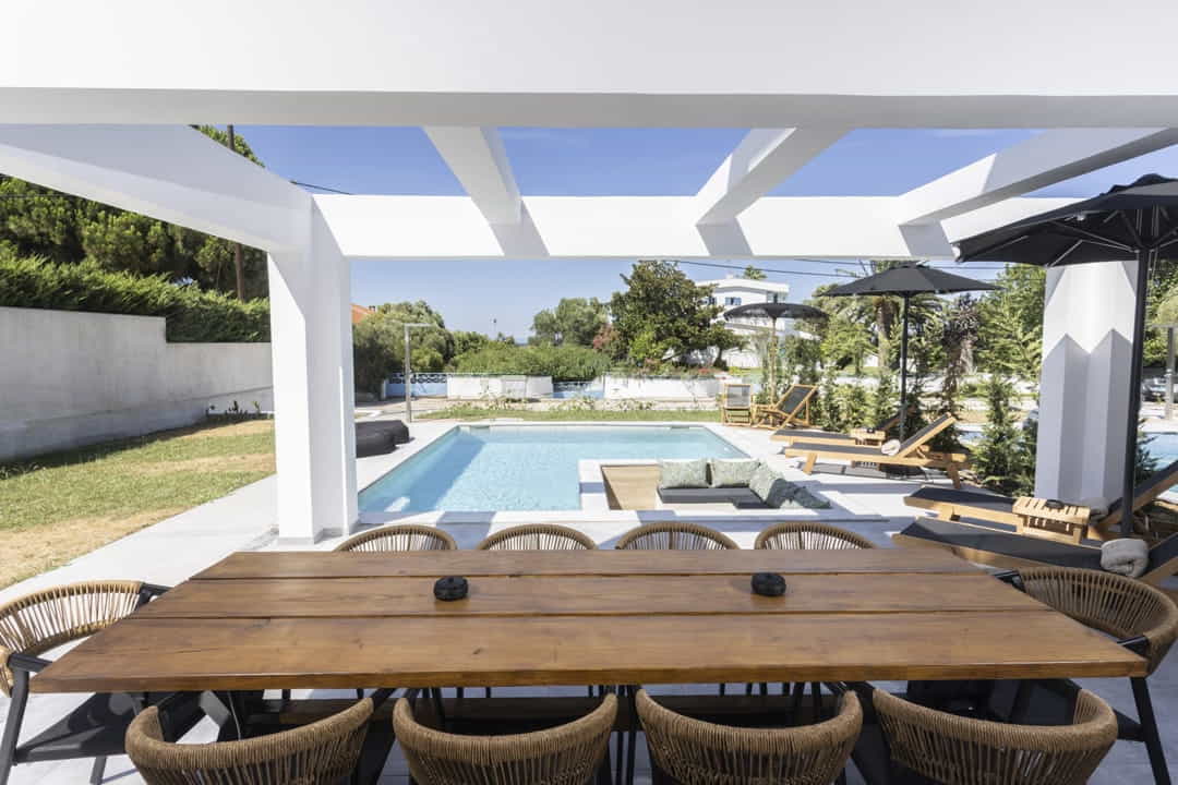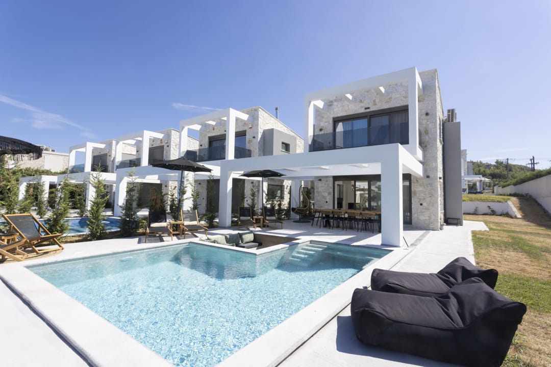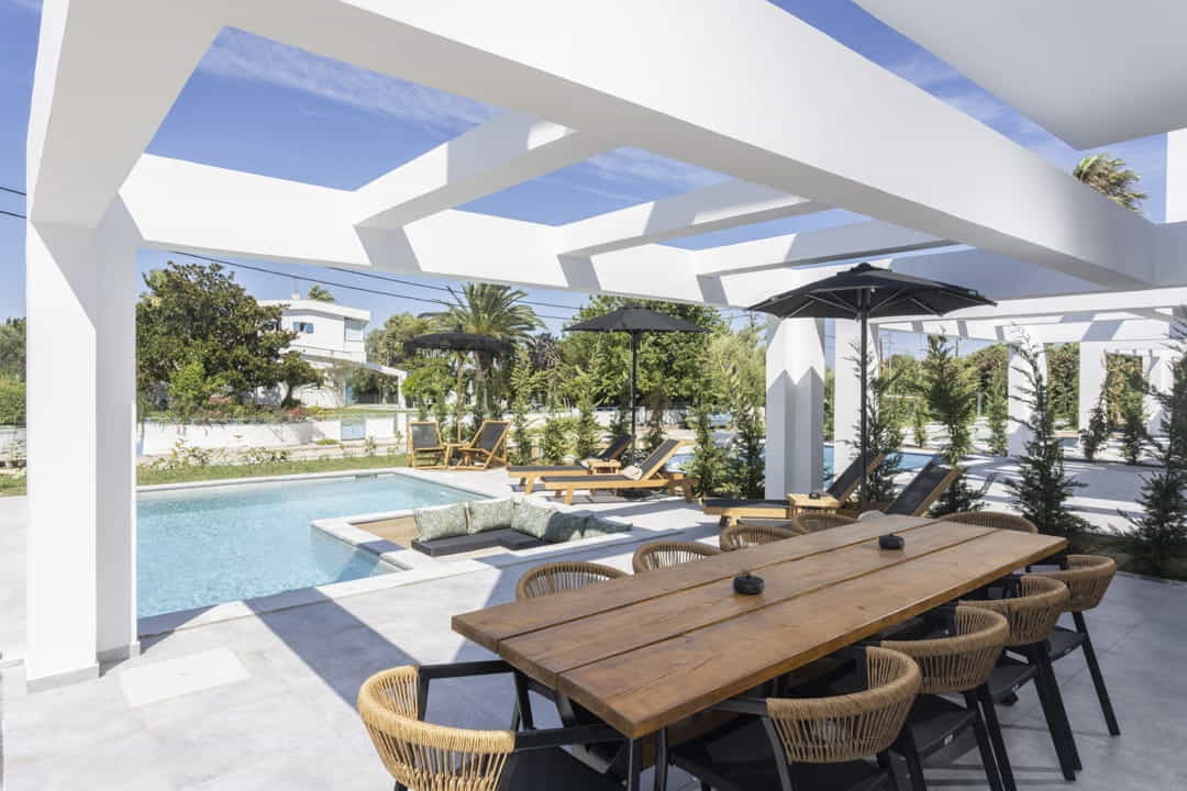 Stylish luxury villa Ford with 5 bedrooms, a private pool, and a charming patio, located just 100 meters from the beach, close to the popular resort town of Hanioti on the Kasandra peninsula, Halkidiki, for rent.