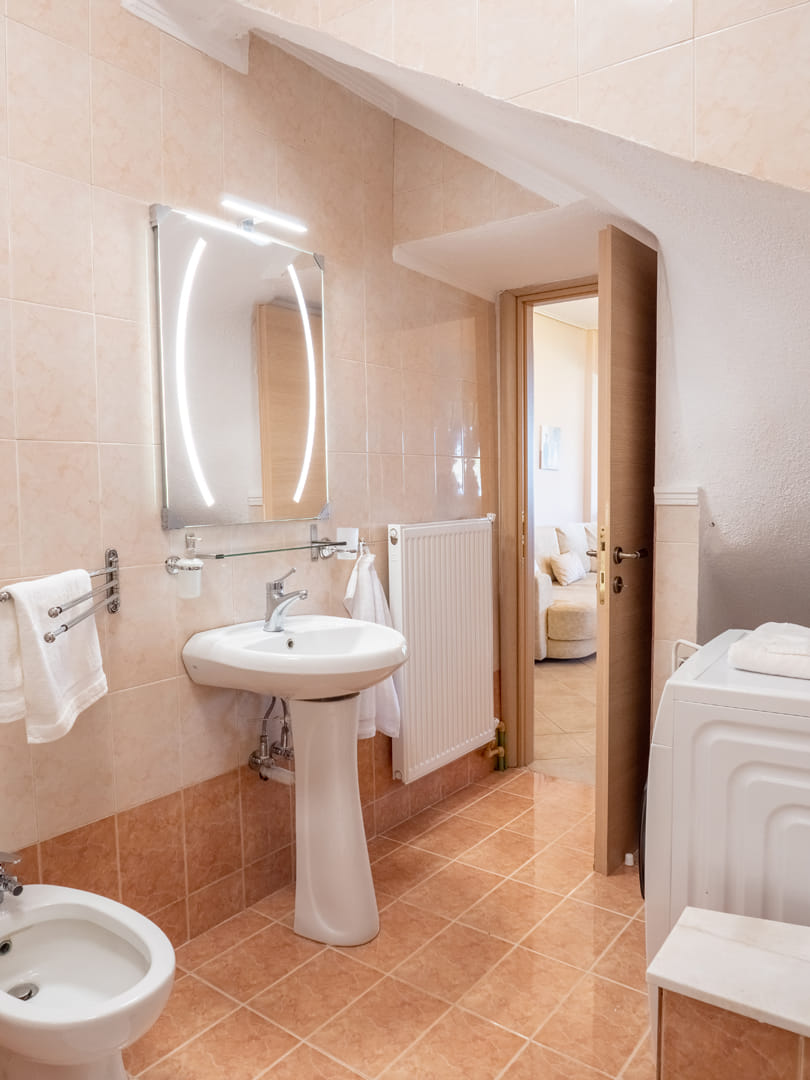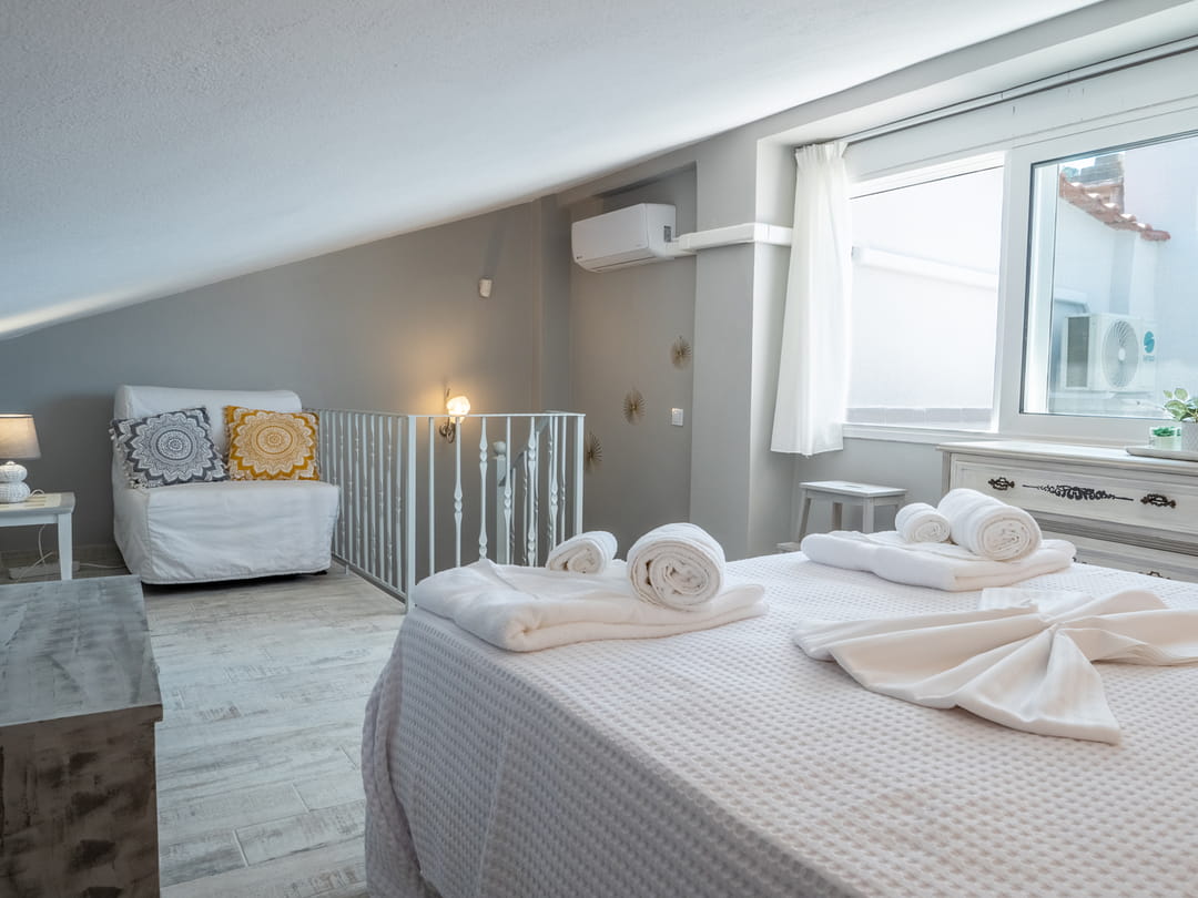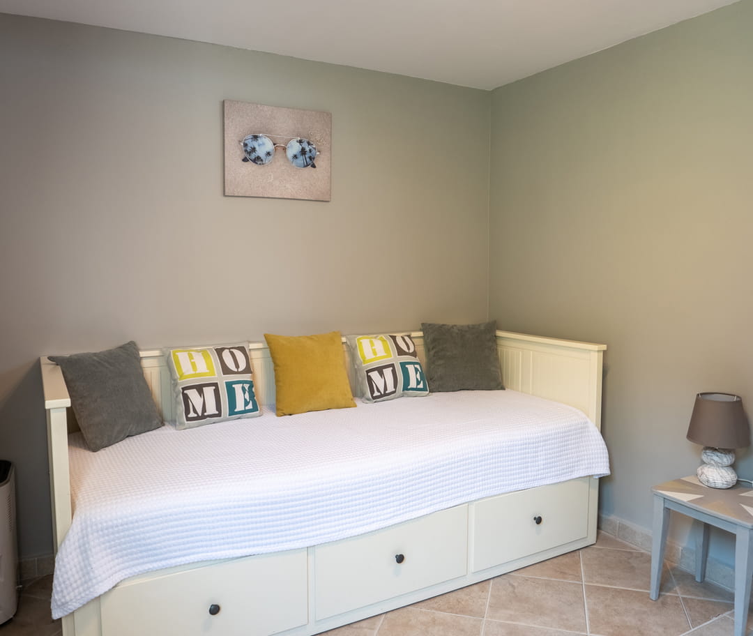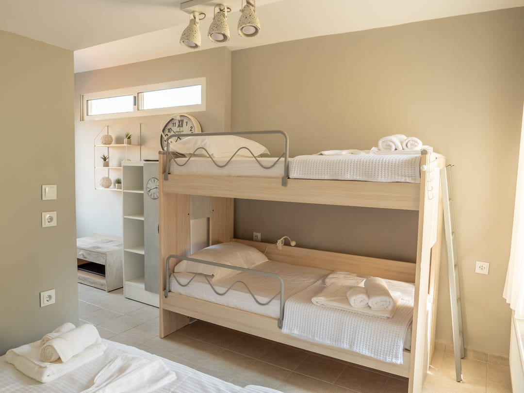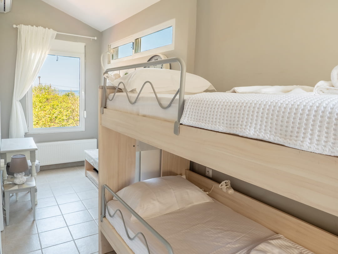 - 2nd children’s bedroom with bunk bed (90×200) and sofa bed with extra mattress of very good quality. The children’s room has a view of the sea and the forest.