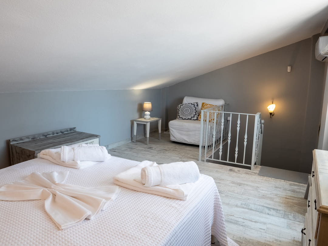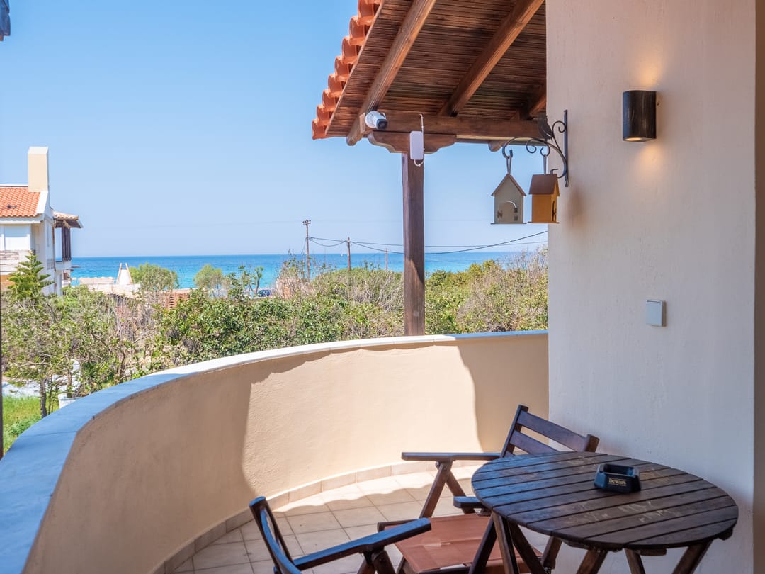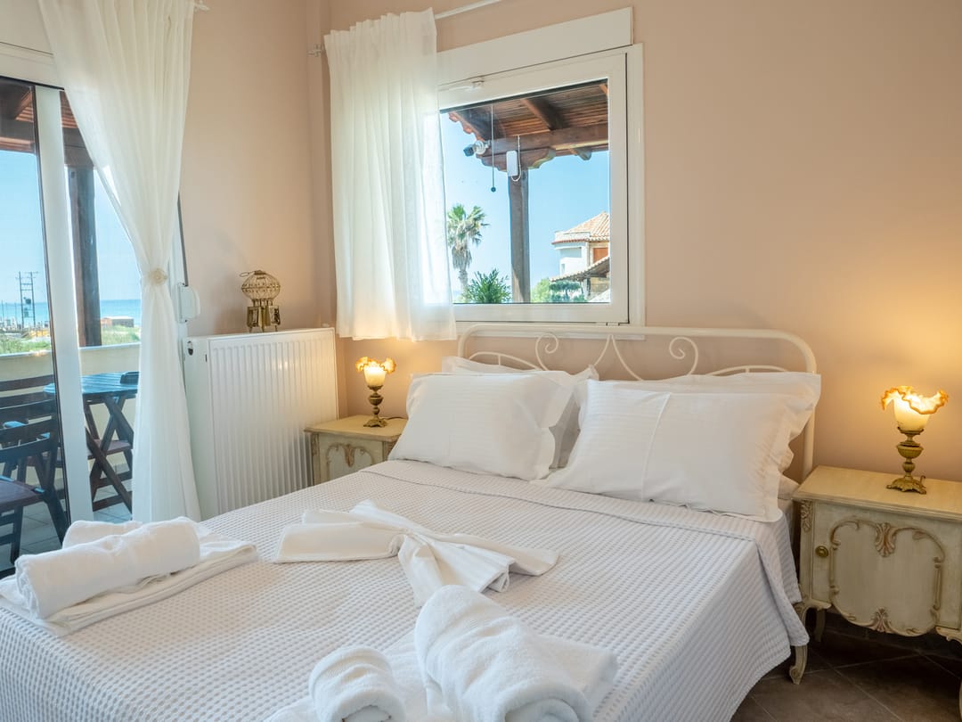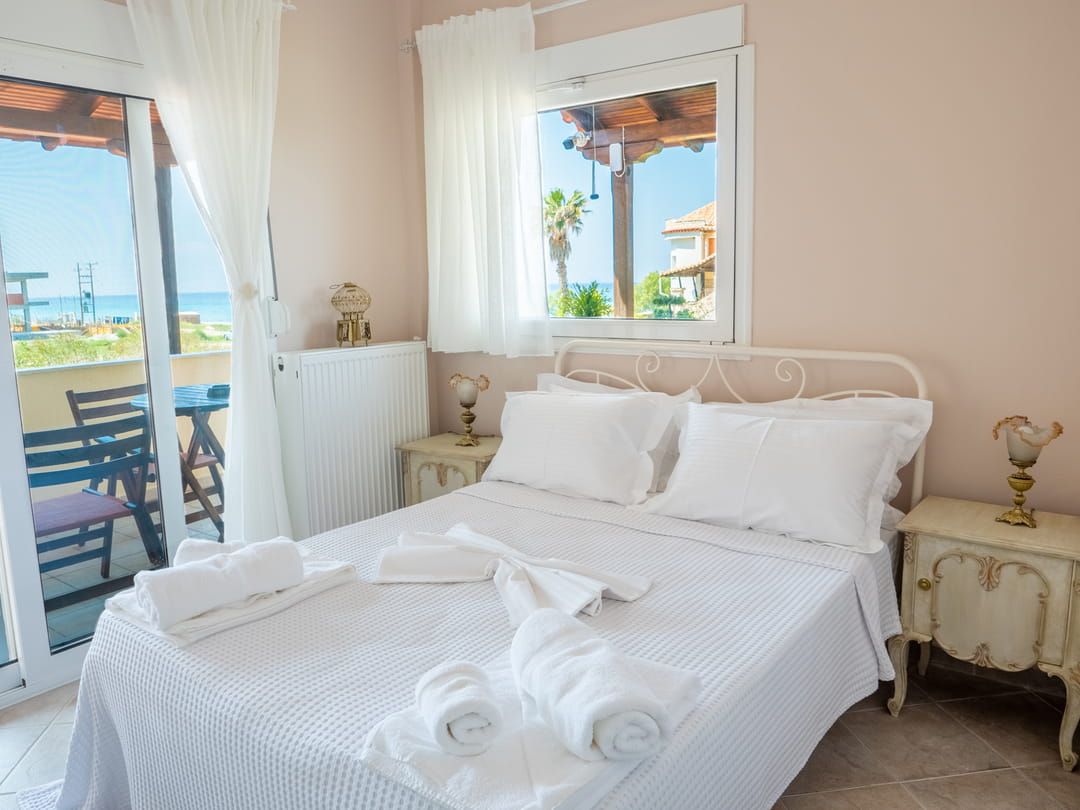 - 1st bedroom with double bed and access to a balcony with garden furniture and sea views
