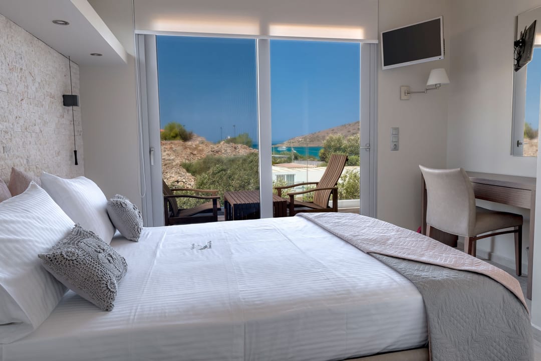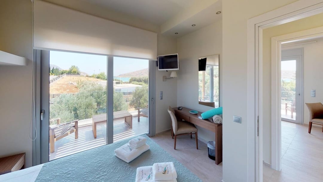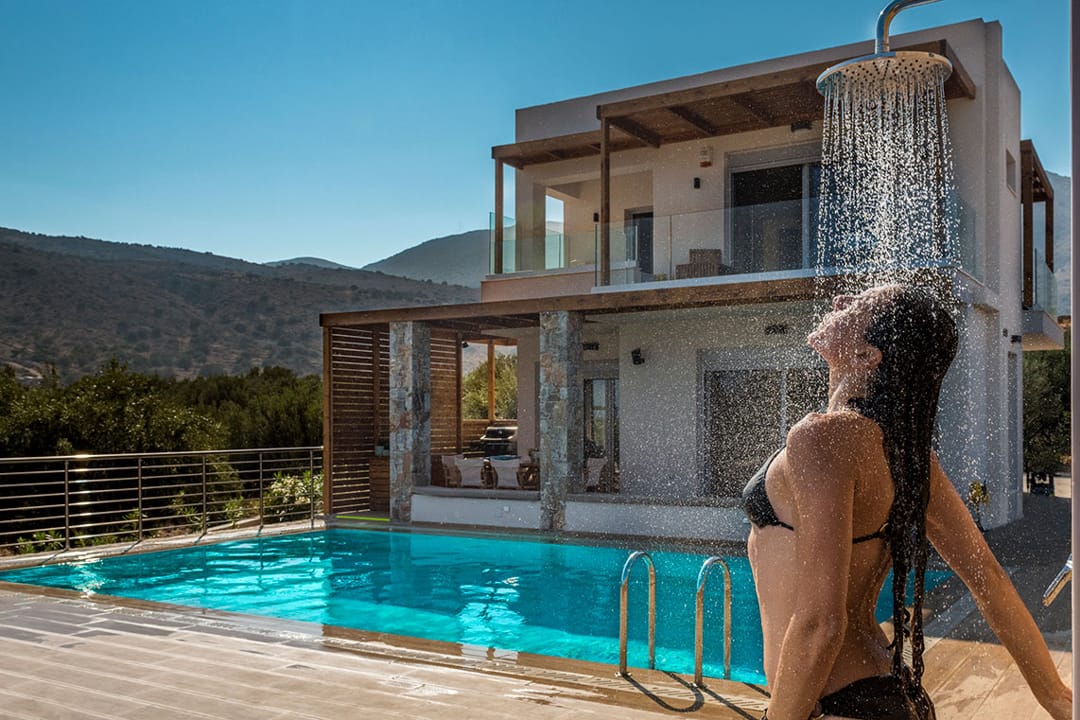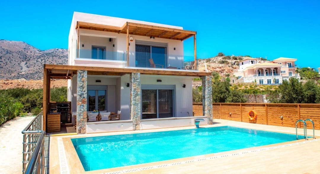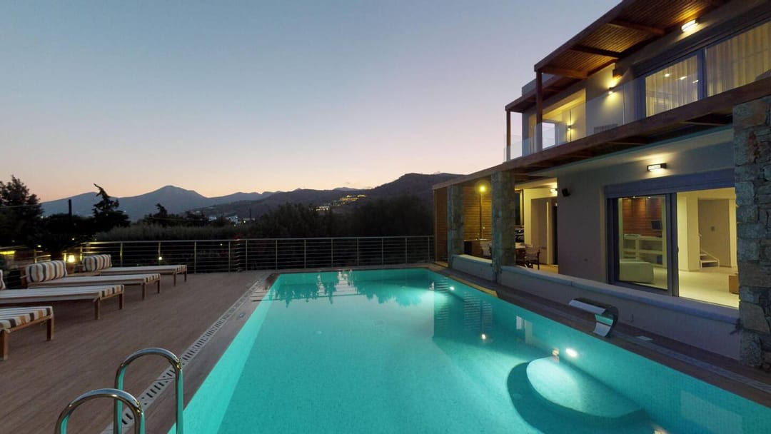 The unique Spa Villa Ikaros with 2 bedrooms, outdoor and indoor pools, and views of Mirabello Bay, located in Plaka, Elounda, the most fashionable area of the island of Crete, for rent.