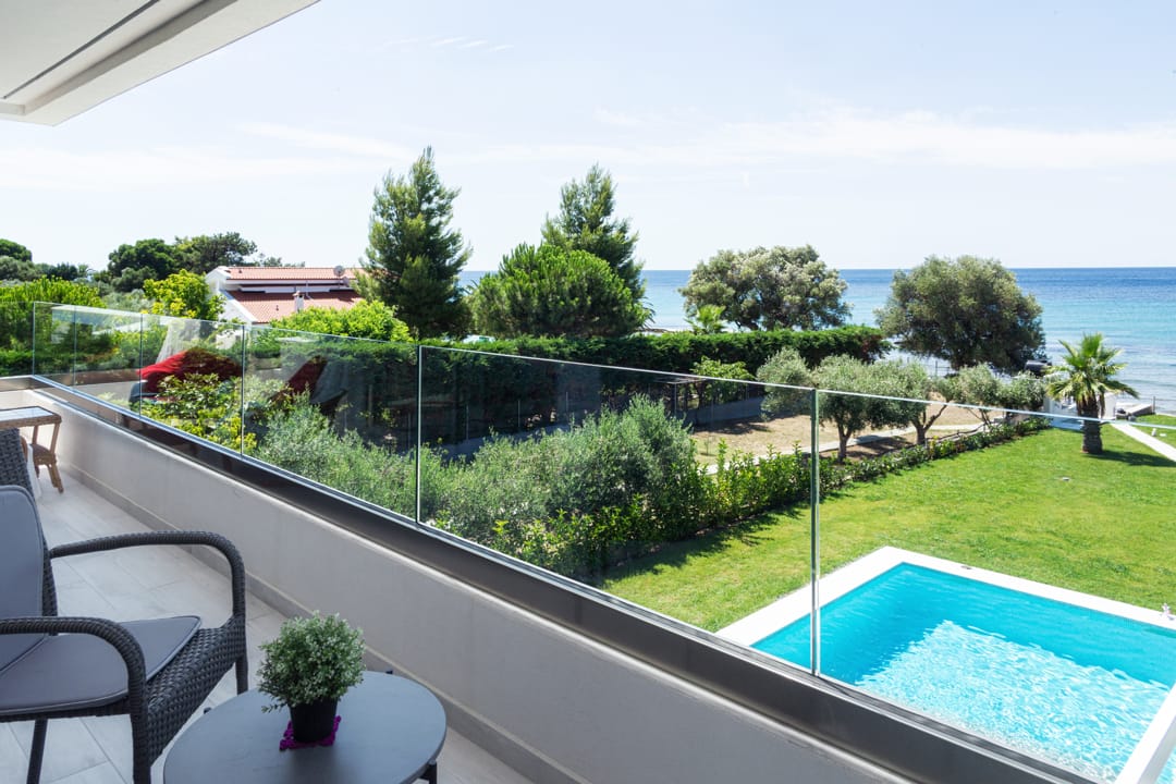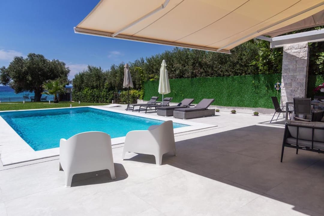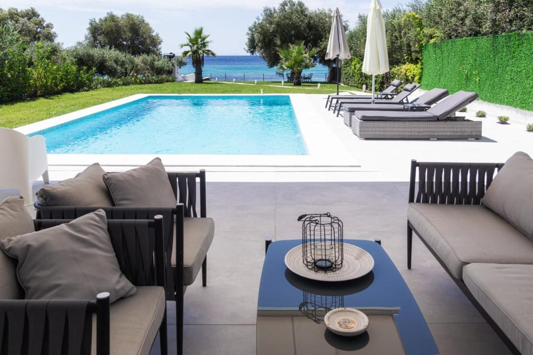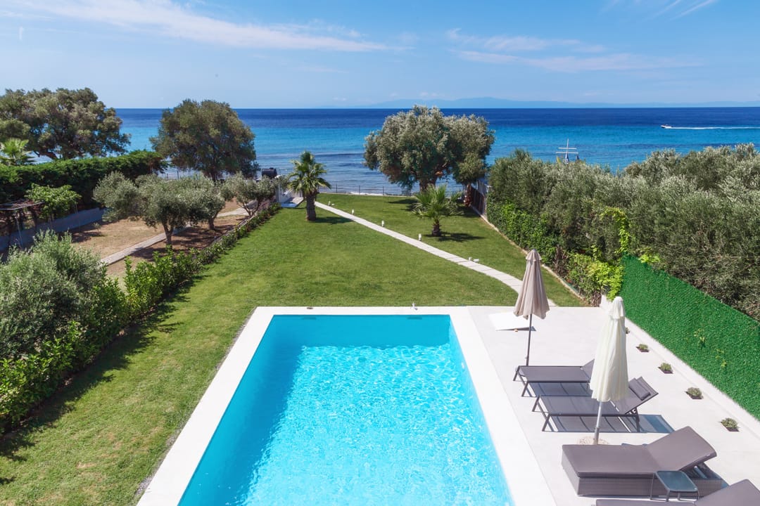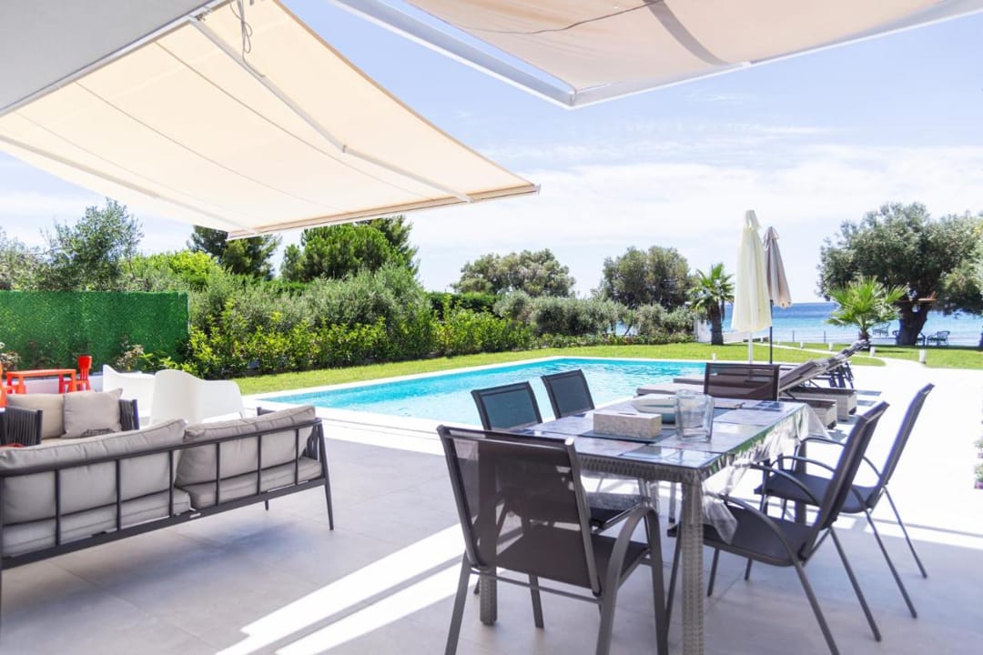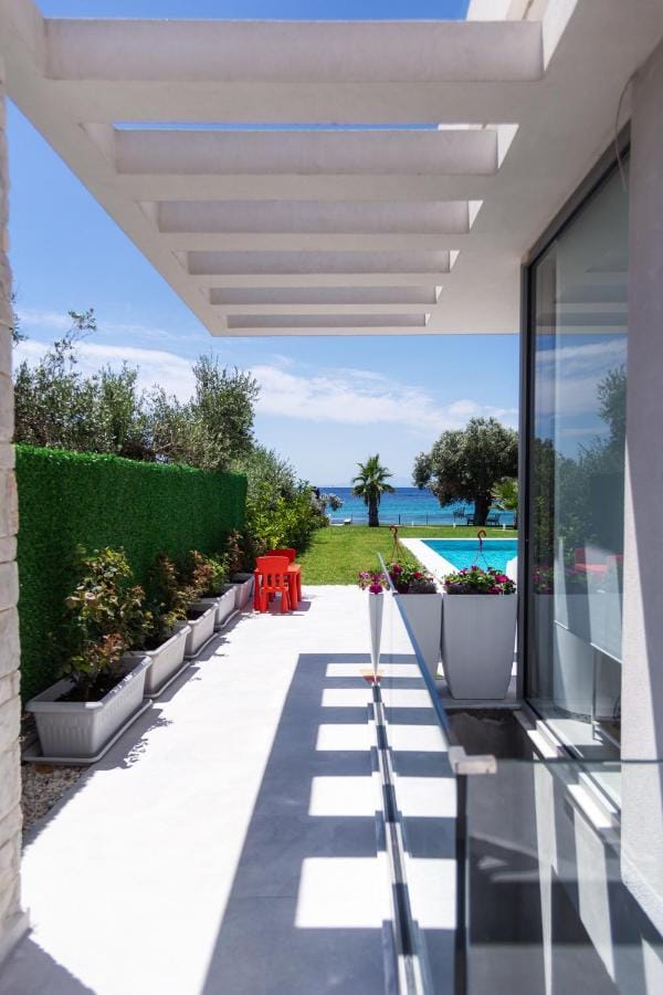 A new beachfront villa Inga with 3 bedrooms, a private pool, and direct access to the sea, near the village of Nea Skioni, on the Kassandra peninsula, Halkidiki, for rent.