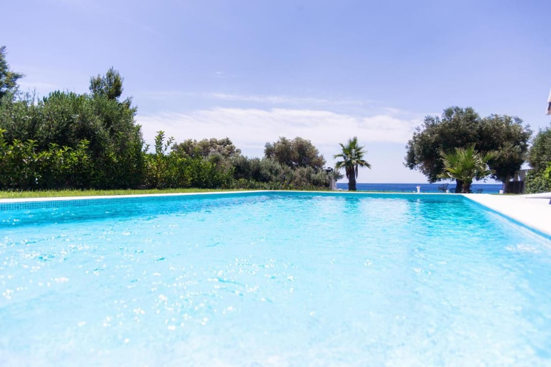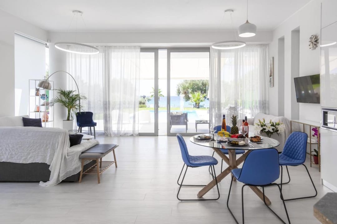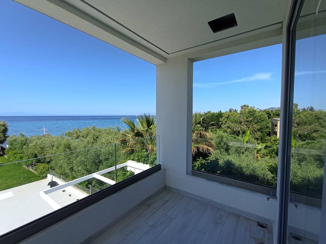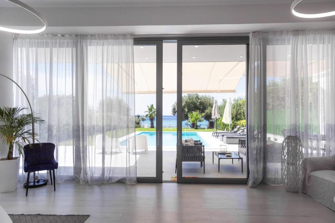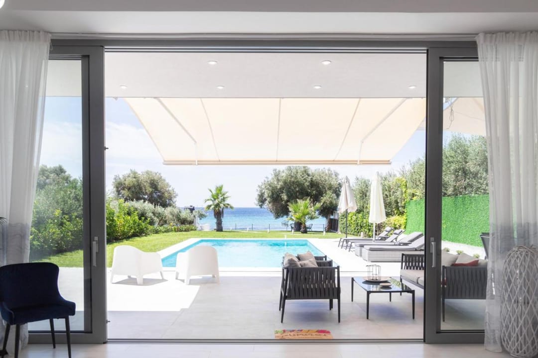 A new beachfront villa Inga with 3 bedrooms, a private pool, and direct access to the sea, near the village of Nea Skioni, on the Kassandra peninsula, Halkidiki, for rent.