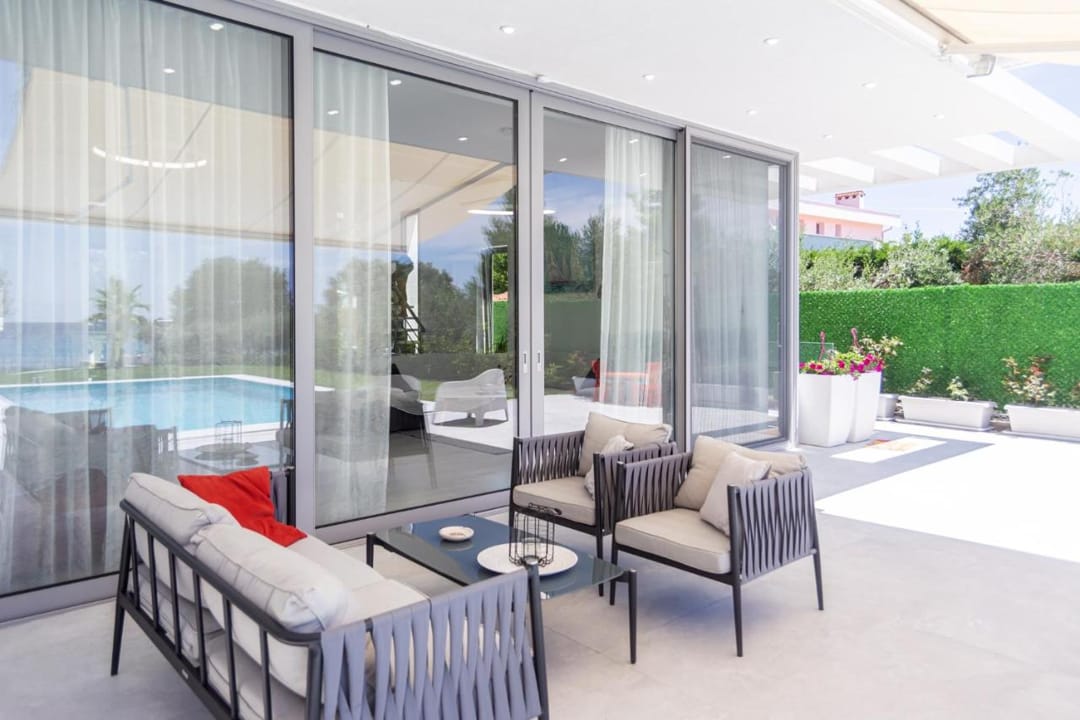 - Spacious living room with direct access to the pool and garden