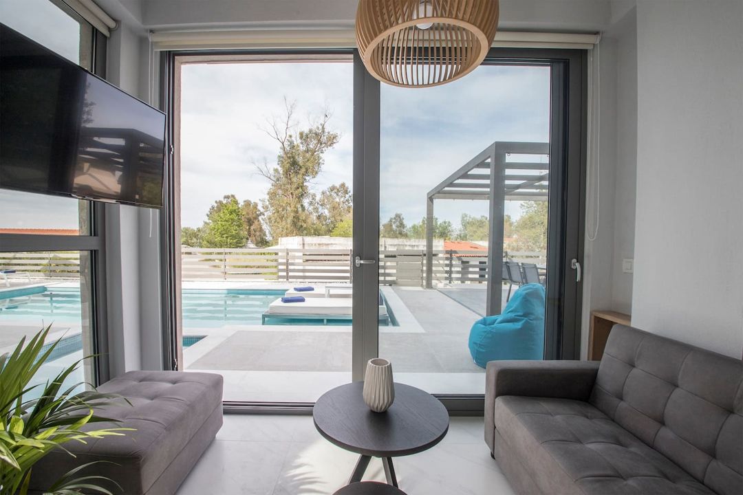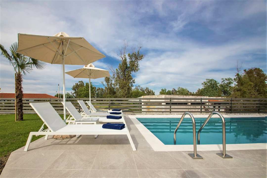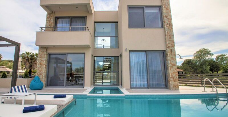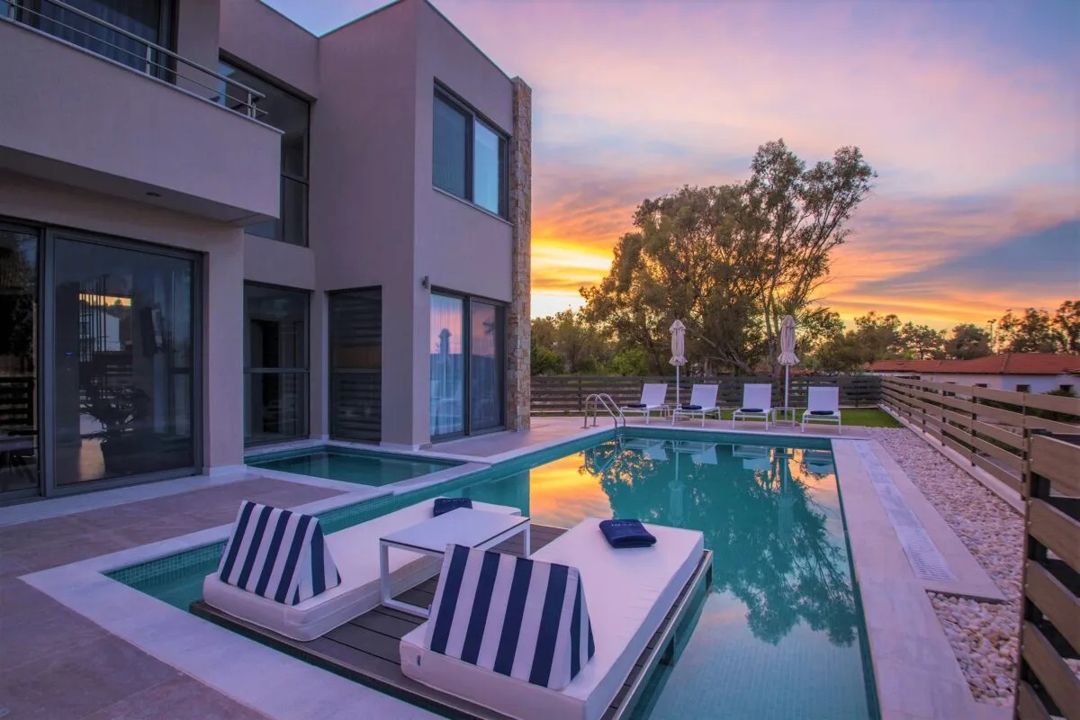 Modern luxury Itara Villa with 3 bedrooms, private pool, and Jacuzzi, just 200 meters from the sandy beach, in Pefkohori Village, Kassandra, Halkidiki for rent.